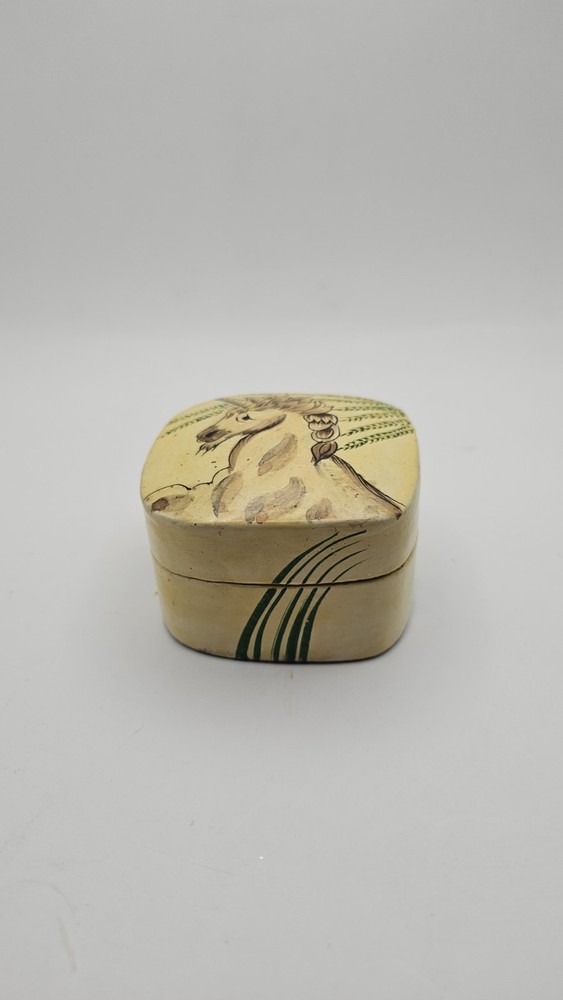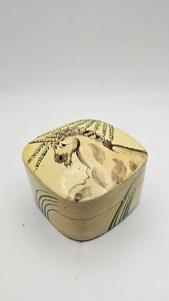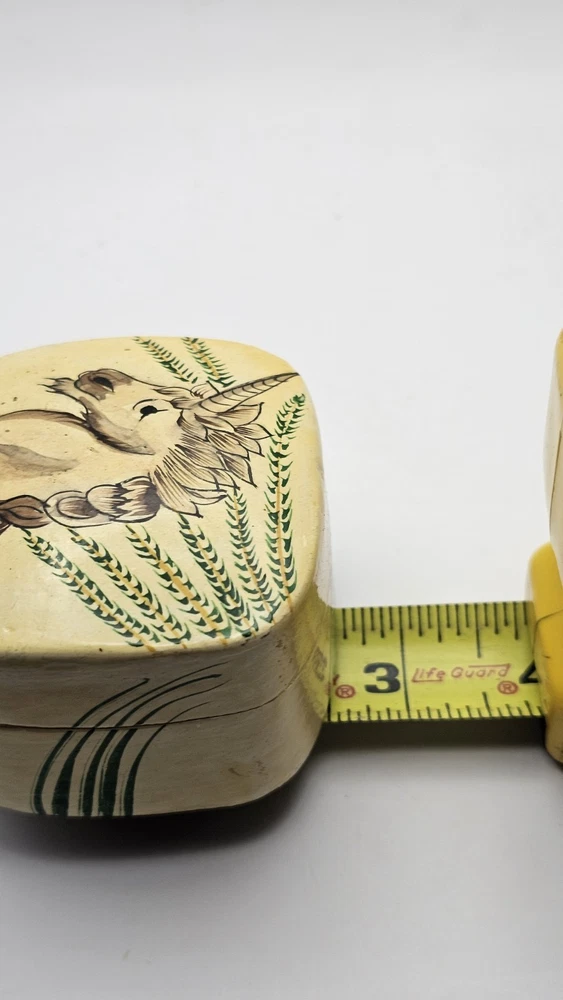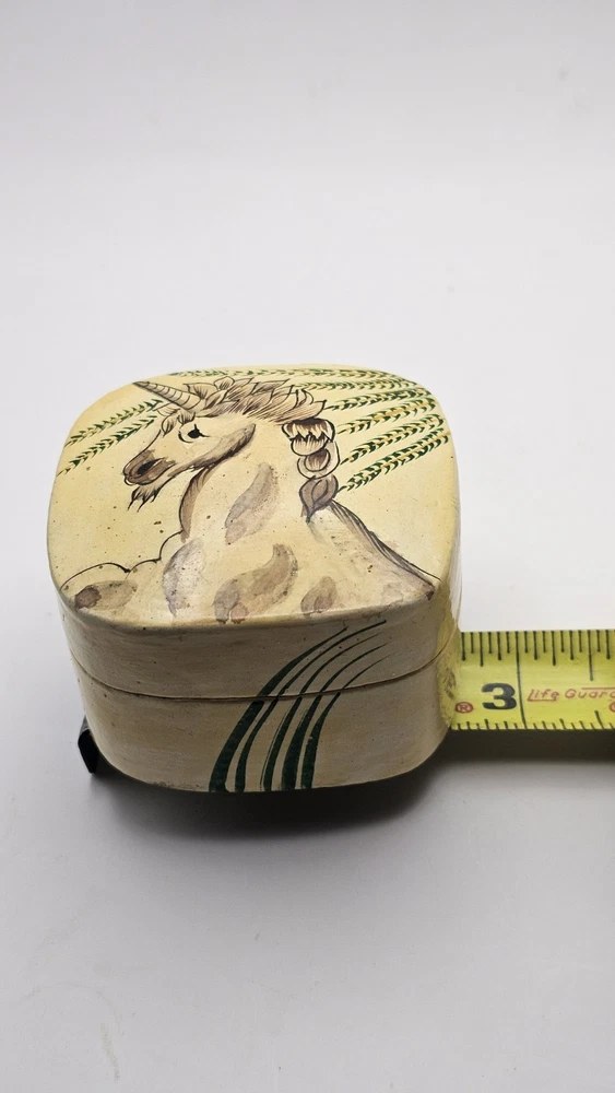Material: Wood Type: Trinket Box Shape: Square Suitable For: Furniture Original/Reproduction: Original Pattern: Unicorn Closure Type: Press Fastening Subject: Boxing Number in Pack: 1 Handmade: Yes Theme: Art Department: Adults, Teens Country/Region of Manufacture: India Collection: Unicorn Time Period Manufactured: 1980-1989 Color: Multicolor Size: Small Room: Bedroom, Dining Room Occasion: All Occasions Customized: No Brand: Kashmir Care Instructions: Easy Care Finish: Painted Packaging: Unboxed Style: 1980s Item Length: approximately 2 1/2" Features: Retired, Unboxed Character: Unicorn