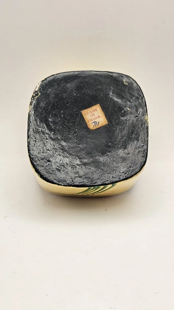 This product is a small hand-made wooden trinket box featuring a unique unicorn pattern and design in ivory and black colors. The square-shaped box is perfect for storing small items or jewelry, making it suitable for all occasions. The 1980s style collection from Kashmir India adds a touch of magic to any bedroom or dining room decor. This special piece is sure to delight teens and adults alike with its unicorn subject and hand-painted finish.