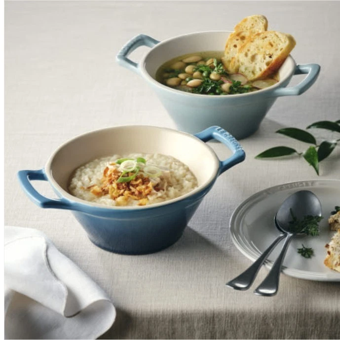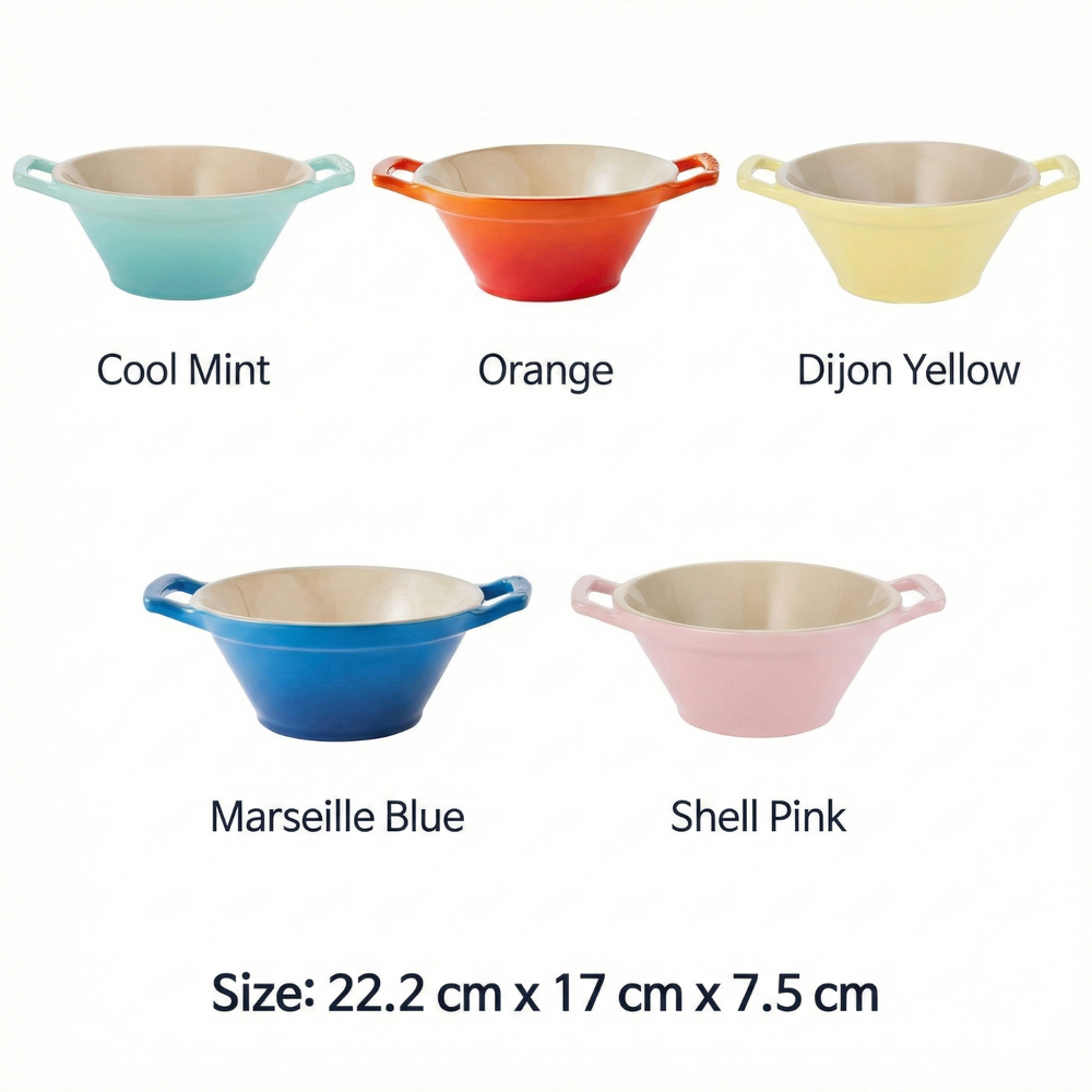 Product Description Elevate your kitchen collection with this Rare Le Creuset Stoneware Cassoulet Serving Bowl . Known for its exceptional durability and timeless design, this versatile bowl is perfect for serving everything from hearty stews and casseroles to noodles, pasta, and salads. Featuring convenient dual handles, it offers both elegant presentation and practical ease of use from oven to table. Key Features Premium Stoneware: Crafted for daily use, providing excellent heat distribution for even cooking and superior heat retention to keep food warm at the table. Versatile Design: The wide, deep silhouette with sturdy handles makes it an ideal "all-in-one" dish for baking, serving, and dining. Vibrant Color Palette: Available in iconic Le Creuset shades including Cool Mint, Orange, Dijon Yellow, Marseille Blue, and Shell Pink. Exceptional Durability: The high-quality glaze is resistant to scratches, stains, and odors, ensuring it stays beautiful for years to come. Product Specifications Dimensions: 22.2 cm x 17 cm x 7.5 cm Temperature Resistance: Safe from -20°C to 260°C Compatibility: Safe for Microwave, Oven, and Freezer use. Important: NOT suitable for Induction or Direct Heat (stovetop). Important Note on Handmade Quality All Le Creuset stoneware products are meticulously handmade . Due to the artisanal manufacturing process, minor variations such as bubble formations, pinholes, small protrusions, or slight color/thickness variations may occur. These are not defects but rather unique characteristics that testify to the authentic, handmade nature of the product. Customs and duties: For buyers in the United States: Import duties and taxes are included in the item price or shipping cost. Items shipped to the U.S. are sent under the Delivered Duty Paid (DDP) method, which means all import-related charges are prepaid. You don’t need to pay any additional fees when your order arrives. For buyers outside the United States: Import duties, taxes, and charges are not included in the item price or shipping cost. These charges are the buyer’s responsibility.