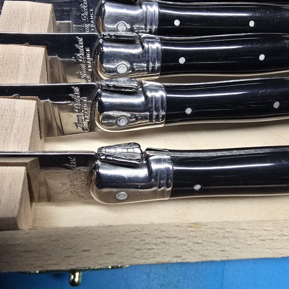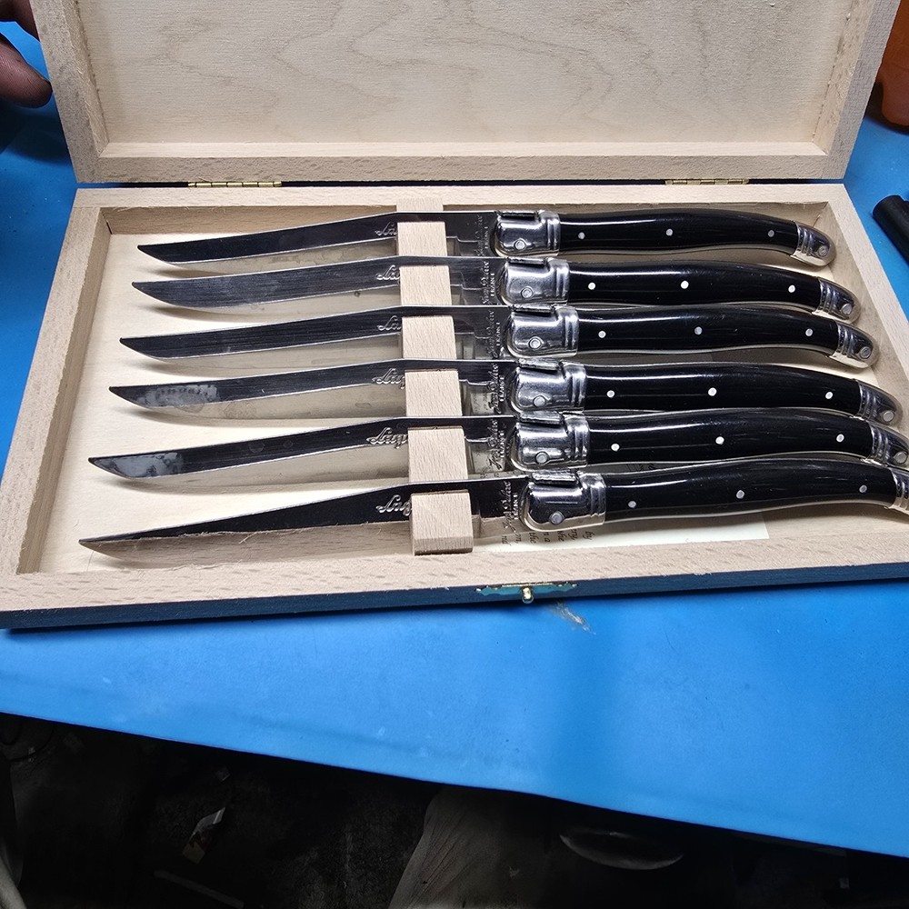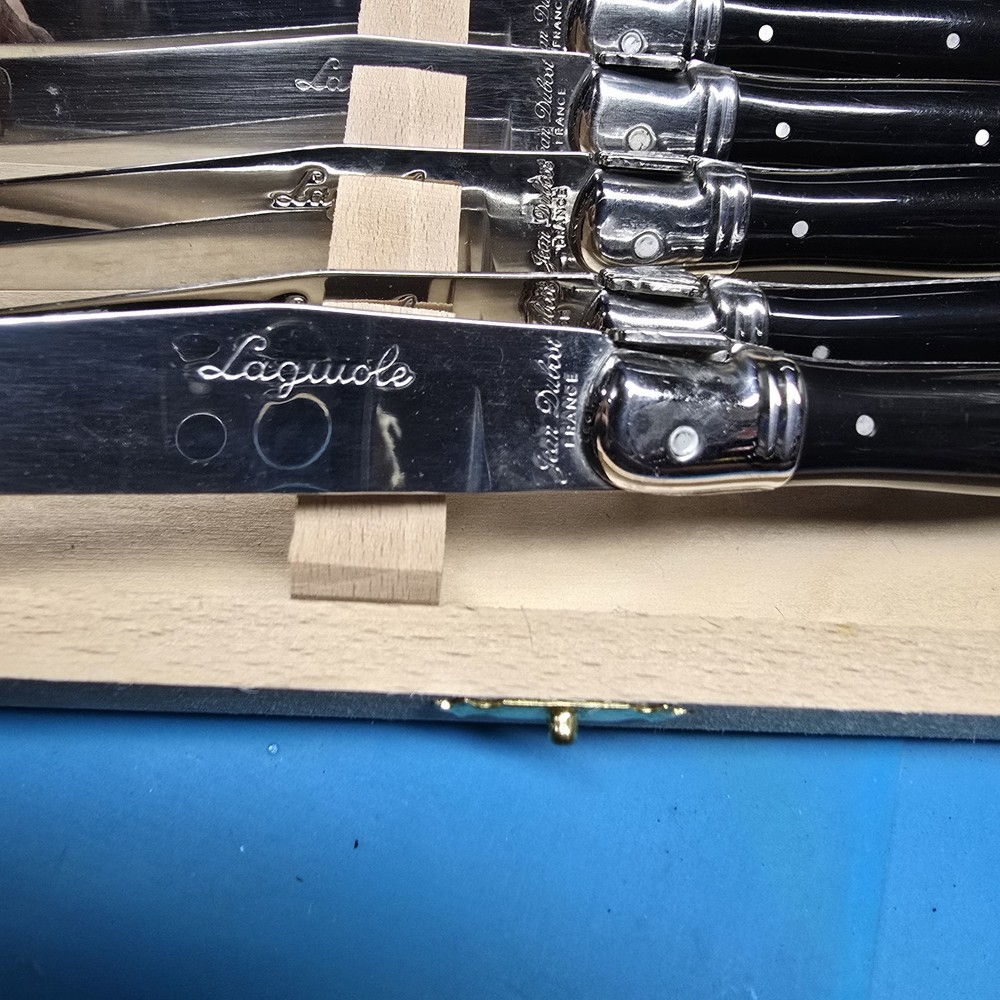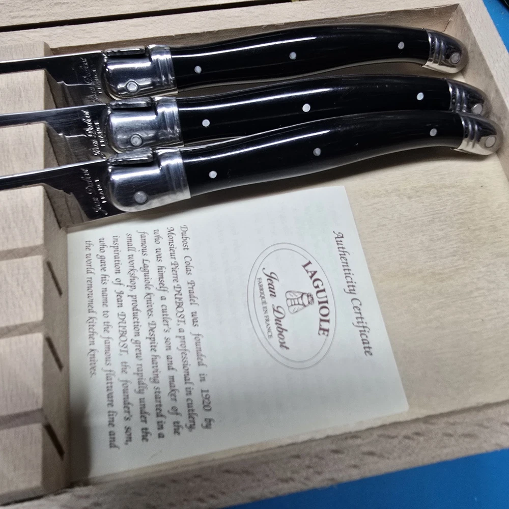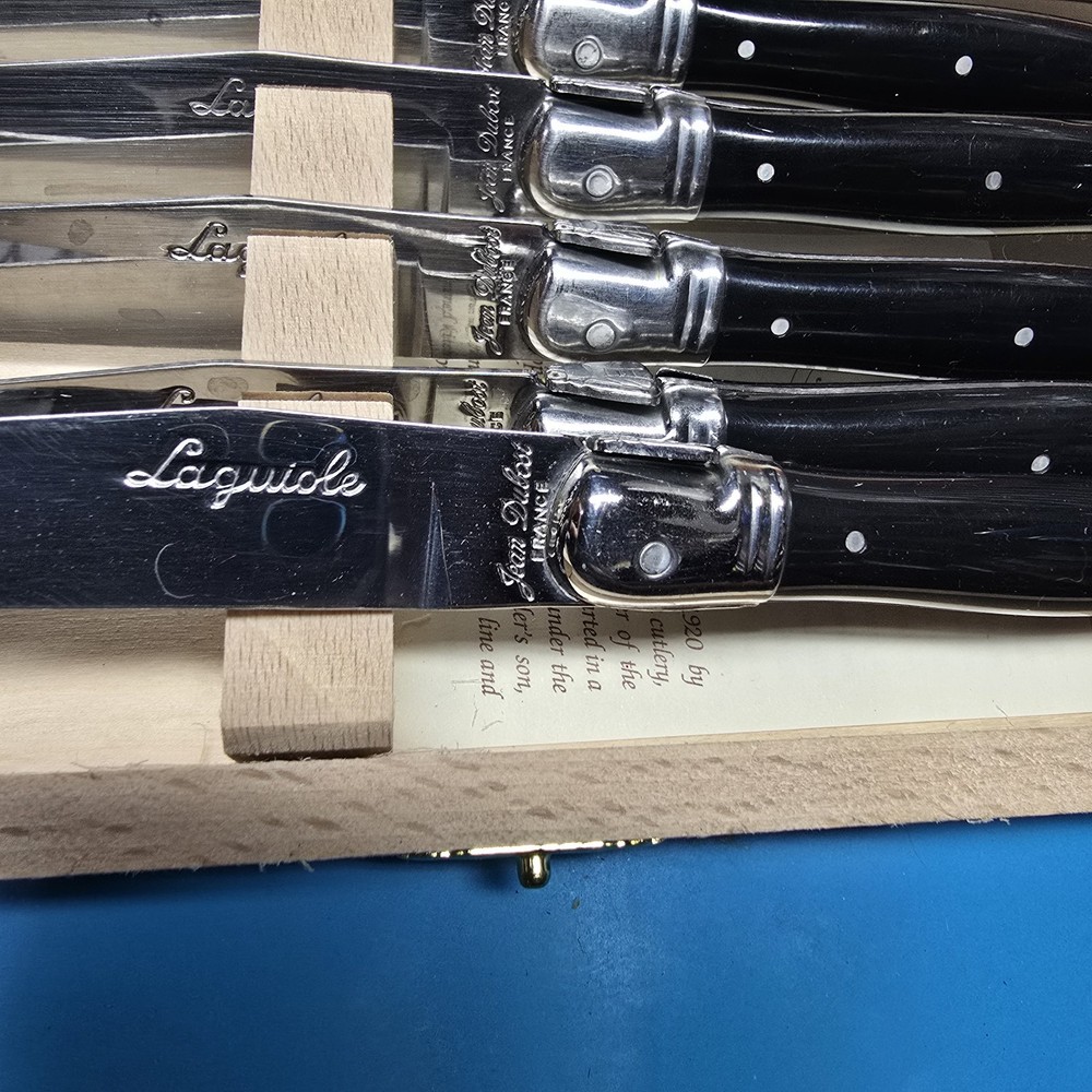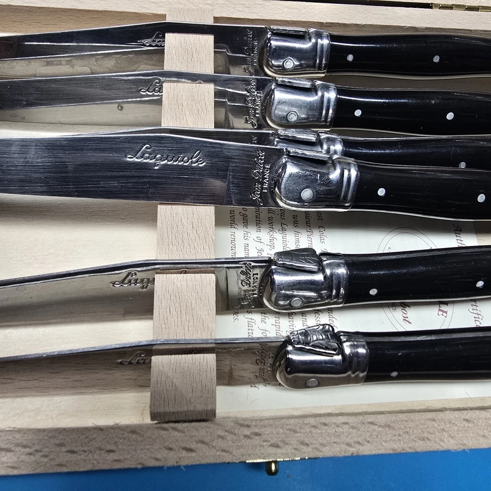 Experience the elegance and precision of French craftsmanship with this rare set of Laguiole steak knives. Each serrated blade is crafted from high-quality stainless steel, promising durability and a sharp, clean cut every time. The set includes six knives, making it ideal for serving family and friends, or for adding a touch of sophistication to your dining collection. Designed with both form and function in mind, these dishwasher-safe knives are not only stylish but also practical for everyday use. Their ergonomic handles ensure a comfortable grip, allowing for effortless slicing and dicing of meats. This exquisite set is a testament to Laguiole's legacy of excellence and a must-have for any culinary enthusiast. I have two sets and they are 370 a piece