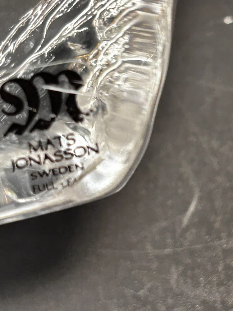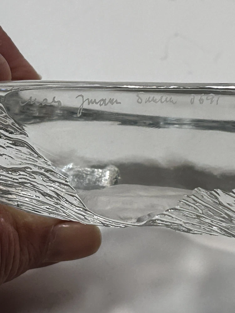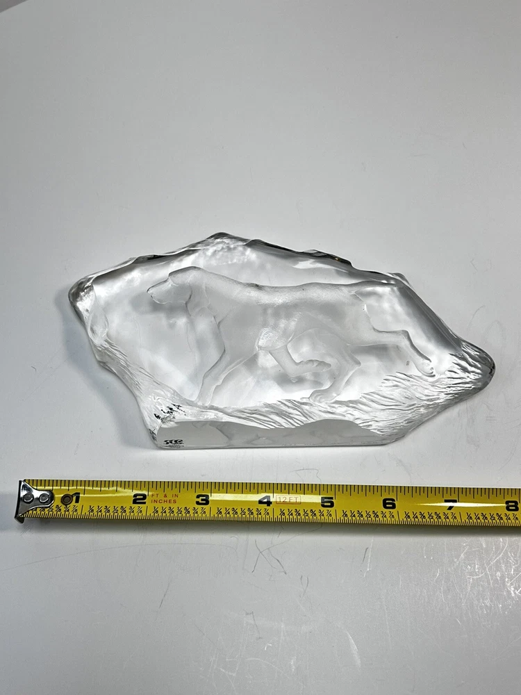This rare Mats Jonasson Crystal Paperweight features an engraving of a hunting dog, showcasing the intricate artistry of the renowned artist. Handmade in Sweden, this exquisite piece is crafted from clear crystal, highlighting the fine details of the design. Signed by the artist, this paperweight is a collectors' item that adds elegance and sophistication to any space.