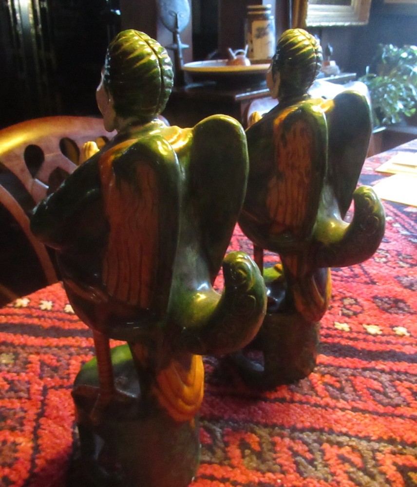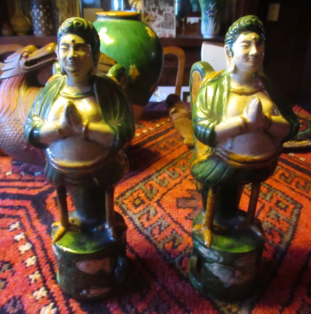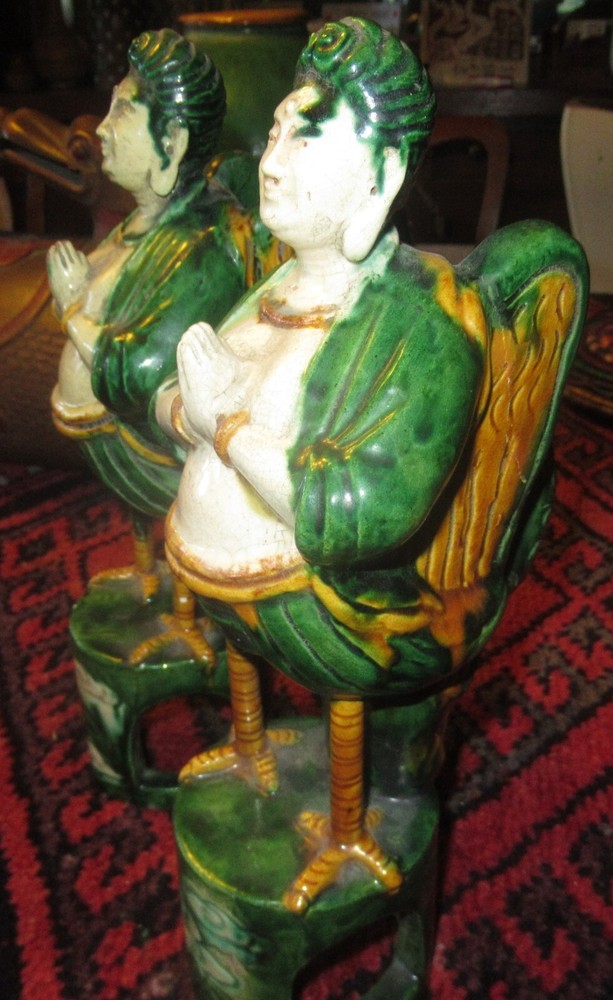 This pair of EXTREMELY rare Chinese Ming burial figures depict Buddhist Karyobinga, featuring vibrant sancai colors typical of the Ming Dynasty. The statues stand at a height of 12 inches and originate from China before the year 1644. Crafted from Sancai Pottery, these antique original figurines showcase intricate details and are believed to have been used in burial rituals during the Ming Dynasty. The Buddhist theme and historical significance make these figures a valuable piece of Asian antiquity. Each 12" high.
