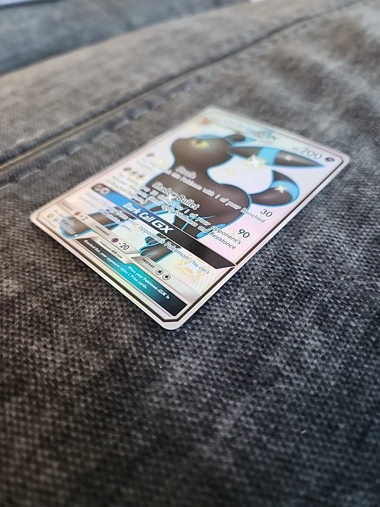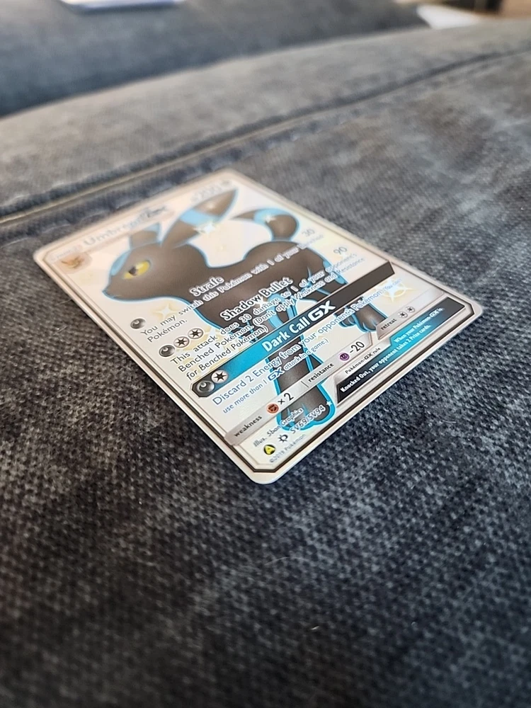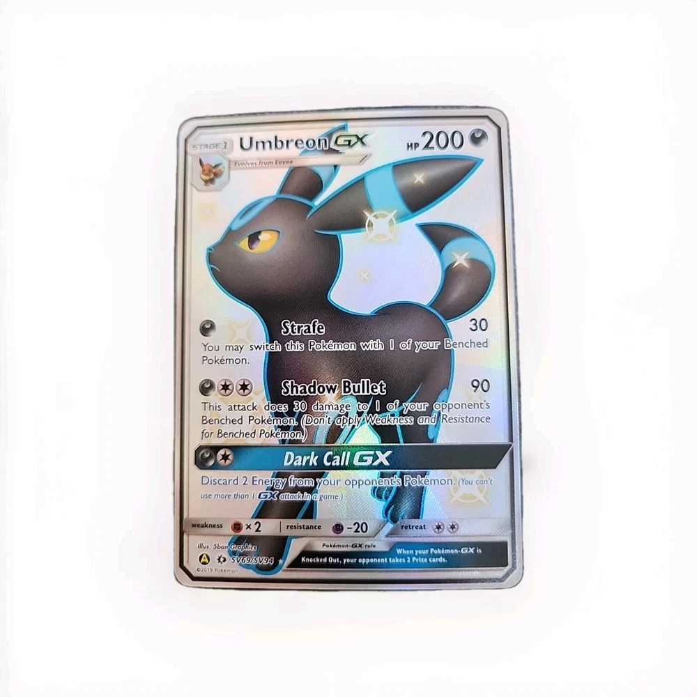 Elevate your Pokémon TCG collection with the elusive Umbreon GX from the Hidden Fates Shiny Vault. Card number SV69/SV94 features a stunning holo finish that captures the darkness and allure of this fan-favorite character. This ultra rare card is a must-have for both serious collectors and those who appreciate the artistry of Pokémon cards. The card is in English and produced by Nintendo, ensuring authentic quality and gameplay integrity. As a GX card, it offers a strategic edge in battle, making it a valuable addition to any deck or display. Don't miss the chance to own a piece of the Hidden Fates set, renowned for its exciting speciality cards.