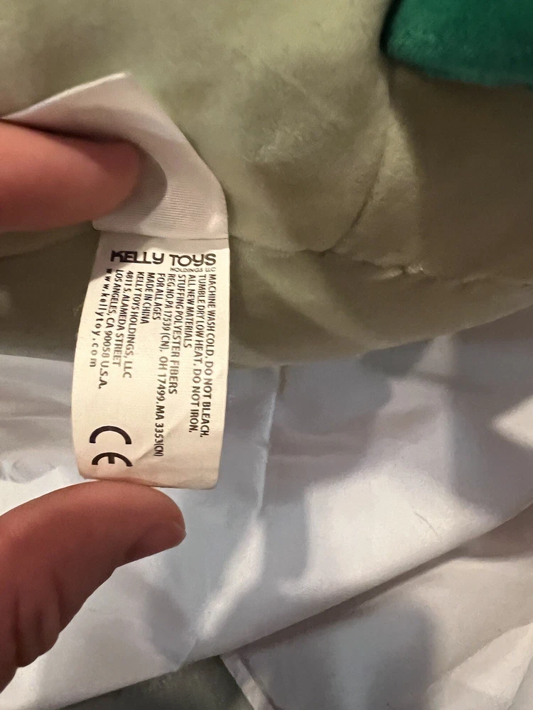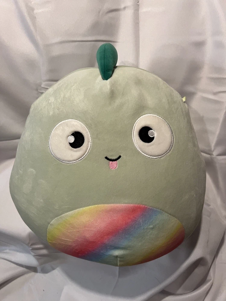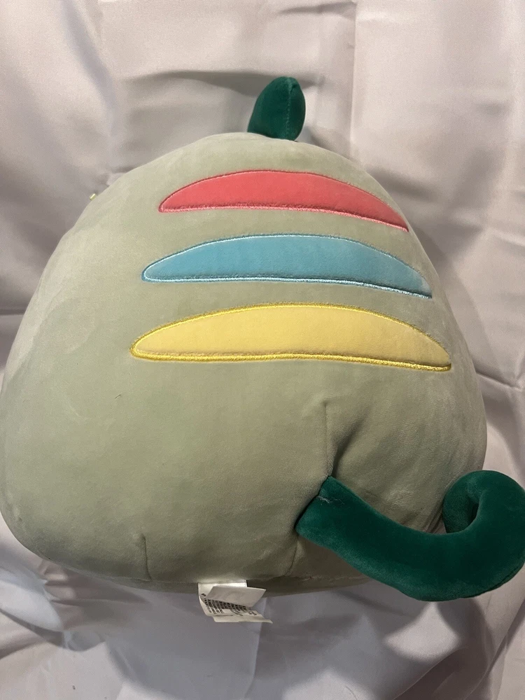This adorable 12-inch Kellytoy Squishmallow plush toy features Kent the Iguana/Lizard in a beautiful green color with rainbow accents. Made with washable materials, this toy is suitable for all ages and is perfect for anyone who loves stuffed animals. The Squishmallow is from the Character Family of Squishmallows and has a recommended age range of all ages. The toy was made in China in the year 2020 and is a Type of Chameleon. The plush is in used condition but has been well-maintained and is ready for its new home.