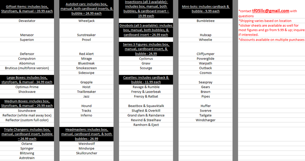 Listing Info: Discounts are available if you purchase multiple items at once; contact me BEFORE making your purchase. I have lots of custom boxes, manuals, stickers, etc. available for G1 figures; see the rightmost image for a list of them. Item details: Amazing quality custom G1 items; good for resealing your items to display them, increase their value, or get them graded! Look so much like the vintage ones that it is almost impossible to tell them apart! All boxes/inserts are glossy & made of thick card stock, bubbles are made of strong plastic, and manuals use sturdy paper products with ink that will not smudge! This listing includes everything shown in the pics above! Shipping: All items ship from the US; so you get them fast, don't have to worry about customs, or them arriving with crushed boxes, etc. US sales are shipped out via Priority Mail (2-3 business day delivery time) & include tracking. International Sales are shipped out via Ebay's international shipping services. Returns & Terms: Returns are accepted within 2 weeks. If there are any issues with your item(s), please reach out to me before contacting Ebay. By bidding on this listing, you agree to the terms listed & have read this auction fully.