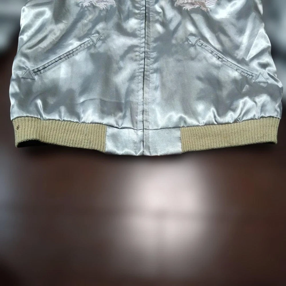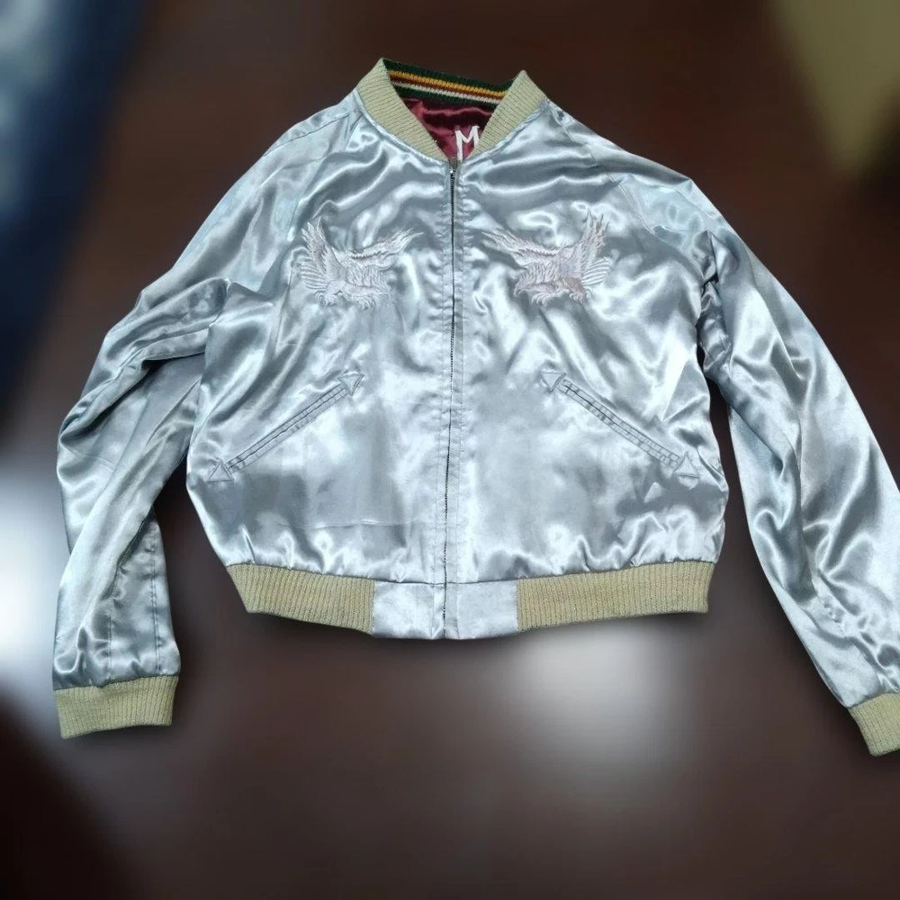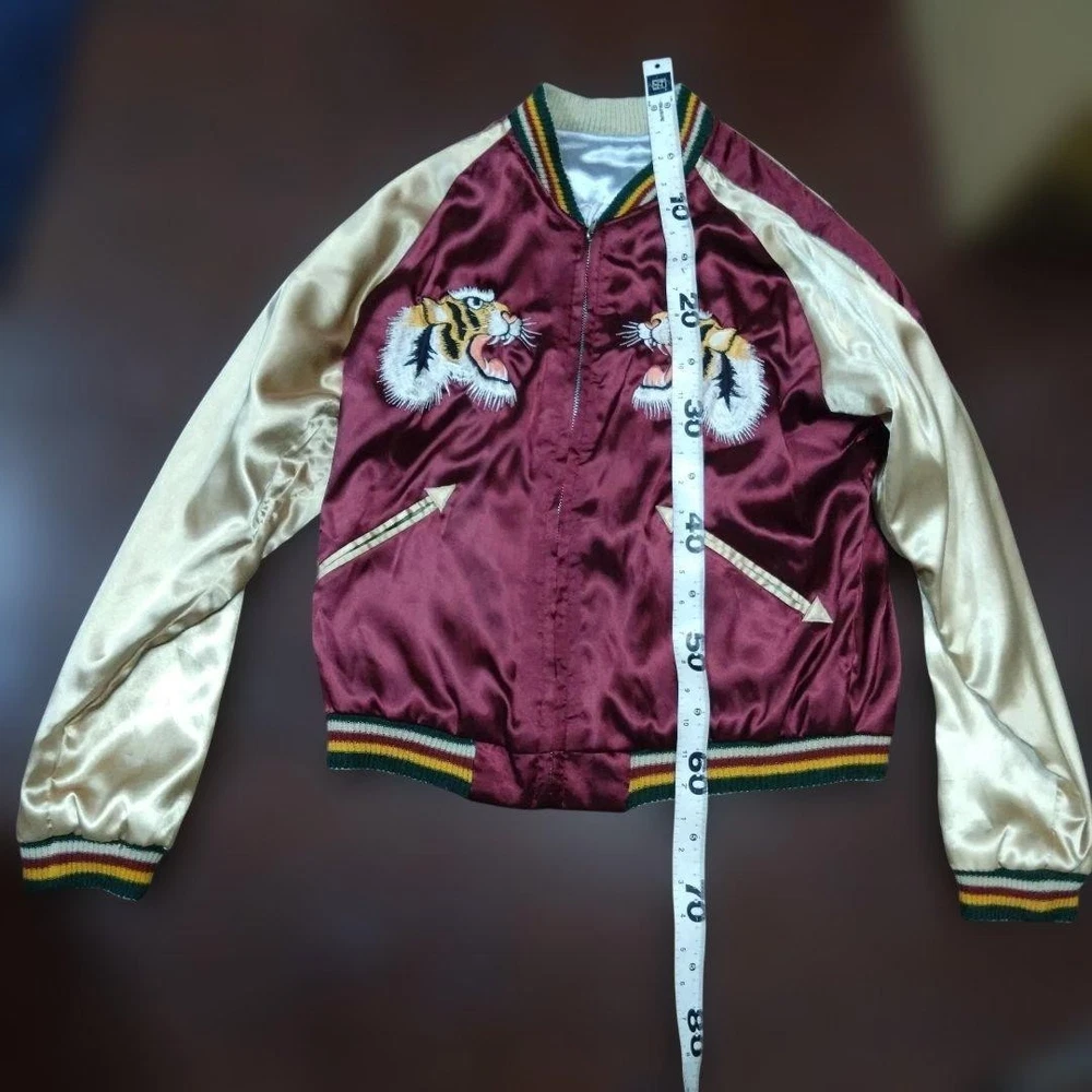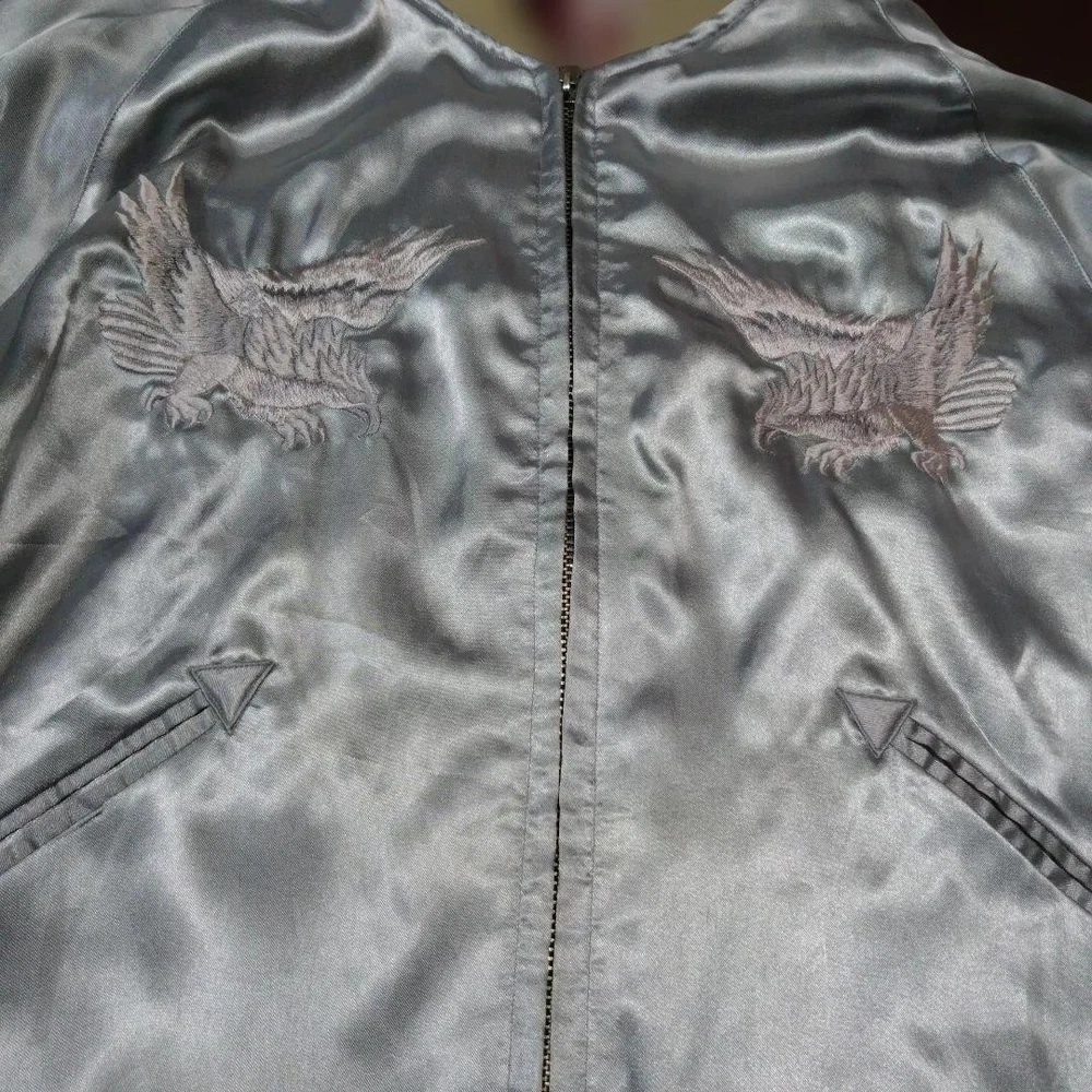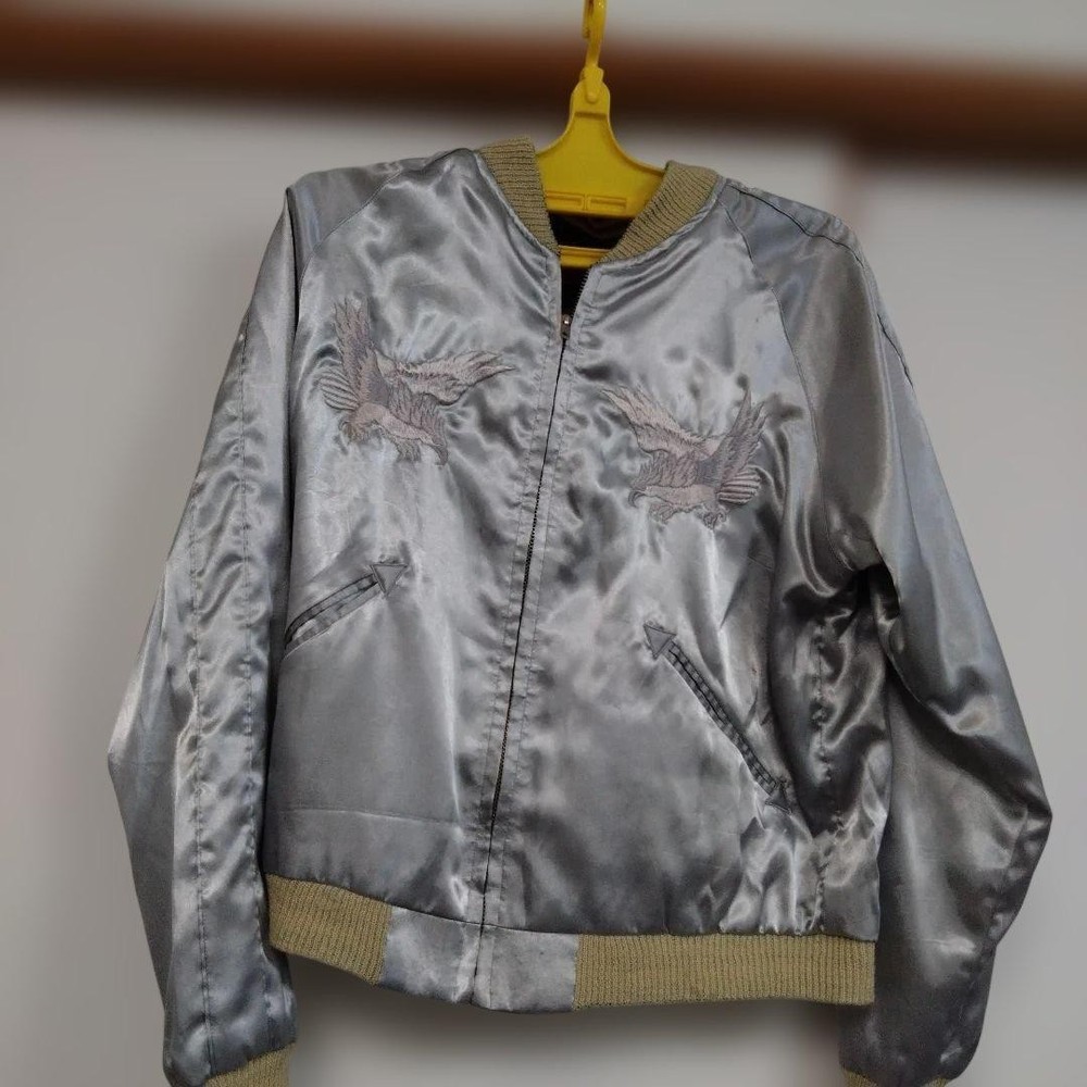Rare Tailor Toyo Enterprises Sukajan TT1283 M size! Key Features Vintage Toyo Enterprises reversible Sukajan jacket featuring a striking silver eagle design. The jacket has a unique, rare pattern in red and silver tones, with some embroidery fraying and minor holes in the ribbed cuffs and one other area, all visible in the photos. Despite signs of wear, it remains wearable and stylish. Size is approximately M; suitable for someone around 167cm tall with a slightly plump build. Overall, a vintage piece with character, perfect for collectors or casual wear. Please review all images for details. Item Specifics: Brand: Toyo Enterprises Type: Sukajan (Souvenir Jacket) Model: TT1283 Color: Red, Silver Material: Not specified Size: M (fits similar to size M) Condition: Used, with embroidery fraying, minor holes in ribbed areas, and signs of age. Specifications Brand TOYO ENTERPRISE Country Japan Department Men Size M Size Type Regular Style Sukajan Type Jacket Product Description 🌎 Shipping & Import Duties For U.S. Buyers: Shipped via DDP (Delivered Duty Paid) . All import duties and taxes are included in the listed price. No extra payment is required upon delivery. For Non-U.S. Buyers: Shipped via DDU (Delivered Duty Unpaid) . Import duties and taxes may apply and are the buyer’s responsibility. We ensure safe packing and smooth customs clearance for all destinations.
