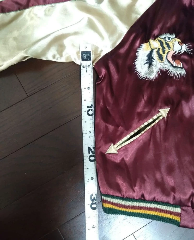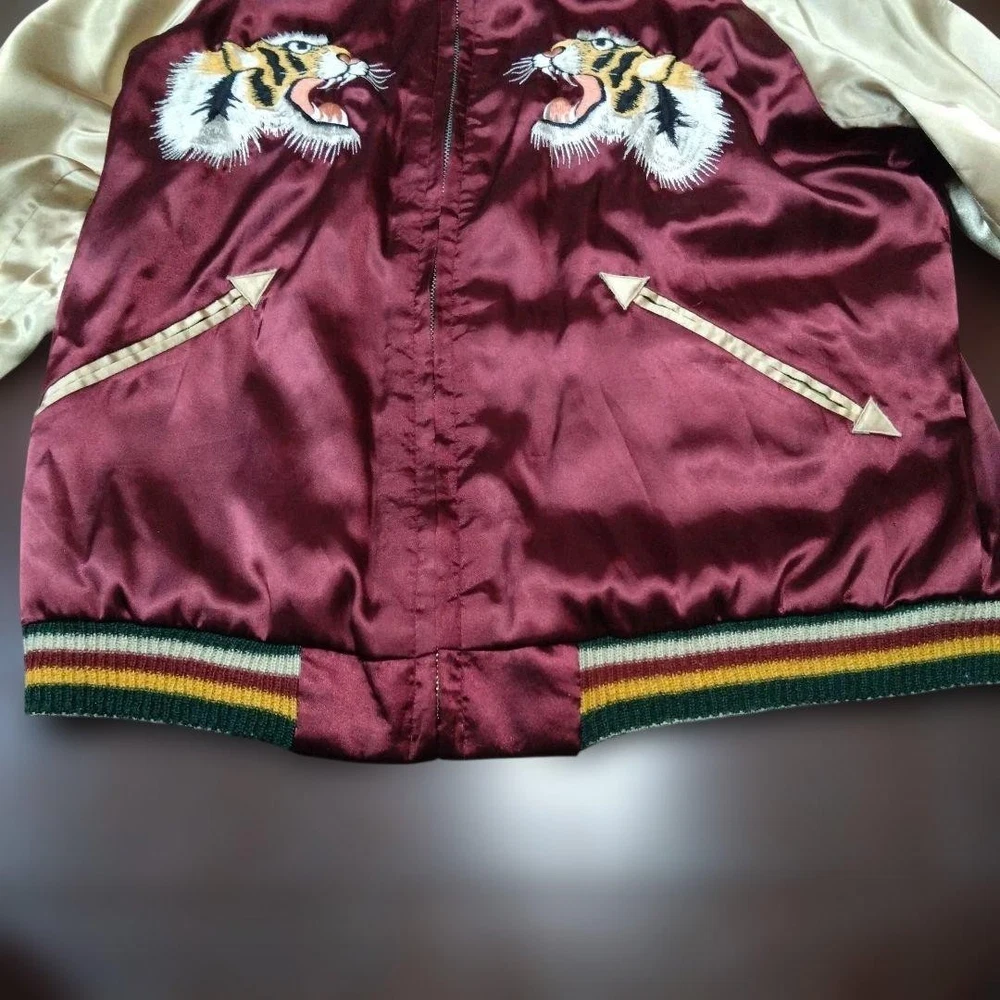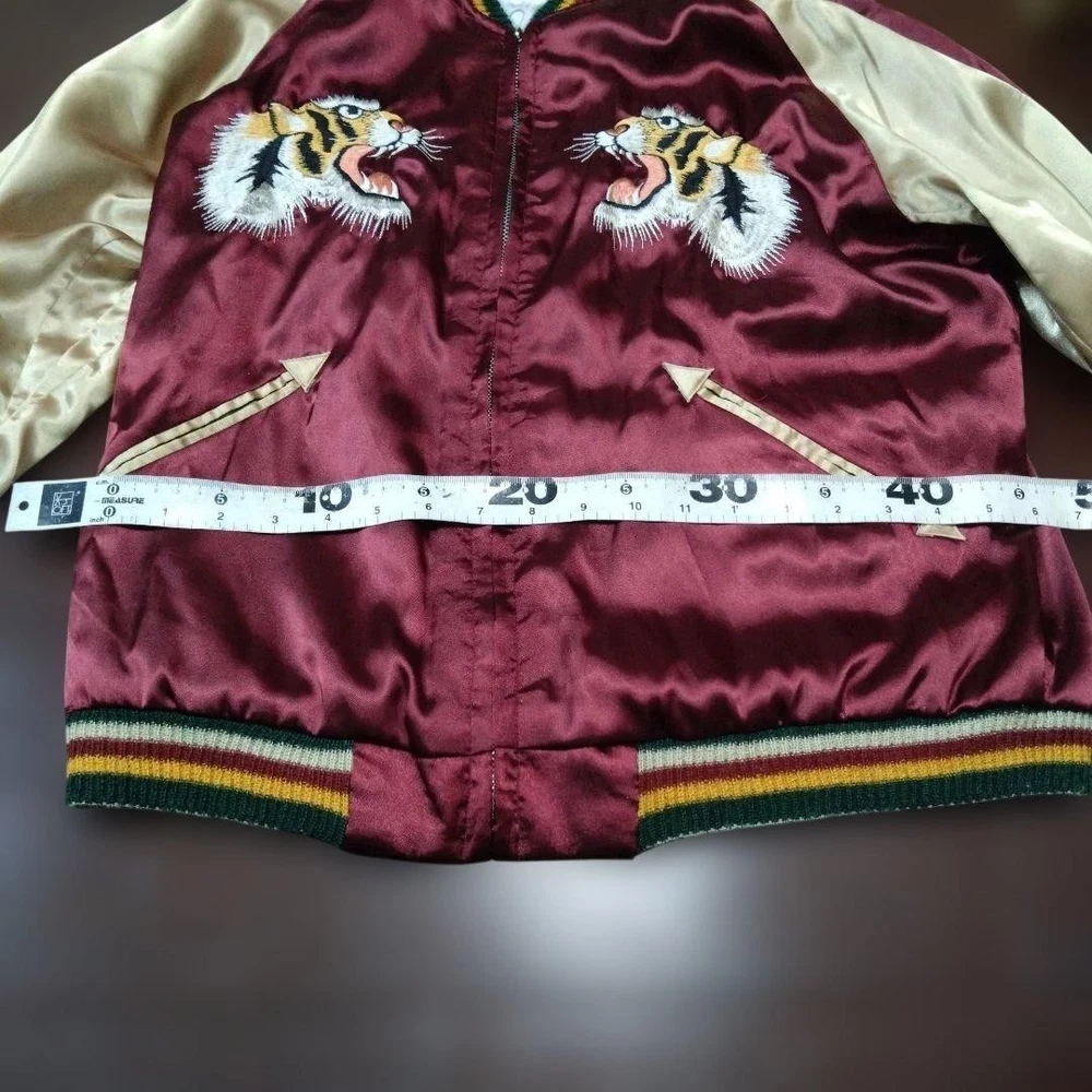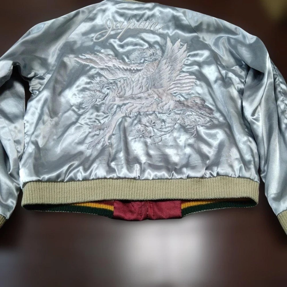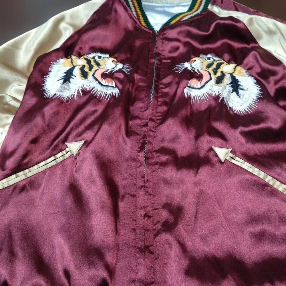 Rare Tailor Toyo Enterprises Sukajan TT1283 M size! Key Features Vintage Toyo Enterprises reversible Sukajan jacket featuring a striking silver eagle design. The jacket has a unique, rare pattern in red and silver tones, with some embroidery fraying and minor holes in the ribbed cuffs and one other area, all visible in the photos. Despite signs of wear, it remains wearable and stylish. Size is approximately M; suitable for someone around 167cm tall with a slightly plump build. Overall, a vintage piece with character, perfect for collectors or casual wear. Please review all images for details. Item Specifics: Brand: Toyo Enterprises Type: Sukajan (Souvenir Jacket) Model: TT1283 Color: Red, Silver Material: Not specified Size: M (fits similar to size M) Condition: Used, with embroidery fraying, minor holes in ribbed areas, and signs of age. Specifications Brand TOYO ENTERPRISE Country Japan Department Men Size M Size Type Regular Style Sukajan Type Jacket Product Description 🌎 Shipping & Import Duties For U.S. Buyers: Shipped via DDP (Delivered Duty Paid) . All import duties and taxes are included in the listed price. No extra payment is required upon delivery. For Non-U.S. Buyers: Shipped via DDU (Delivered Duty Unpaid) . Import duties and taxes may apply and are the buyer’s responsibility. We ensure safe packing and smooth customs clearance for all destinations.
