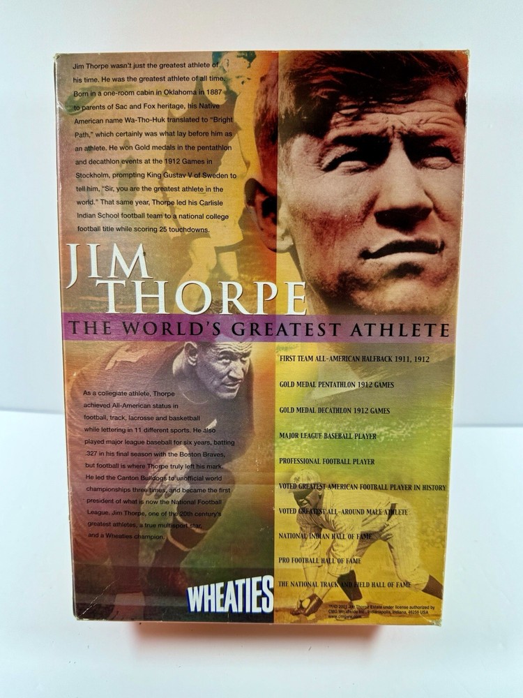 This rare 2001 Wheaties cereal box features Jim Thorpe, hailed as the World's Greatest Athlete. The box is in good condition, still unopened and sealed, making it a must-have for collectors of vintage sports memorabilia. Celebrate your love for football and add this unique item to your collection today. The box showcases Thorpe's impressive stats and achievements, making it a great conversation piece for any sports enthusiast. Don't miss out on this one-of-a-kind piece of history.