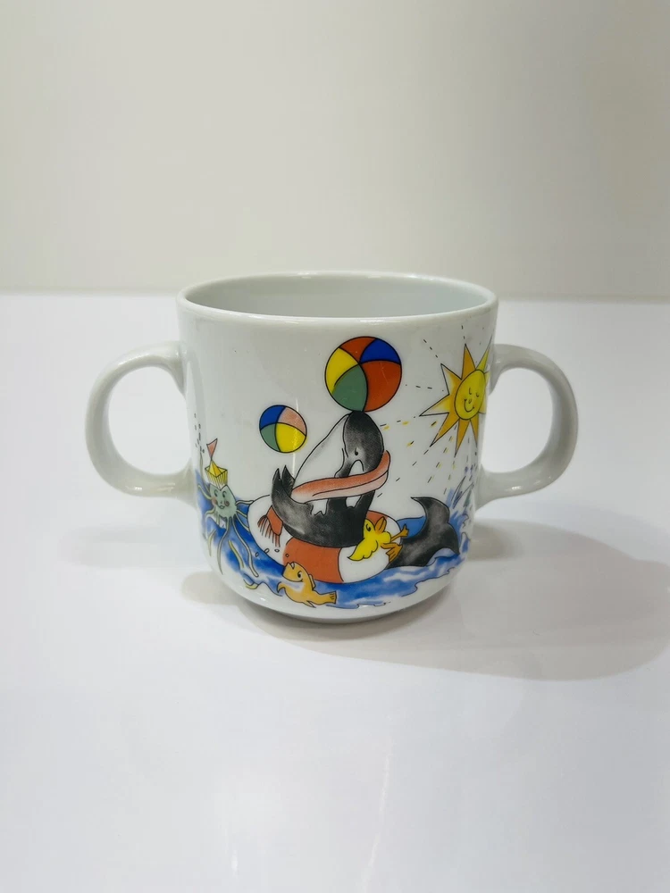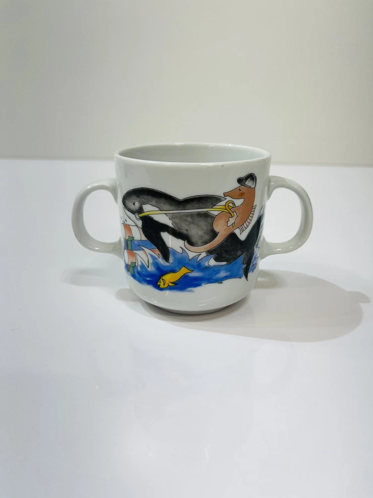 The unique sea life killer whale being ridden by a seahorse t wo handle Villeroy and Boch mug is designed by Gallow, it is in good condition with no chips and or cracks .