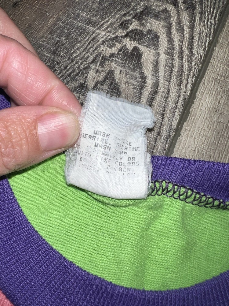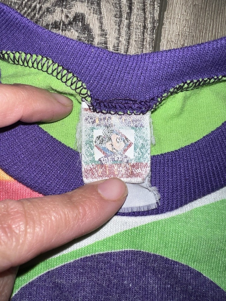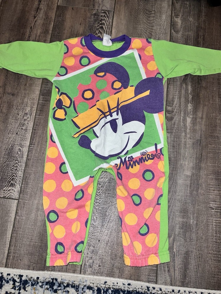 This rare vintage 1980 jogtog for Disney Minnie Mouse baby girl romper one piece in size 18 months is a charming addition to any little one's wardrobe. The green and pink colors and classic Minnie Mouse character make it a cute and playful choice for casual occasions in the summer or spring. Made from a soft cotton polyester blend, this pullover romper is easy to care for with machine washable, making it a convenient and stylish option for parents. Please look at the condition. This is going to be from the 1980s. The tag has been washed and worn. There is no size listed, but based on measurements is believed to fit 18 months best. This is sold as is