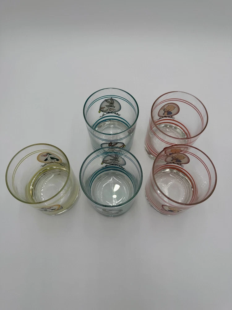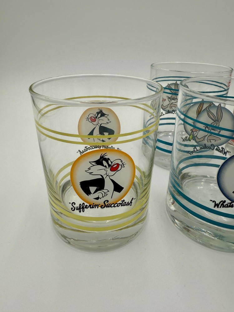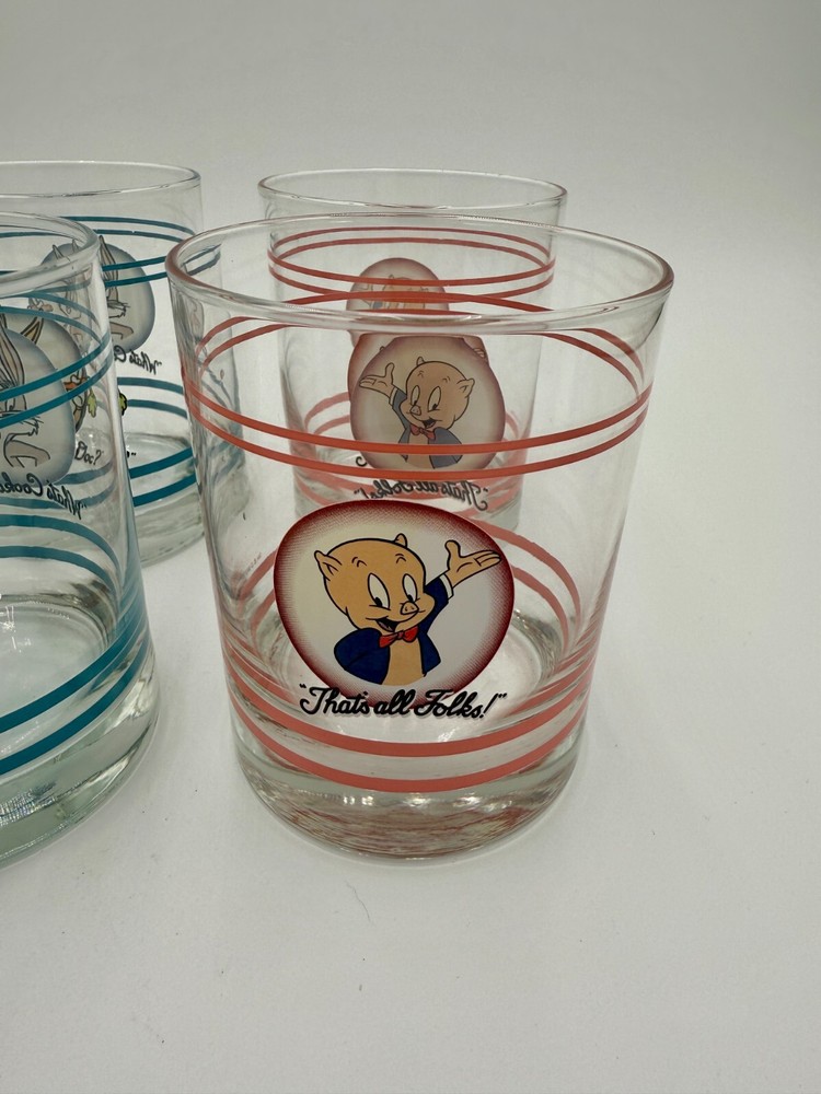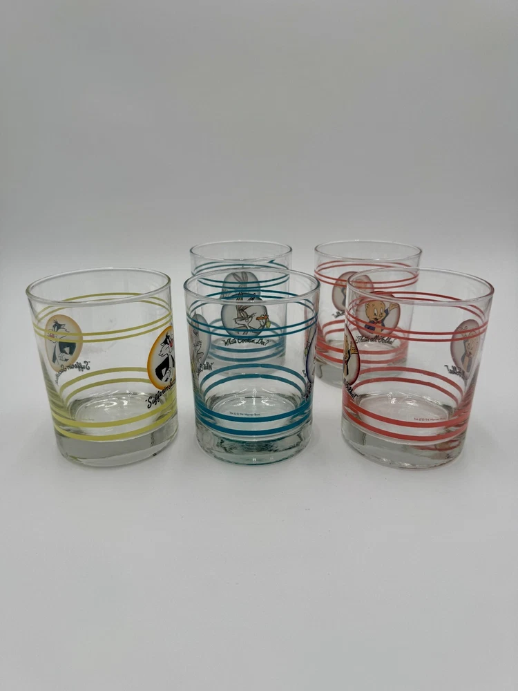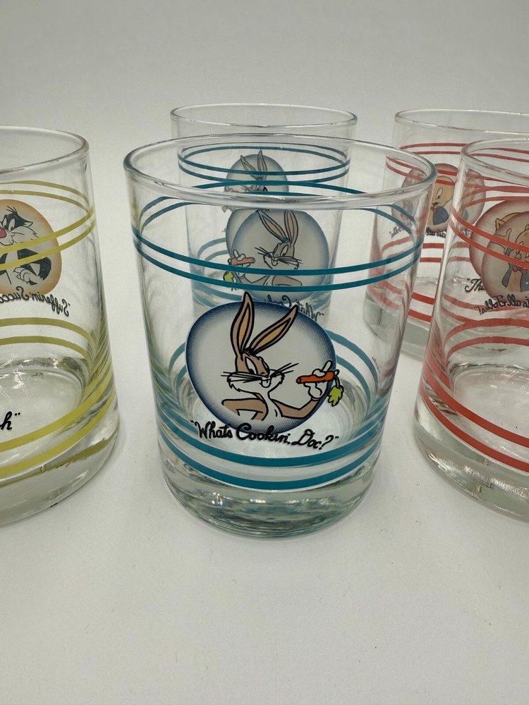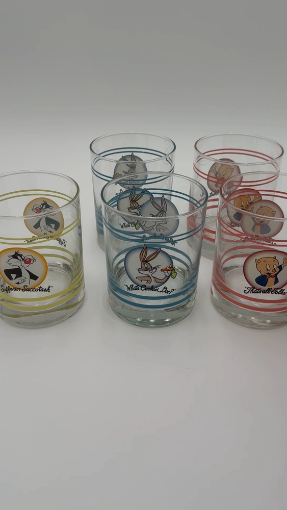 What an iconic set of glasses. Each one features a different character and color. There are stripes at the top and bottom with a character portrait in the middle. The design is featured on both sides. Glasses are sold individually. Please use the drop down menu to pick which character(s) you would like to purchase. The details: 4.25” tall 3.25” opening diameter 3” bottom diameter In excellent vintage condition. Minor wear consistent with use and age. No chips or cracks.