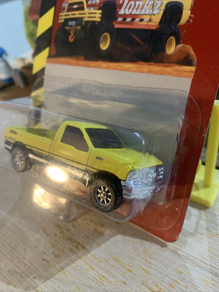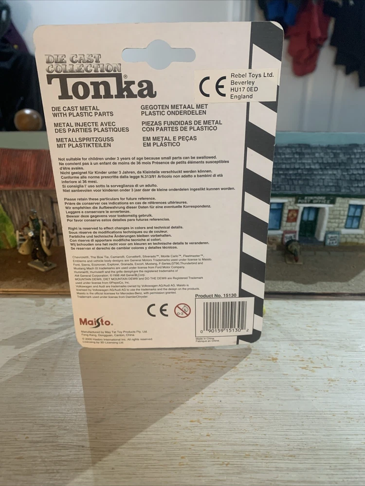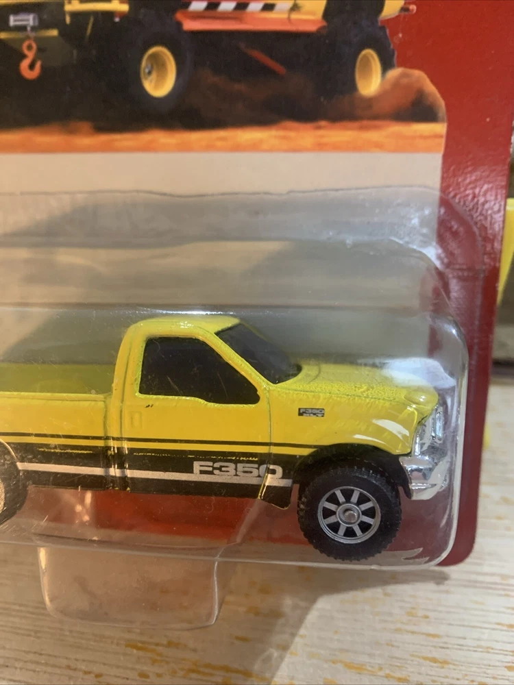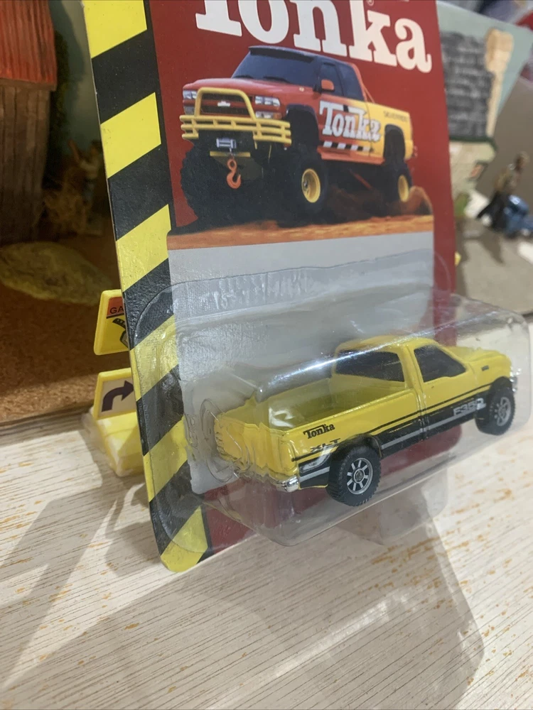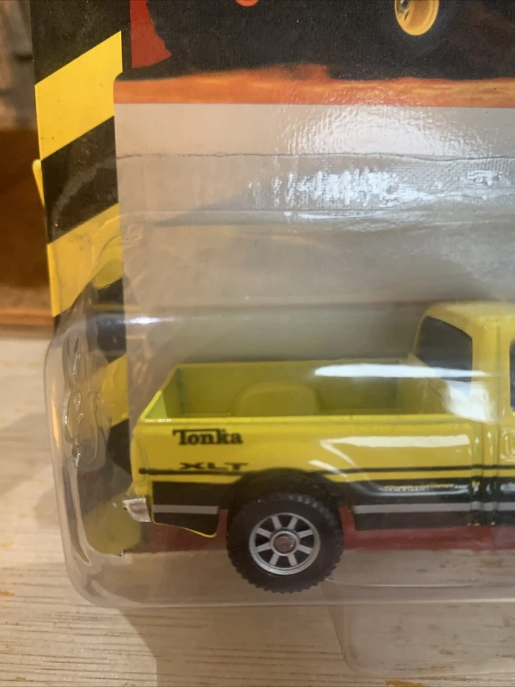 This is a rare vintage 2000 Maisto Tonka Ford F350 truck in 1:64 scale, made of diecast material. The pickup truck is yellow in colour and comes new in its original packaging. This collectible toy is a unique piece from the early 2000s, featuring the iconic Tonka and Ford brands, making it a desirable addition to any diecast vehicle collection.