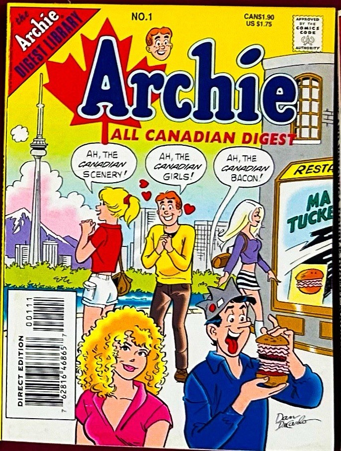 This vintage Archie Comics digest lot is a rare collection of 15 issues from the Archie Digest Library, featuring beloved characters and stories from Riverdale. The collection includes various titles such as Archie’s Double Digest, Archie’s Pals ‘n’ Gals Double Digest, Archie Annual Digest Magazine, Betty and Veronica Digest Magazine, and Laugh Digest Magazine. Below is a detailed description of each issue’s condition: Included Issues and Conditions 1. Archie’s Double Digest #87 • Slightly bent. 2. Archie’s Double Digest #77 • Cover has scuffs, a faded small handwritten “T,” and stains. 3. Archie’s Double Digest #95 • Cover is faded with stains; pages and cover are creased and bent. 4. Archie’s Pals ‘n’ Gals Double Digest #18 • Cover has scuffs and is faded. 5. Archie Annual Digest Magazine #67 • General wear consistent with age. 6. Archie Digest Magazine #139 • One page is creased. 7. Archie Andrews: Where Are You? #106 • Good overall condition. 8. Little Archie Digest Magazine #17 • Good overall condition. 9. Archie All Canadian Digest #1 • Highly collectible; sought after by collectors. 10. Betty and Veronica Double Digest #56 • Cover has stains and a small handwritten “T.” 11. Betty and Veronica Digest Magazine #85 • Good overall condition. 12. Betty and Veronica Digest Magazine #73 • One page is creased. 13. Laugh Digest Magazine #133 • Good overall condition. 14. Laugh Digest Magazine (Unnumbered) • Cover has stains, a small handwritten “T”; pages are creased, bent, and stained. 15. Laugh Digest Magazine #118 • Cover has stains, a handwritten “T”; pages are bent, creased, and stained. Overall Condition The comics are pre-owned with varying degrees of wear, including: • Stains on covers. • Small handwritten “T” marks on some covers. • Fading on several issues. • Creases and bends on pages and covers. • Minor scuffs or small tears on select issues. These issues are not boarded This lot would make an excellent addition to any Archie Comics enthusiast’s collection, particularly for those seeking vintage items despite signs of age-related wear.