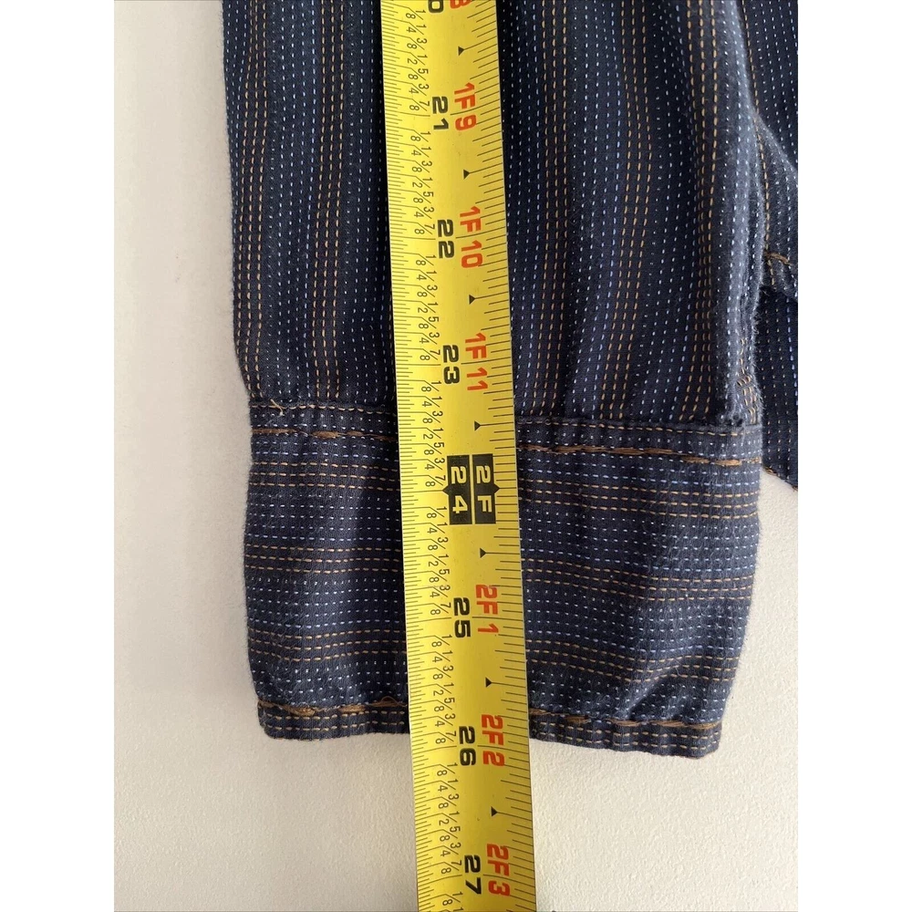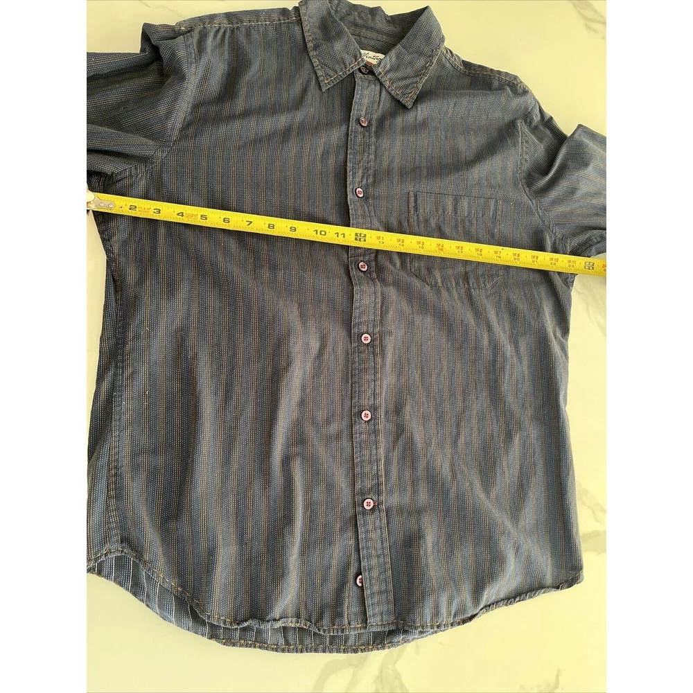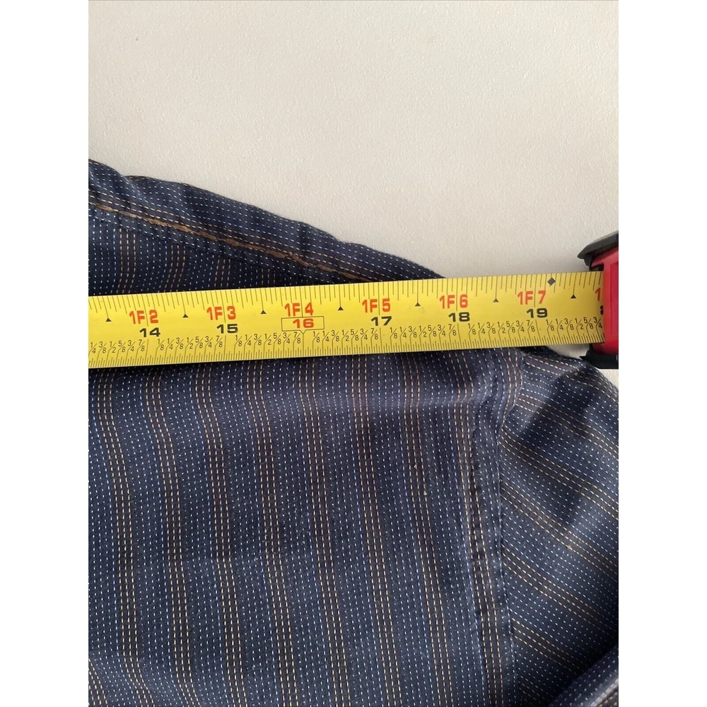 This rare vintage men's button-down shirt features a blue and tan striped pattern and long sleeves with buttoned cuffs. The collared neckline and buttoned closure add to the classic and versatile style, making it perfect for travel, casual outings, or business settings. The shirt is machine washable and made of a comfortable knit fabric consisting of polyester and cotton. It also includes accents such as pockets, and the cowboy-themed design adds a unique touch. The shirt is labeled as a size large and has a regular fit for a comfortable and flattering look. This shirt is a great addition to any wardrobe and is perfect for the winter, fall, and spring seasons. Excellent condition! See photos for measurements.