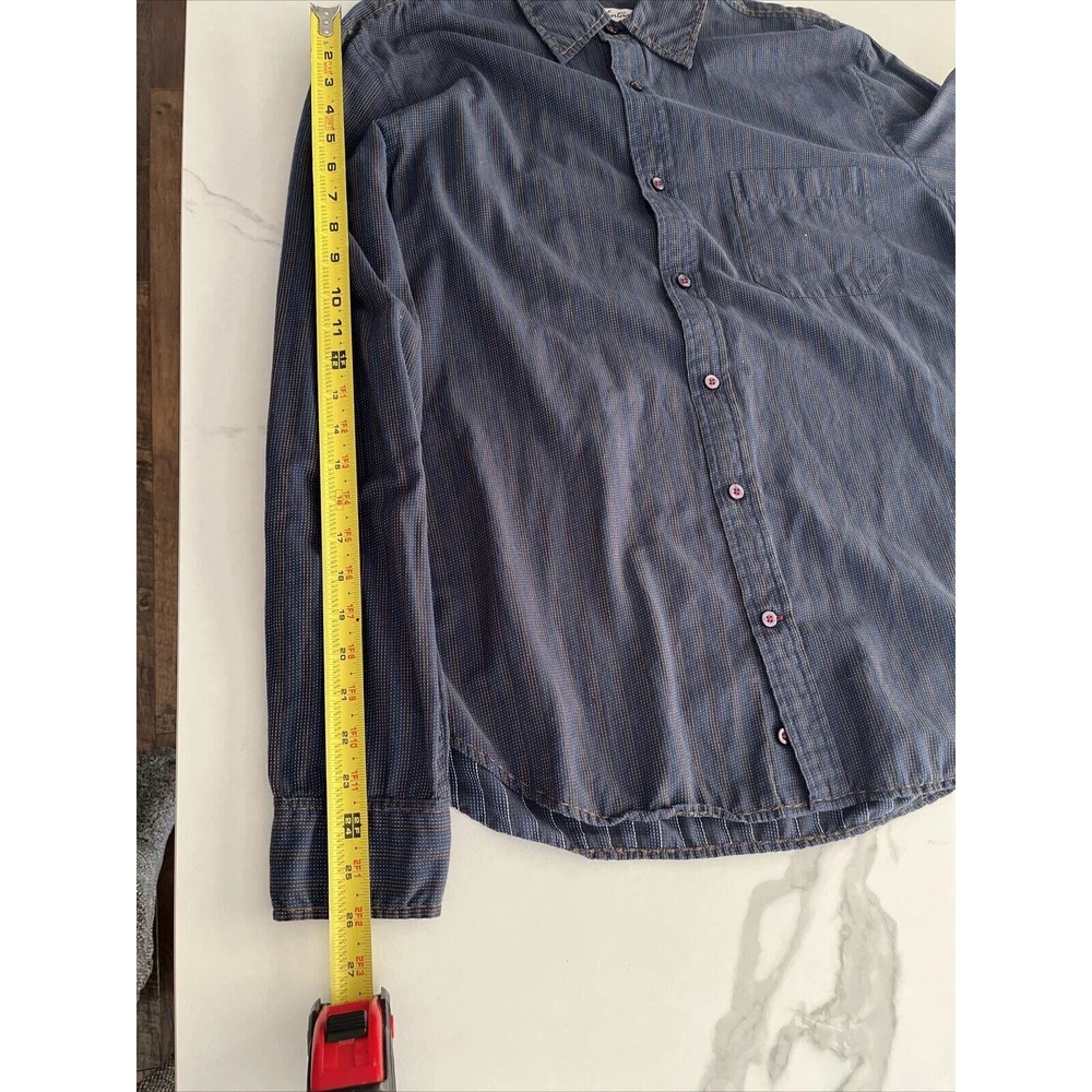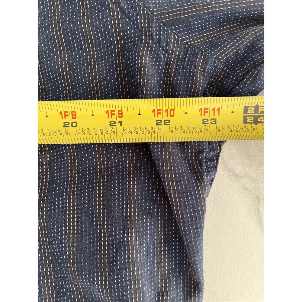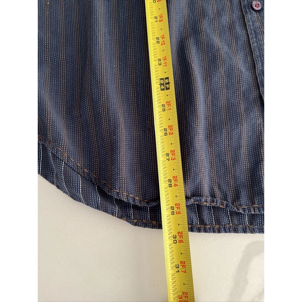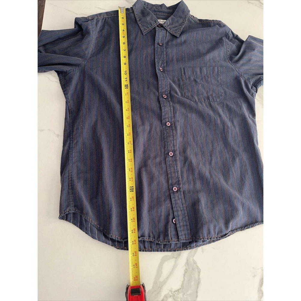 This rare vintage men's button-down shirt features a blue and tan striped pattern and long sleeves with buttoned cuffs. The collared neckline and buttoned closure add to the classic and versatile style, making it perfect for travel, casual outings, or business settings. The shirt is machine washable and made of a comfortable knit fabric consisting of polyester and cotton. It also includes accents such as pockets, and the cowboy-themed design adds a unique touch. The shirt is labeled as a size large and has a regular fit for a comfortable and flattering look. This shirt is a great addition to any wardrobe and is perfect for the winter, fall, and spring seasons. Excellent condition! See photos for measurements.