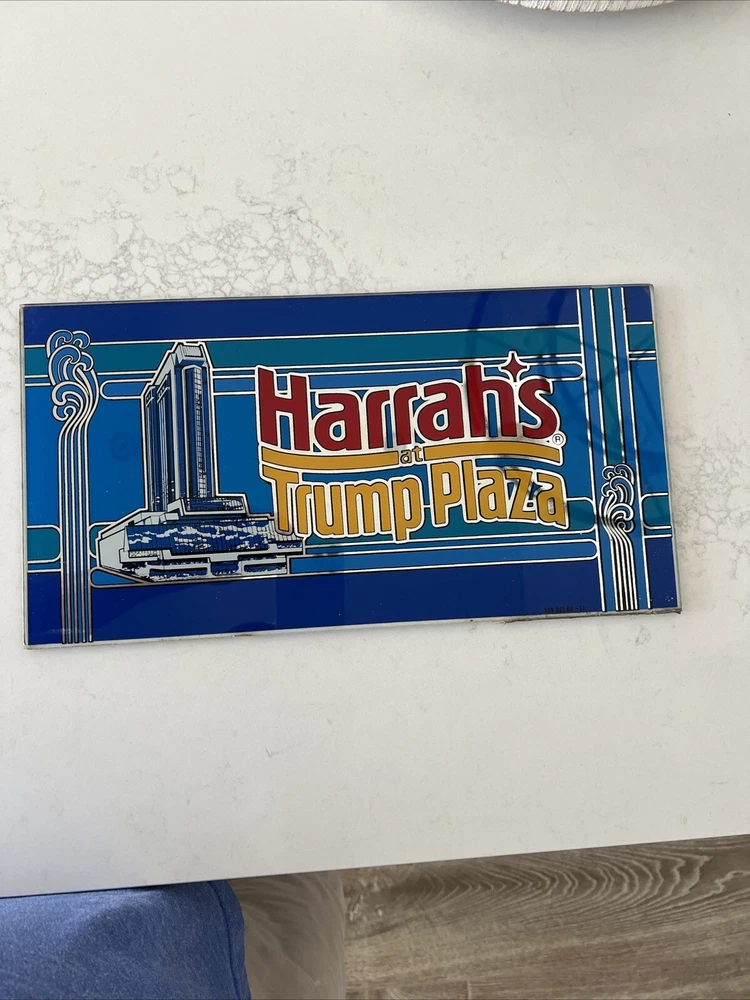 Rare Harrah’s at Trump Plaza Atlantic City Slot Machine Glass. 15” x 8” This rare vintage slot machine glass features the iconic TRUMP theme, perfect for any casino or vintage item collector. Made with high-quality materials, this glass is a true gem that will bring a touch of nostalgia to any space. Whether you're looking to add to your collection or simply want to own a piece of history, this item is sure to impress.