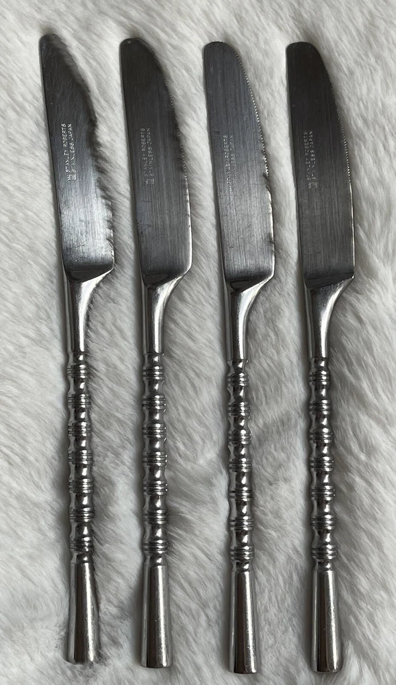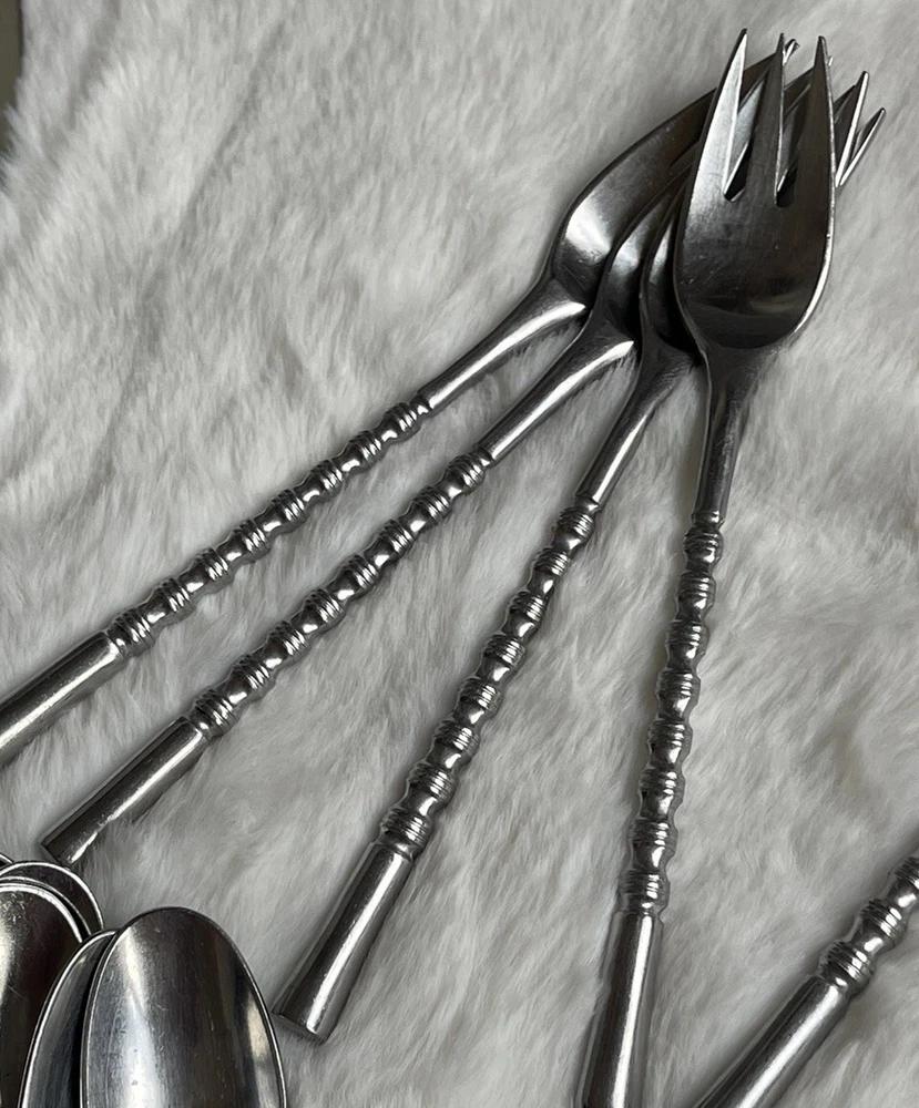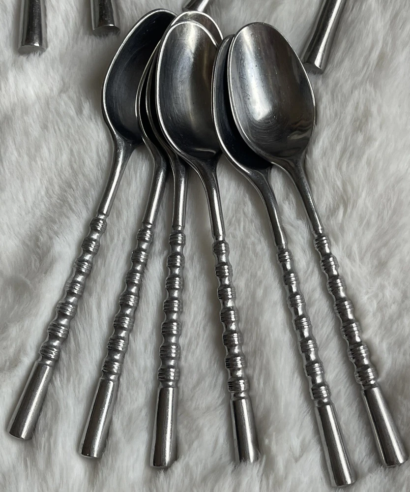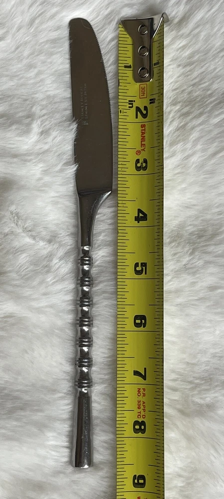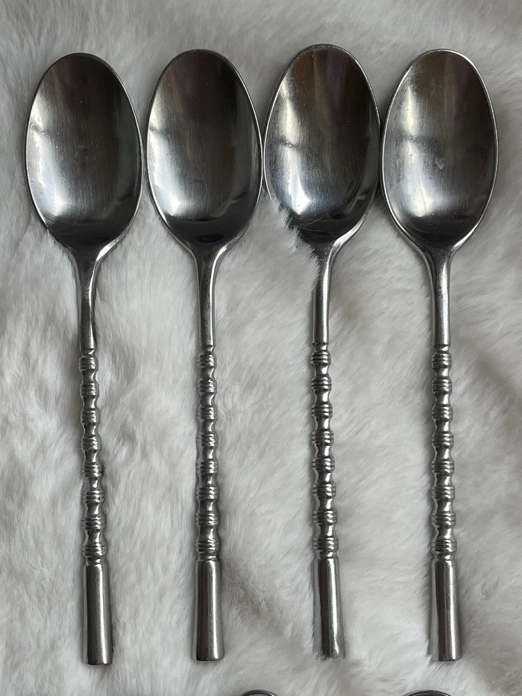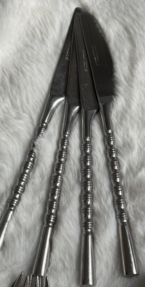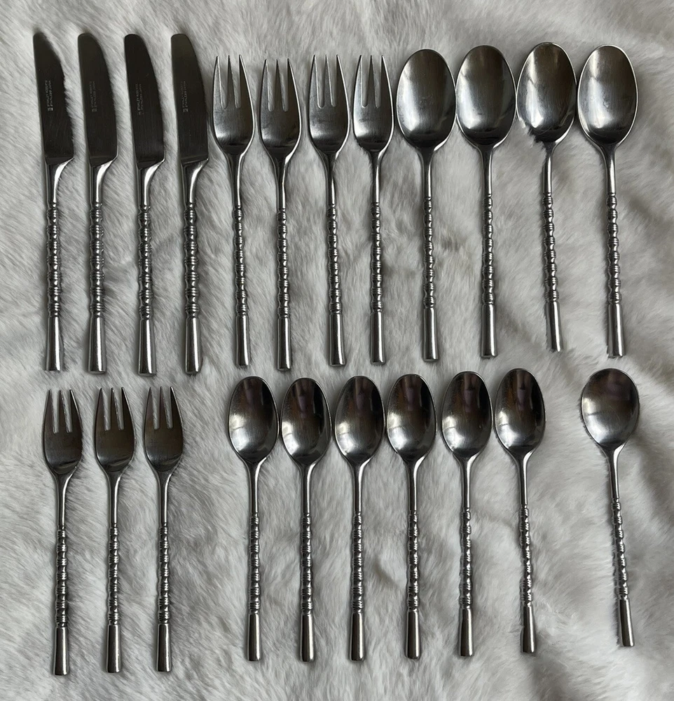 Add a touch of Mid-Century Modern style to your dining table with this vintage Stanley Roberts IBIZA flatware set. Made of durable stainless steel, this set includes 4 dinner knives, 4 dinner forks, 4 soup spoons, 6 teaspoons, 3 salad forks, and a sugar spoon for a total of 22 pieces. They have a beautiful silver finish with handles that feature a unique ring pattern that adds a touch of elegance to your table setting. This reusable and dishwasher-safe set is perfect for all occasions and is sure to impress your guests. The set was manufactured in Japan and has a matte finish. The item length can be seen in the photos, and this set weighs a total of 3 lbs. Don't miss out on this discontinued and rare find from Stanley Roberts.