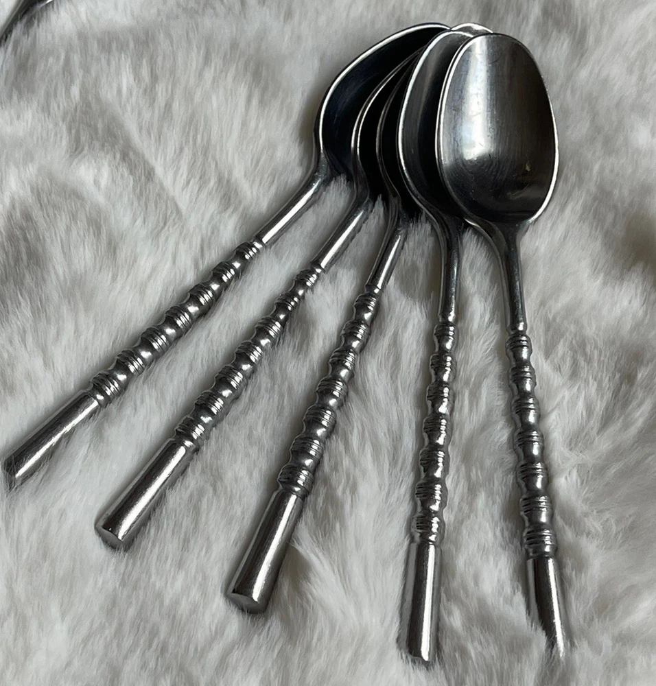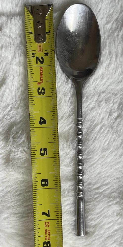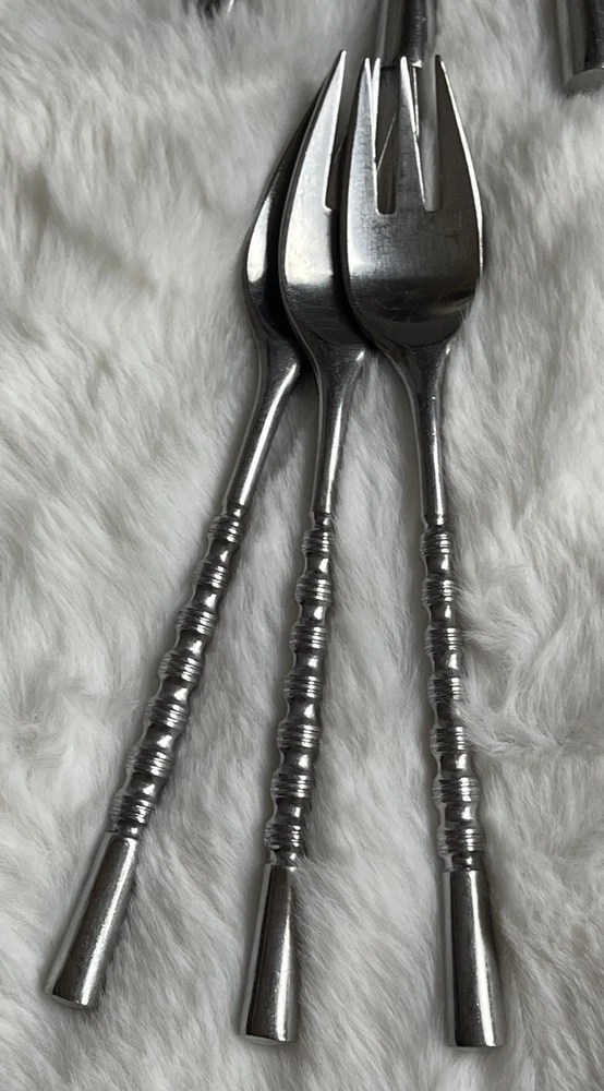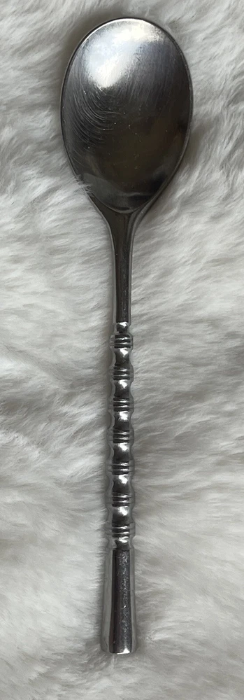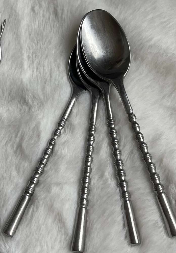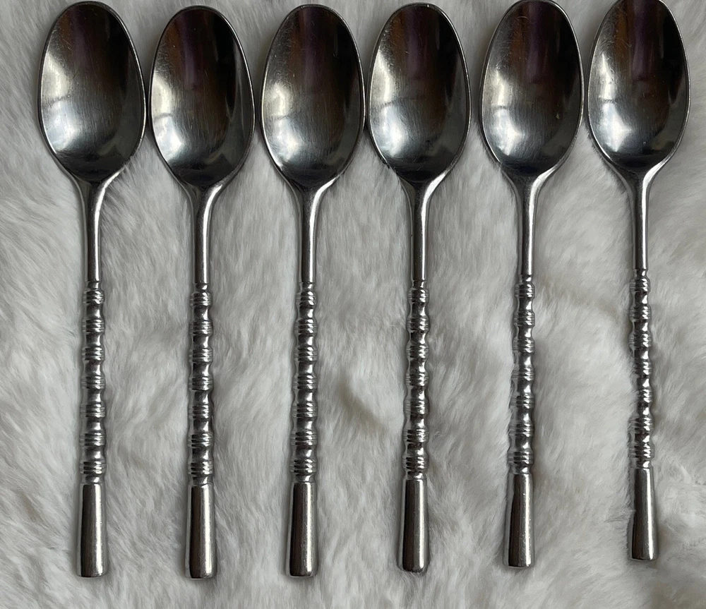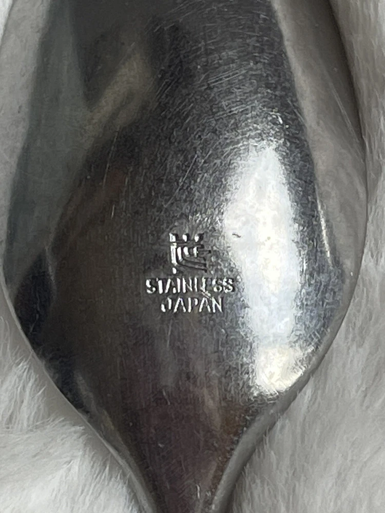 Add a touch of Mid-Century Modern style to your dining table with this vintage Stanley Roberts IBIZA flatware set. Made of durable stainless steel, this set includes 4 dinner knives, 4 dinner forks, 4 soup spoons, 6 teaspoons, 3 salad forks, and a sugar spoon for a total of 22 pieces. They have a beautiful silver finish with handles that feature a unique ring pattern that adds a touch of elegance to your table setting. This reusable and dishwasher-safe set is perfect for all occasions and is sure to impress your guests. The set was manufactured in Japan and has a matte finish. The item length can be seen in the photos, and this set weighs a total of 3 lbs. Don't miss out on this discontinued and rare find from Stanley Roberts.
