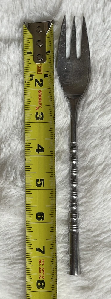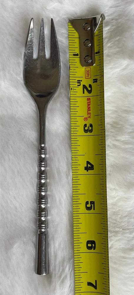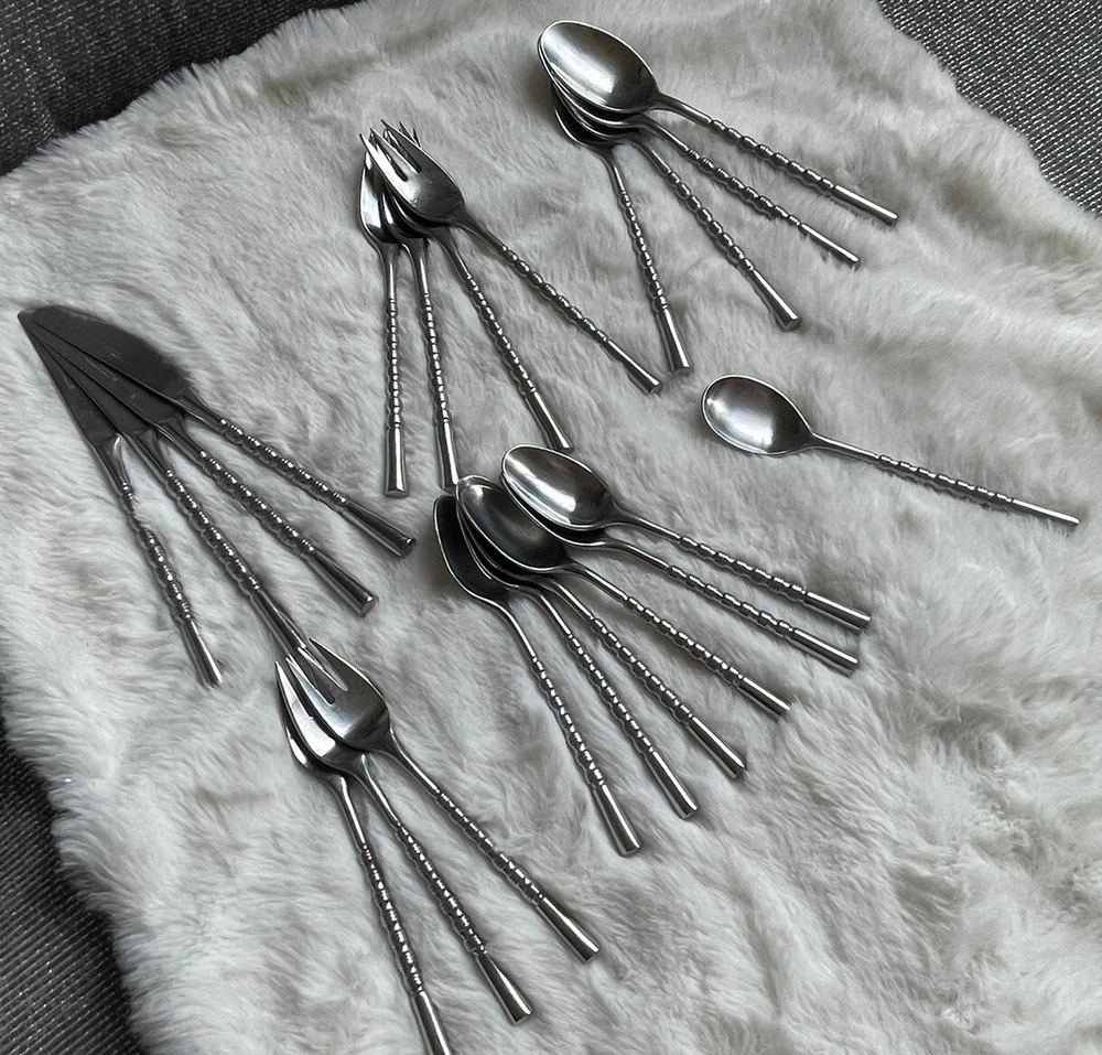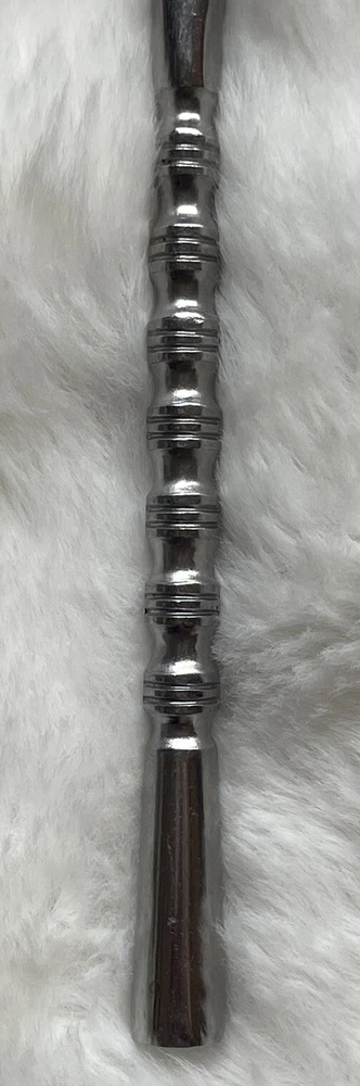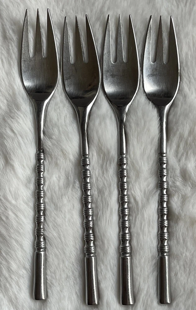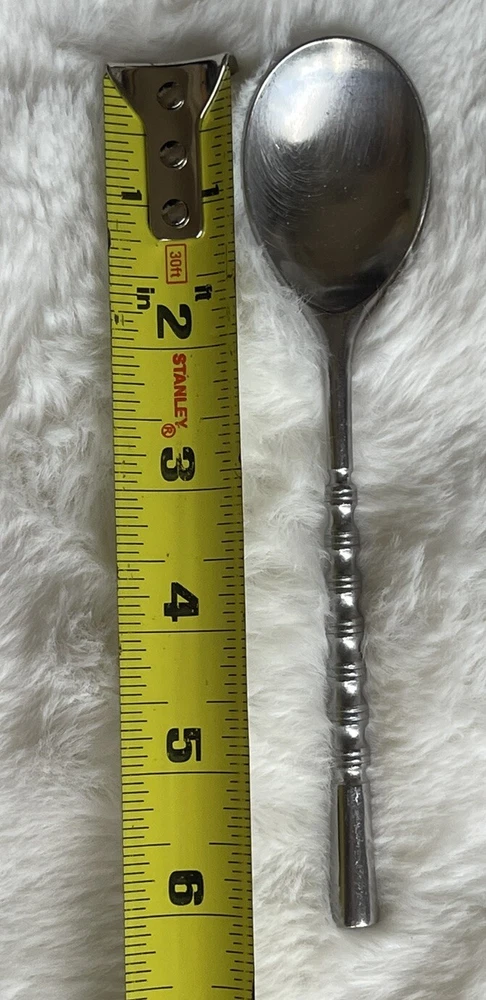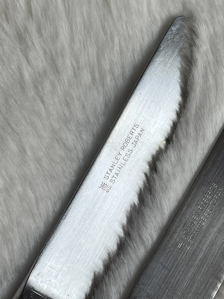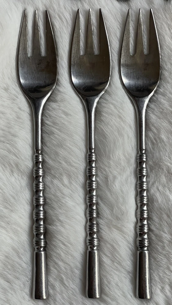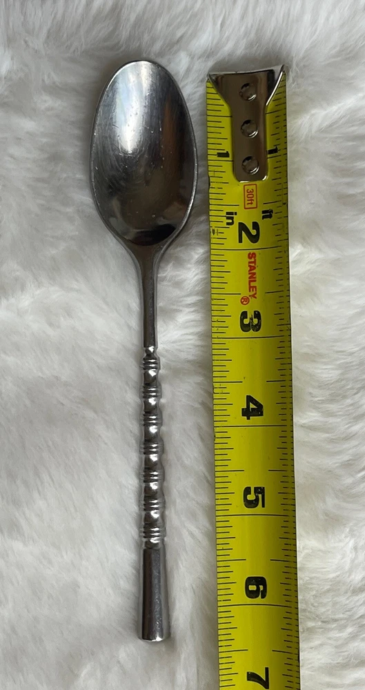 Add a touch of Mid-Century Modern style to your dining table with this vintage Stanley Roberts IBIZA flatware set. Made of durable stainless steel, this set includes 4 dinner knives, 4 dinner forks, 4 soup spoons, 6 teaspoons, 3 salad forks, and a sugar spoon for a total of 22 pieces. They have a beautiful silver finish with handles that feature a unique ring pattern that adds a touch of elegance to your table setting. This reusable and dishwasher-safe set is perfect for all occasions and is sure to impress your guests. The set was manufactured in Japan and has a matte finish. The item length can be seen in the photos, and this set weighs a total of 3 lbs. Don't miss out on this discontinued and rare find from Stanley Roberts.