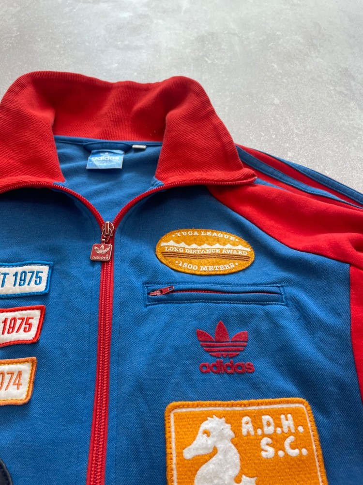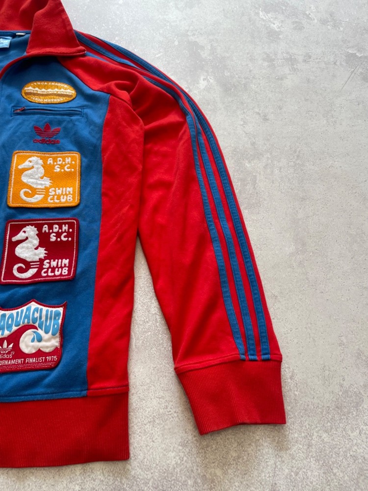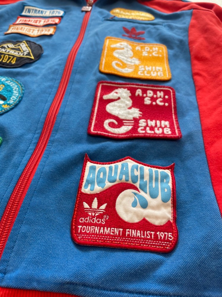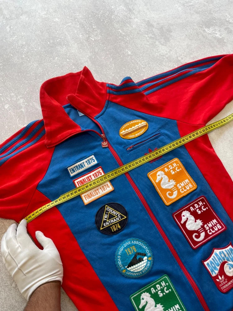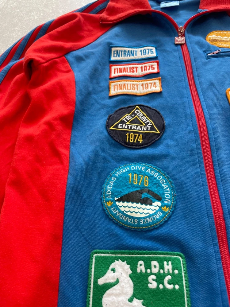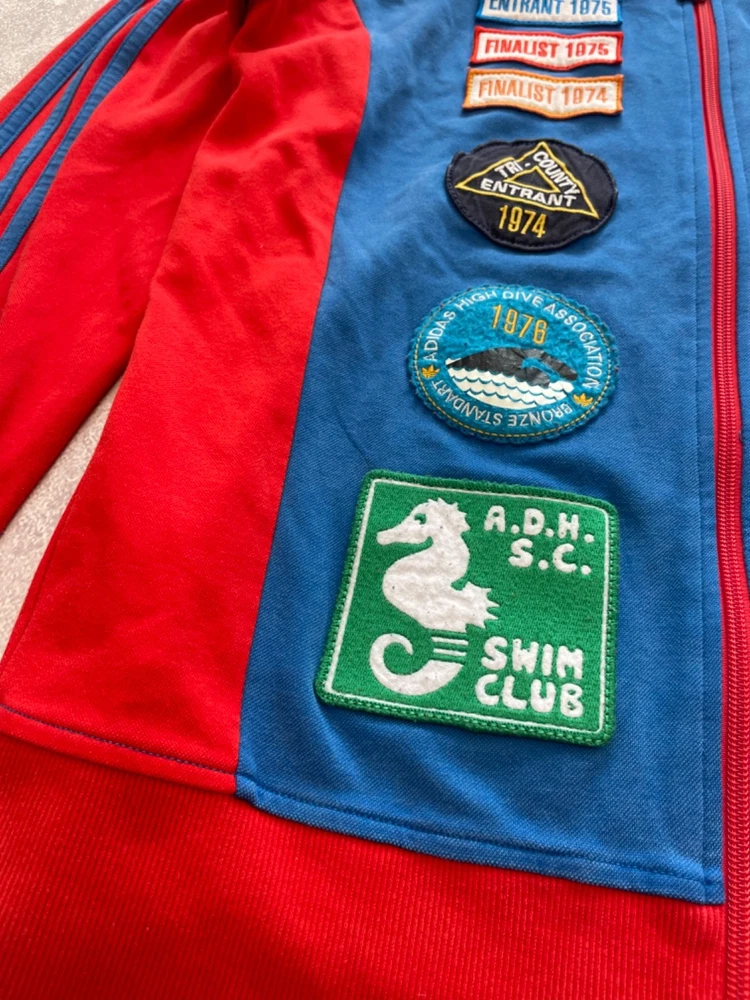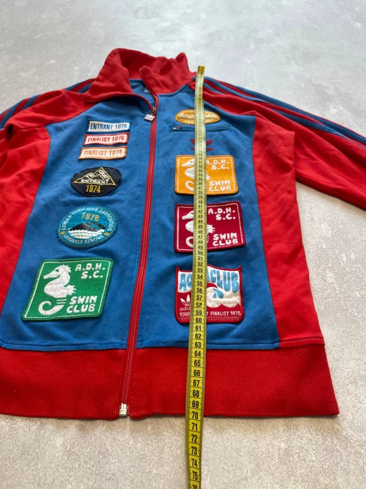 The Rare Vintage Style Adidas Trefoil Track Jacket is a unique piece with a full zip closure and patches showing your swim or dive club affiliation. Made of polyester, this mid-length jacket features a multicolor design with the iconic Adidas logo accents. Perfect for casual occasions and gym training, this 70s and 80s-inspired jacket is a stylish addition to any man's wardrobe. Machine washable for easy care, this regular fit jacket is a must-have for those who appreciate retro athletic fashion from the Adidas Originals line.