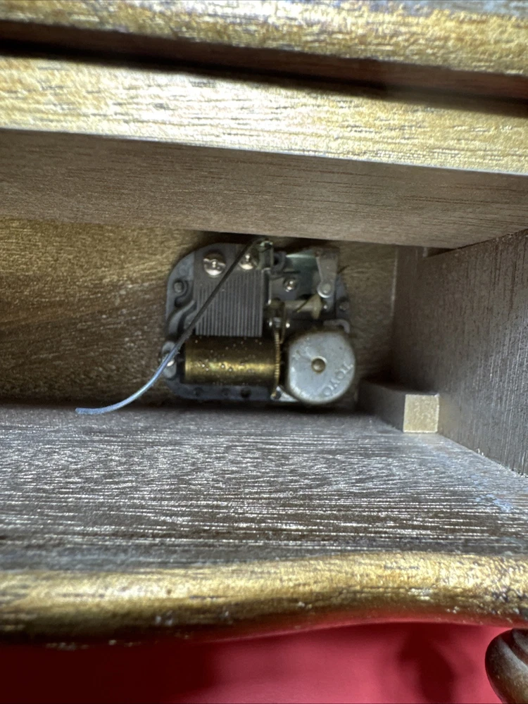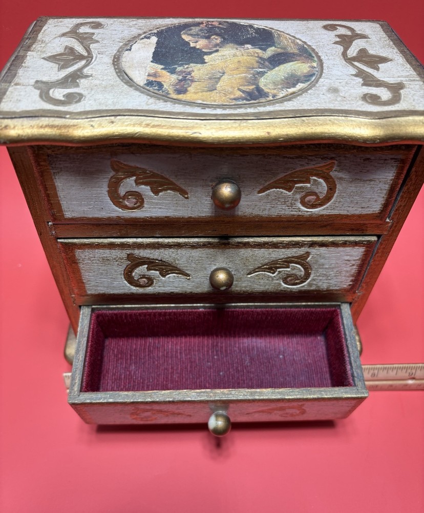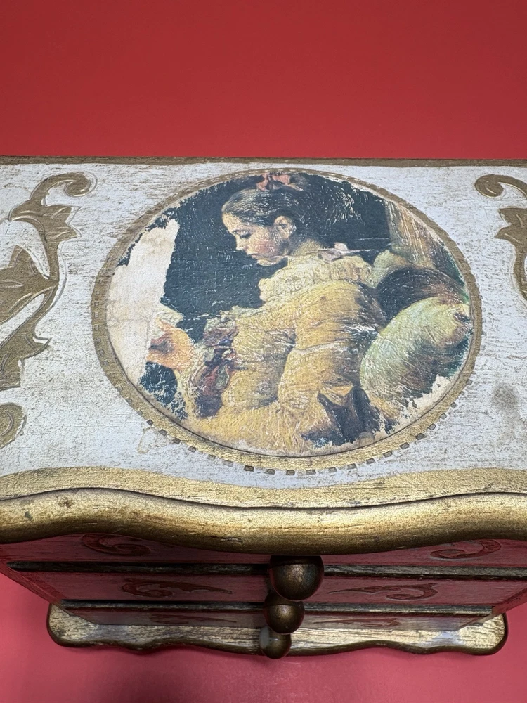 This beautiful vintage jewelry box is perfect for storing all of your precious jewelry items. With three drawers, it offers ample space for necklaces, bracelets, anklets, rings, cufflinks, earrings, and body jewelry. The box is made of high-quality wood with a gold color and features a velvet lining for added protection. The box also has a musical feature, allowing you to enjoy your favorite tunes while admiring your jewelry collection. Its rectangular shape and storage box items make it suitable for any bedroom or dressing table. This rare vintage piece was made in Italy and is sure to be a cherished addition to your jewelry collection.