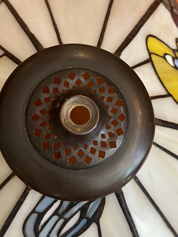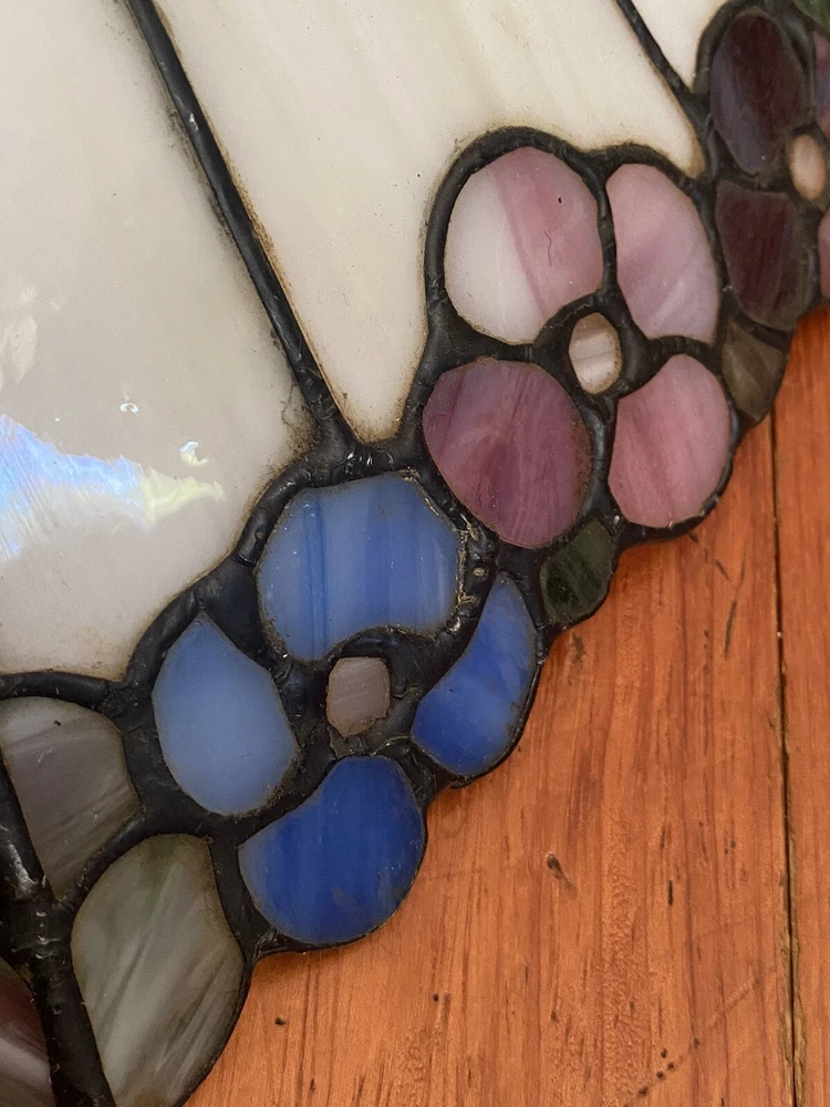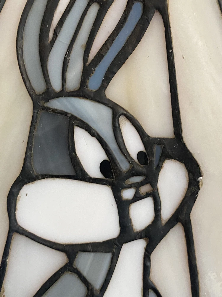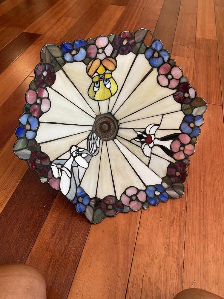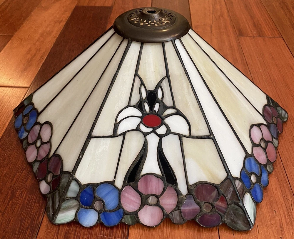 This vintage Dale Tiffany Lamp features Sylvester, Bggs Bunny andTweety from the famous Looney Tunes franchise. The lamp is made of stunning stained glass and is an interactive piece, perfect for any Looney Tunes fan. The lamp is a great addition to any collection and is sure to bring a smile to anyone's face. The shade measures 9" tall and the width across the bottom is 14". This is a very solid piece but please see last 2 pictures. There is a small piece of glass missing at the rim and a crack shown in one of the cream sections