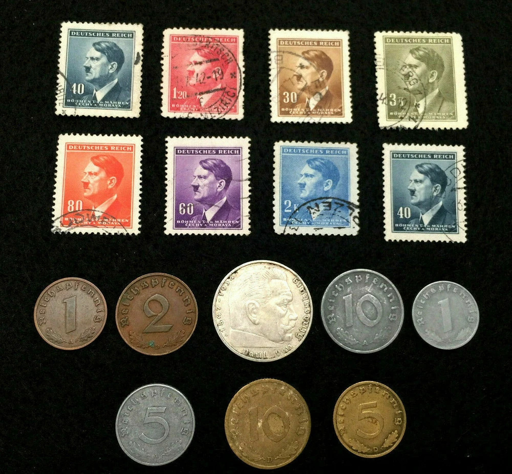 Rare WW2 German Coins & Stamps Set Of Historical Artifacts - Complete Collection You will get all that is shown in the picture : WWII 2 Mark SILVER coin big eagle (1937 - 1939) WWII 1 Reichspfennig bronze coin (1937 - 1939) WWII 2 Reichspfennig bronze coin (1937 - 1940) WWII 1 Reichspfennig zinc coin (1940-1943) WWII 5 Reichspfennig zinc coin (1940-1943) WWII 10 Reichspfennig zinc coin (1940-1943) WWII 5 Reichspfennig brass coin (1937-1940) WWII 10 Reichspfennig brass coin (1937-1940) WWII It will be random pick Circulated stamps with different denomination. WWII 1.20 Pf Circulated stamp WWII 30 Pf Circulated stamp WWII 3 Pf Circulated stamp WWII 80 Pf Circulated stamp WWII 60 Pf Circulated stamp WWII 2 Pf Circulated stamp WWII 40 Pf Circulated stamps Some of the stamps will be different than the picture. These are rare World War 2 historical German coins. These are stock pictures but you will get coins in the similar condition but of different mint mark. These coins were minted in Germany between 1936 and 1944 during World War II, these coins are an emergency issue type. You will receive circulated stamps in the similar condition, the stamps may have postage marks at a different place. Mint Marks A - Berlin, Germany B - Vienna, Austria (Wien) D - Munich, Germany (Munchen) E - Dresden, Germany (Muldenhutten) F - Stuttgart, Germany G - Karlsruhe, Germany J - Hamburg, Germany Imagine holding a piece of history in your hands!!! Note : Stock Photo . Actual coins may vary in terms of year and mint but all in perfect/similar condition. Please let us know if you have any question about this item.