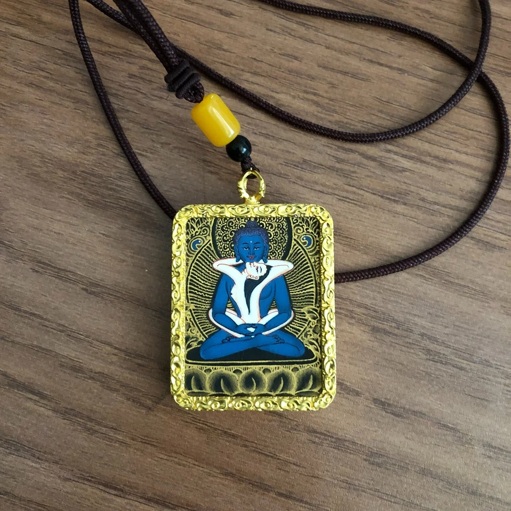 ~~ Buddha Shakti Thangka Pendant~~ Pendant thangka are believed to bring internal peace and good luck within one and family. Buddha Shakti is deep blue in color, symbolizing the sky or emptiness of mind. Samantabhadri or buddha’s consort is white in color, symbolizing the aspect of the clarity of our mind. The male female of Adi Buddha in union depict the unity of emptiness and cognizance. Samantabhadri is completely nude and while not ornaments symbolizing that she is free from all thought constructs. It means that enlightenment can be realized only when we are free from thought constructs and one perceives the empty nature of the mind directly. [Size = 4.5cm x 3.5cm] Material Used for Thangka Art: • Cotton Canvas • Natural Pigments and colors • Gold leaf ~Genuine 100% hand-painted from Himalayas Please feel free to contact me if you have any question regarding the painting.