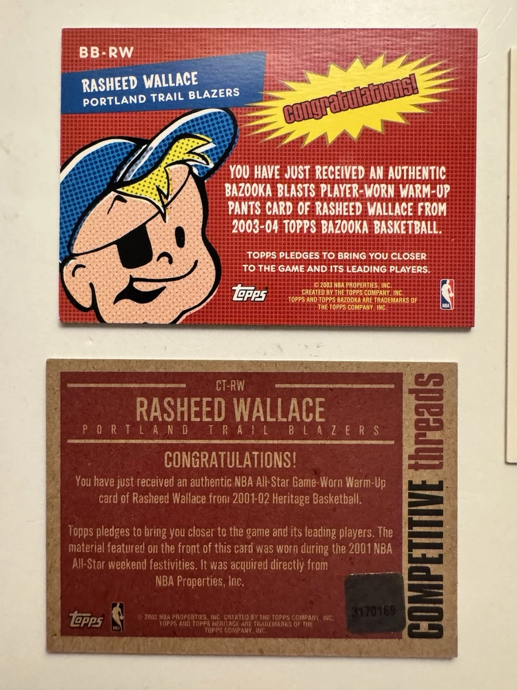 The product is a lot of three Rasheed Wallace patch memorabilia cards from the 2002 Topps Heritage set. These sports trading cards feature Rasheed Wallace, who played for the Portland Trail Blazers and Detroit Pistons in the 2002-03 NBA season. The cards are inserts with chase elements, showcasing memorabilia patches from Wallace's jerseys. Made by Topps, they are a desirable collector's item for basketball fans.