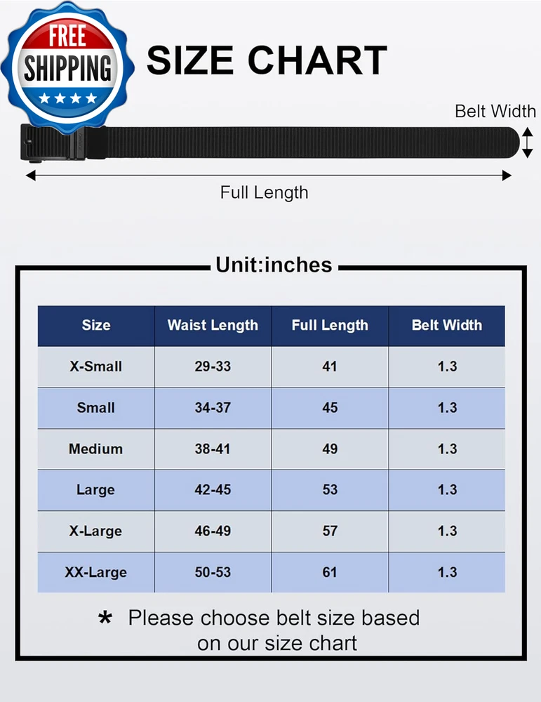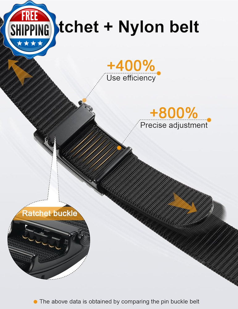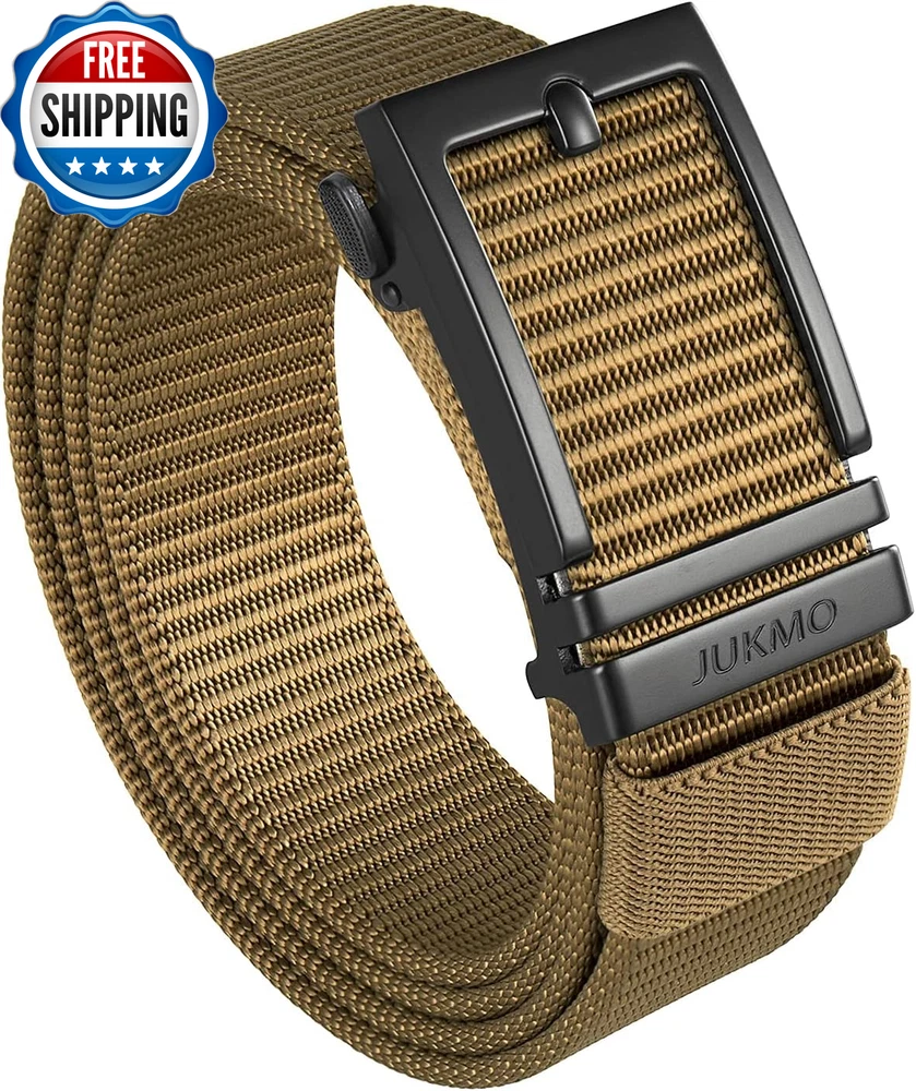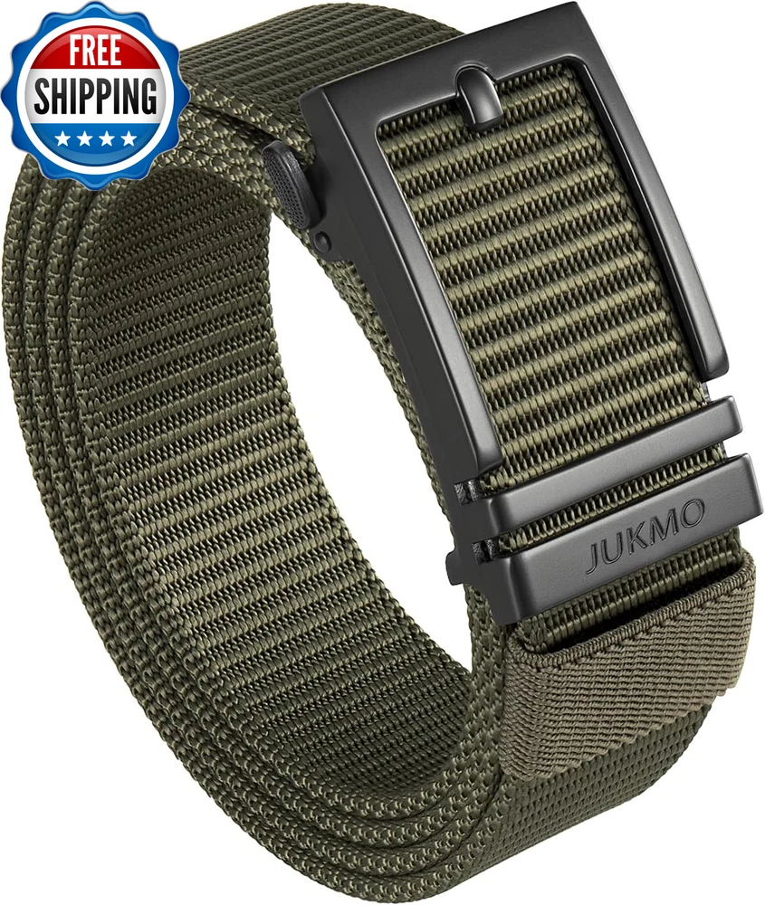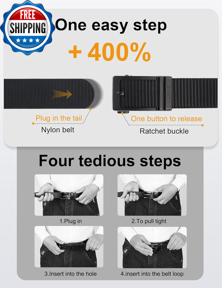 Ratchet Golf Belt for Men, Nylon Web Tactical Belt with Automatic Slide Buckle Product Description 1 One easy step 2 One button release 3 Comfortable fit JUKMO belt not deforming, not cracking after long-term use 1 Golf 2 Various combinations Pack belt in elegant gift box for you giving whoever you love, or yourself Various ratchet belt products Add to Cart Add to Cart Add to Cart Add to Cart Add to Cart Add to Cart Customer Reviews 4.4 out of 5 stars 16,751 4.5 out of 5 stars 343 4.6 out of 5 stars 71 4.6 out of 5 stars 586 4.6 out of 5 stars 1,893 4.4 out of 5 stars 2,551 4.3 out of 5 stars 606 Price $18.98 $ 18 . 98 $19.98 $ 19 . 98 $24.98 $ 24 . 98 $19.98 $ 19 . 98 $14.98 $ 14 . 98 $18.98 $ 18 . 98 — Size Range 29"-53" Waist 30"-58" Waist 28"-58" Waist 28"-58" Waist 30"-58" Waist 20"-52" Waist 18"-58" Waist Belt Width 1.3" 1.5" 1.5" 1.3" 1.5" 1.3" 1.3" Style Golf/Casual Dress/Golf/Casual Business/Dress Business/Dress Golf/Tactical/Casual Golf/Casual Golf/Casual Limitless Adjustments ✔ ✔ ✔ ✔ ✔ ✔ ✔ Gift Package ✔ ✔ ✔ ✔ ✔ ✔ ✔ Many comments say that the buckle of this belt is broken, what's going on? We have upgraded the structure of the belt buckle and it is now very durable. How is the quality of this belt? How long can it last? Our belt can be used for at least three years and the belt strap will not deform. How quickly can I adjust my belt when I sit down? All you need to do is gently push the lever on the side and the lock will unlock. It can be adjusted very small spacing to just fit for comfort. Is it suitable for gifts? What is inside the package? It is great choice for gift. It comes with 1*exquisite gift box, 1*zinc alloy buckle, 1*thickened and widened nylon belt. Item model number 1#FB Color Black Department mens Size Small-for Waist 34"-37"(Length 45") Package Dimensions 5.51 x 5.51 x 2.36 inches; 10.58 ounces Shipping Fast shipping is very important for us. Our standard US shipping service is FREE. Your order will be shipped within 2-3 business days upon full payment received. Your order will be delivered within 2-3 business days after the handling time. We only ship to the confirmed PayPal address. We reserve the right to cancel any order for any reason at any time. We are not responsible for undeliverable addresses. Returns and payment We offer a 30 days return policy from checkout winning date. We allow only PayPal as payment method FeedBack Your feedback very important to us, after you get your package and you are satisfied with our service please leave us positive feedback If you have any problem with your order / any questions please before leave any type of feedback Please visit our eBay store to check out other items for sale! Thank you for shopping at our store.