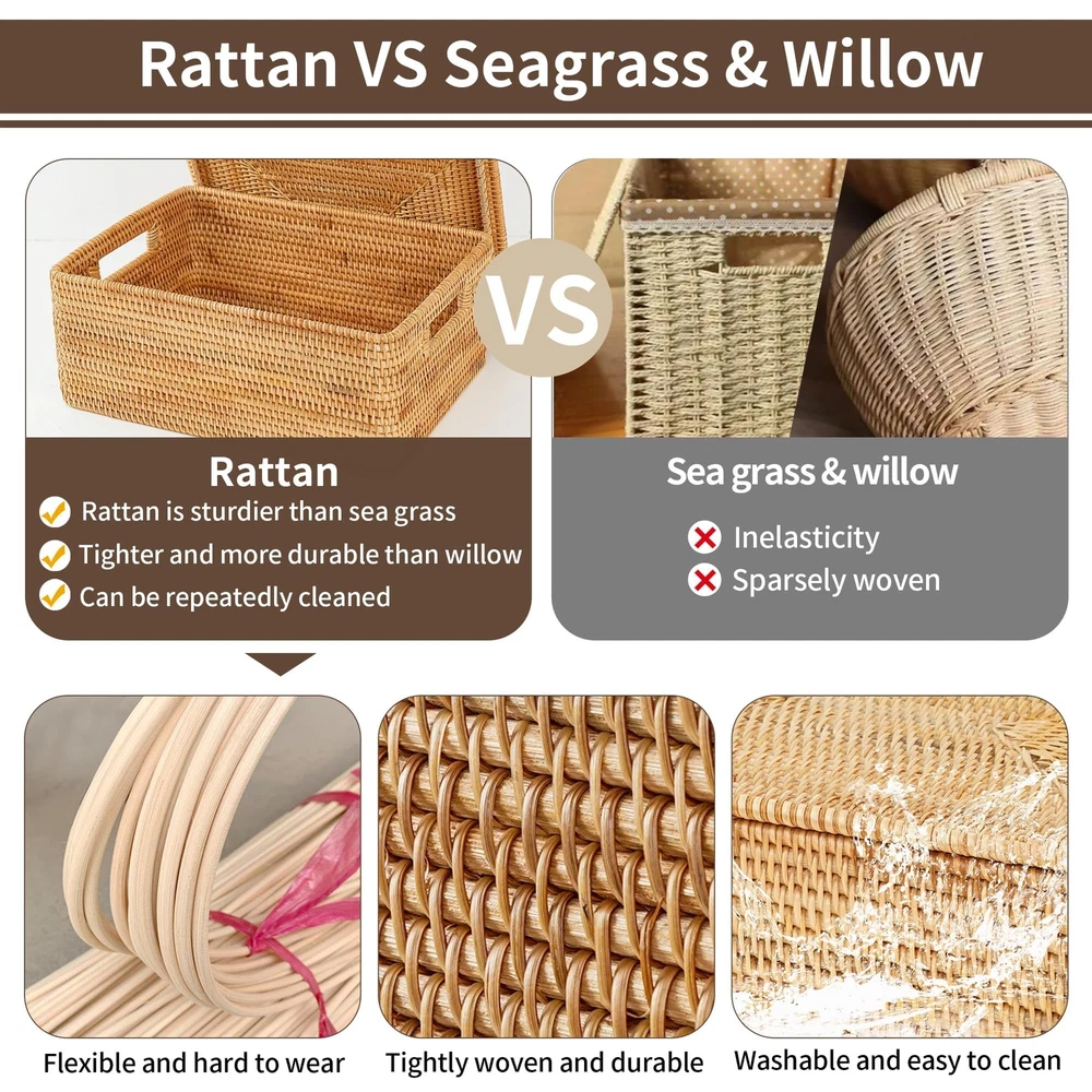【ORIGINAL RATTAN】:The rattan basket with lid is woven of original rattan instead of plastic imitation rattan.The rattan is more durable and more healthy to your family which can be used last for decades. Reasonable and considerate design is convenient for anyone to use, The elderly and children can easily to move and use. 【DECORATIVE BASKETS FOR HOME DECOR】:All details of every storage box has been carefully processed, the lid can keep the stuff away from dust. The longer you use it, the color of the baskets will gradually darken and become more classical, and the surface will be smoother and more comfortable,the rattan basket is durable and never out of date. 〖HAND-WOVEN〗:The rattan basket is handwoven by vietnamese craftsmen.Because it is handmade, there will be slight errors in size. If there is deformation during use, please wet the rattan with water and use heavy objects to shape and restore. 〖STACKABLE AND WASHABLE〗:Sturdy carrying handles make it easy to carry, and several baskets can be stacked to save storage space. The lid can effectively prevent dust troubles and keep items clean and tidy. Rattan baskets is washable for easy care, just air dry after washing to keep dry. 〖AFTER-SALES SERVICE〗:If you have any questions with the product, please feel free to contact us, we are gald to reply you in 24 hours.