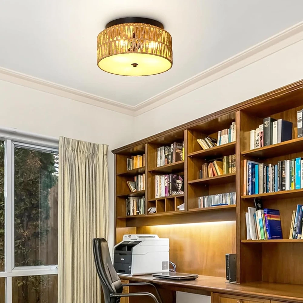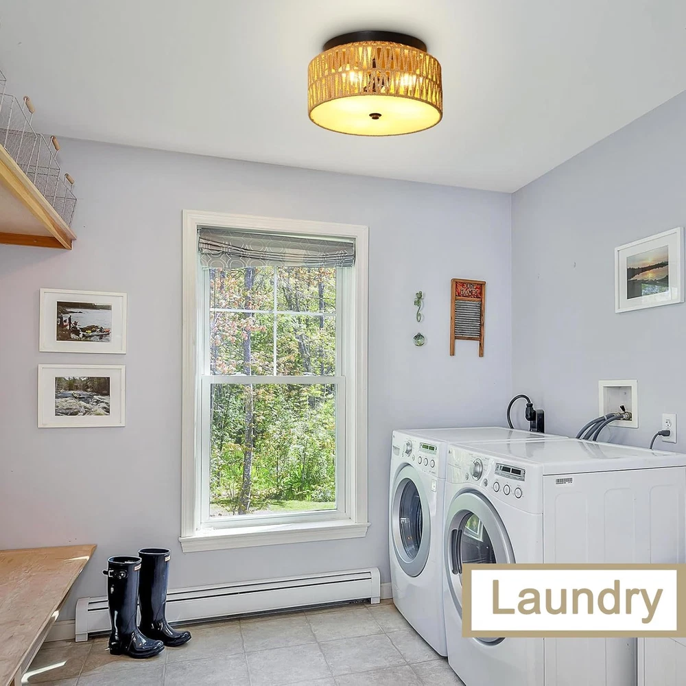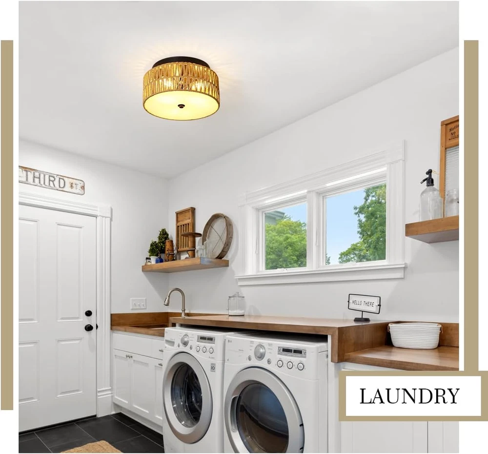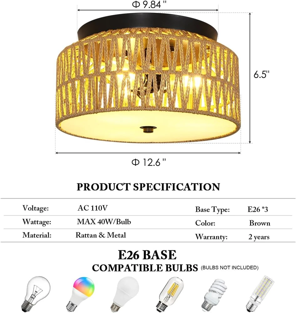 Bulb Base: E26 Additional Features: Hand Woven Rattan UPC: 313055170155 Material Type: Rattan Item Dimensions L x W x H: 12.6"L x 12.6"W x 6.5"H Theme: Farmhouse Shade Material: Rattan Light Color: Yellow Power Source: Corded Electric Warranty Type: Limited Material: Rattan Number of Light Sources: 3 Mounting Type: Ceiling Mount Indoor Outdoor Usage: Indoor Fixture Type: Non Removable Shape: Drum Brand: Does not apply Type: Does not apply Brightness: 1800 lumen Model Number: RAN-4 Unit Count: 1.0 Count Shade Color: Yellow Item model number: RAN-4 Color: RAN-4 Style: Farmhouse Specific Uses For Product: Indoor use only Control Method: App Installation Type: Flush Mount Controller Type: Push Button gtin13: 313055170155 Wattage: 180 watts Light fixture form: Ceiling Lighting Method: Downlight Product Dimensions: 12.6 x 12.6 x 6.5 inches; 3.59 Pounds Included Components: Mounting Hardware, Shade Finish Types: Lacquered Style Name: Farmhouse Voltage: 120 Volts Room Type: Kids Room, Laundry Room, Kitchen, Bedroom, Game Room Switch Type: Push Button Number of Items: 1 Required Assembly: No Light Source Type: LED, CFL, Incandescent