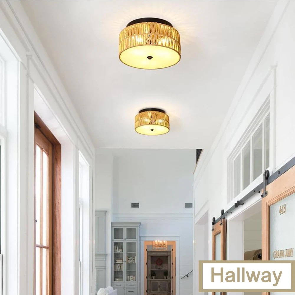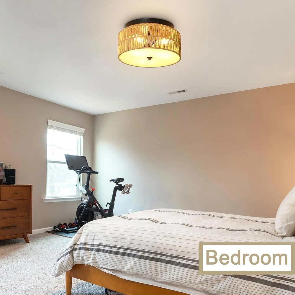 Rattan Ceiling Light, 3-Lights Hand Woven Ceiling Light Fixture, Boho Flush Moun