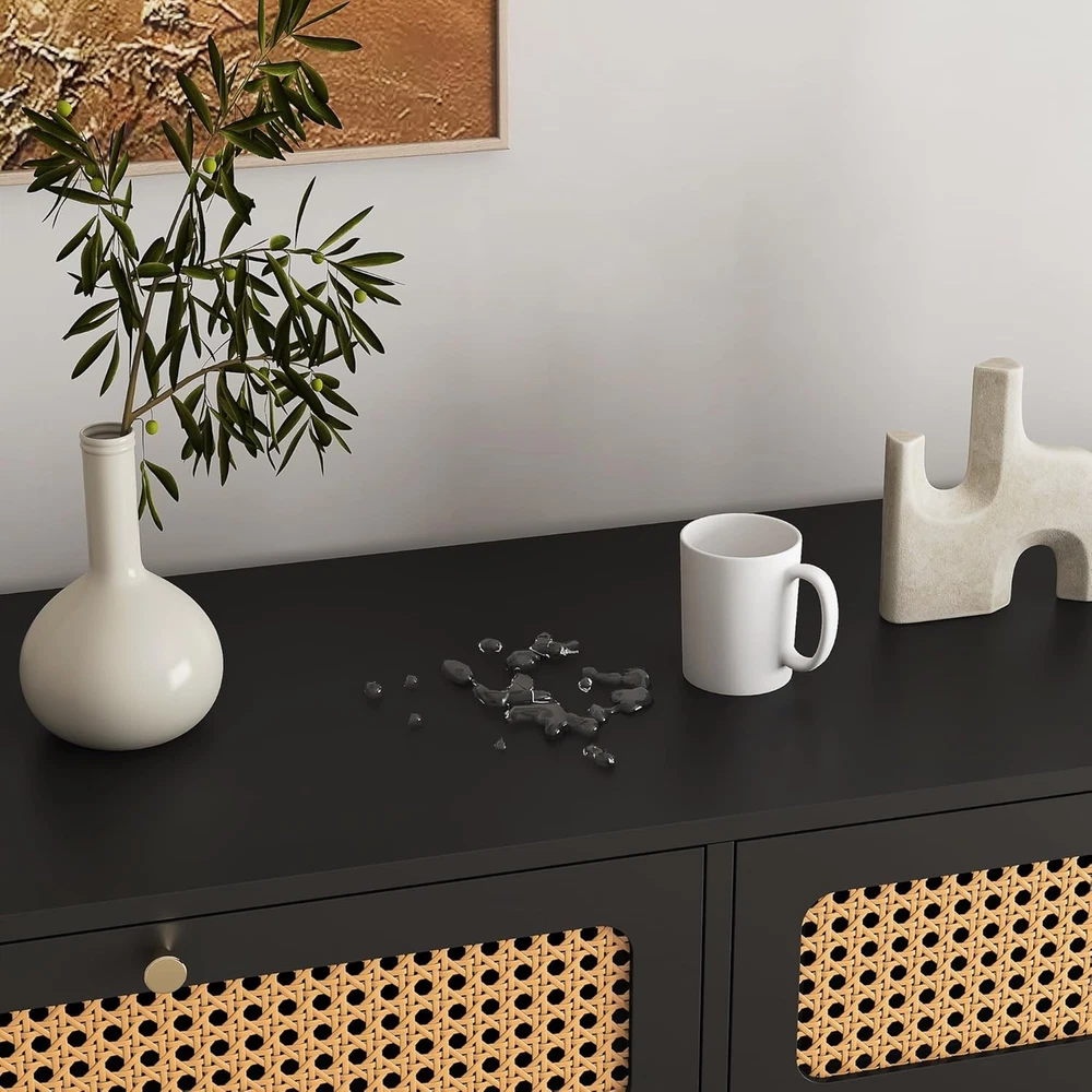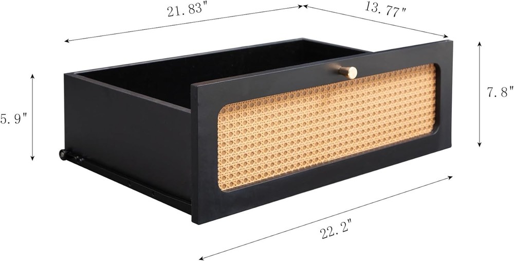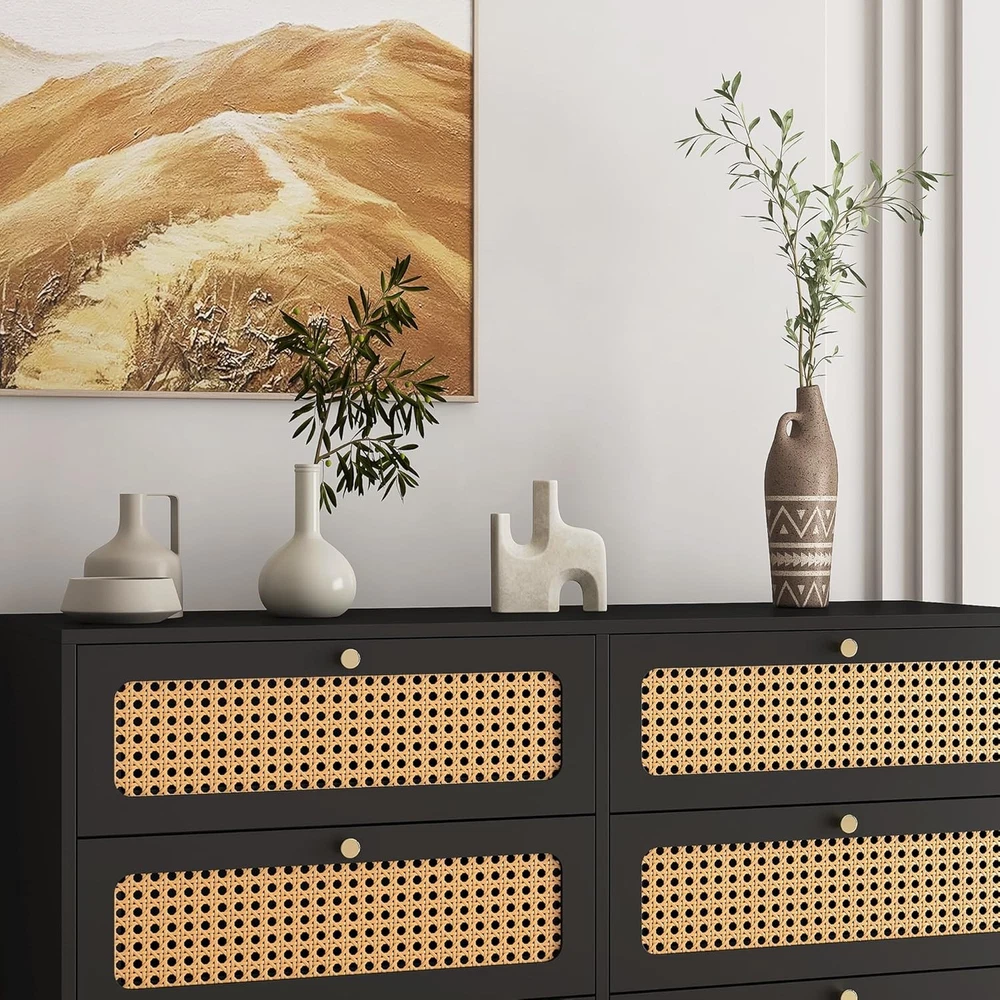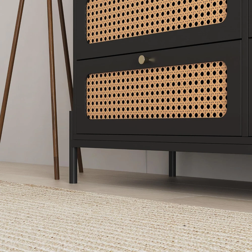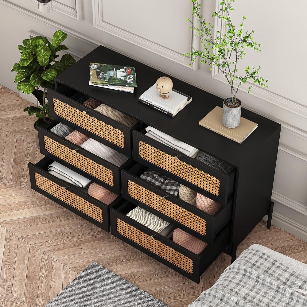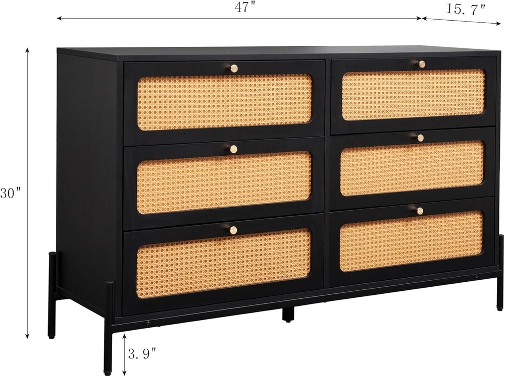 Product Description Specification Rattan 6-drawer dresser,rattan dresser cabinet,suitable for bedroom living room office and kitchen Main Color:Black Material:MDF Product Dimensions Assembled Length (in.):47.00 Assembled Width (in.):15.70 Assembled Height (in.):30.00 Weight (lbs.):90.38 Package Size Length (in.):53.54 Width (in.):20.07 Height (in.):9.84 Weight (lbs.):100.53 Product Features Product size (inch): W47*D15.7*30 Product weight: 90.38 pounds The 6-drawer dresser with simple design.Various decoration styles are compatible with this modern minimalist 6 drawer chest.Adding rattan door and classic gold metal handle to the simple monochromatic wood panel adds advanced aesthetics to this product. Six widened and enlarged drawers provide spacious storage space for your trivial sundries and meet your storage needs in every possible way.We choose thick MDF boards,which will provide solid stability to the product.Our products are also water and scratch resistant,so you can rest assured that you will have years of use. Simple design,is perfect for multiple occasions like office,bedroom and kitchen.Not only can be used as a clothing organizer/lingerie dresser,but also can be an accent storage cabinet for living room.Follow the instructions for a quick installation. Why Choose Our 6 Drawer Dresser? The 6-drawer dresser with modern design Rattan door and classic gold metal handle adds advanced aesthetics to this product.Six widened and enlarged drawers provide spacious storage space.Choose thick MDF boards which will provide solid stability to the productWater and scratch resistant,so you can rest assured that you will have years of use.Perfect for multiple occasions. On Aug 6, 2025 at 23:06:36 PDT, seller added the following information: