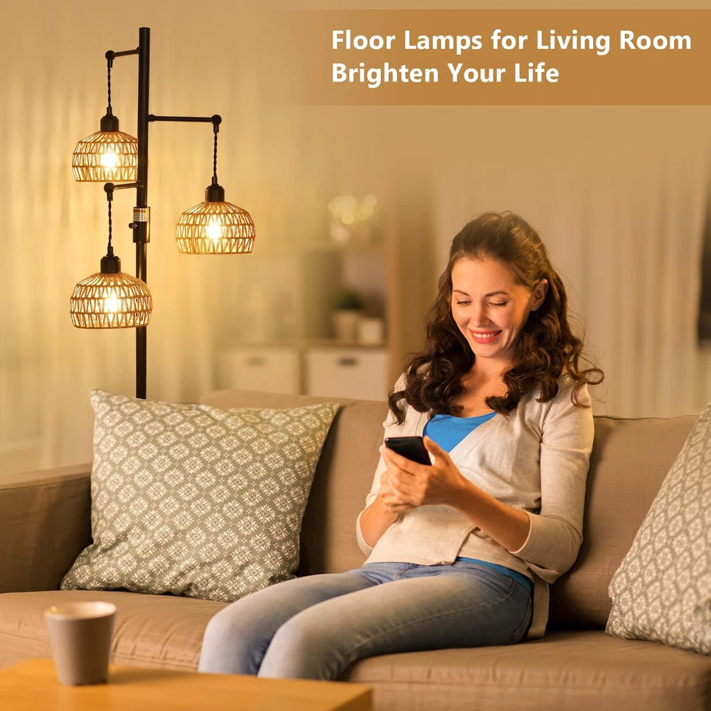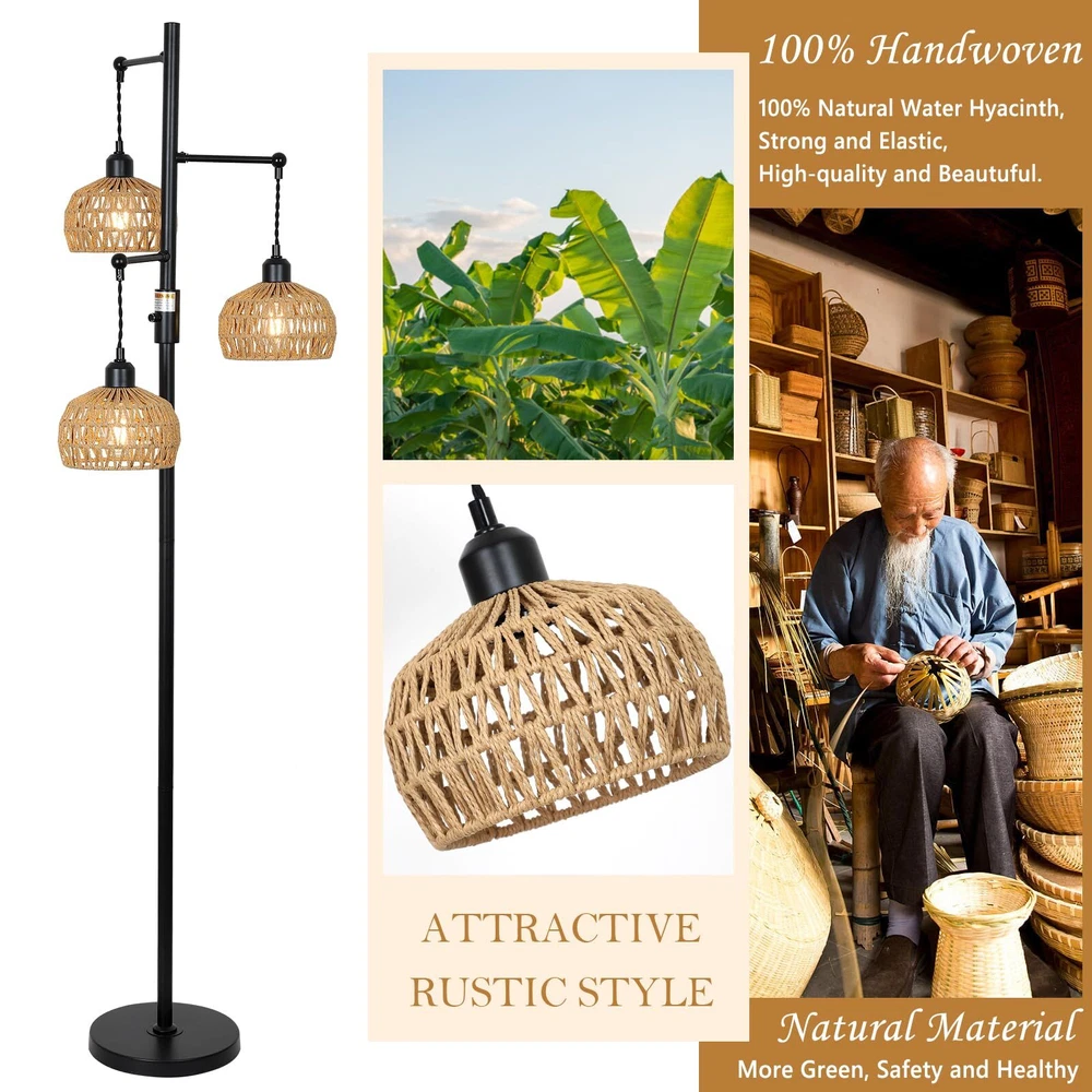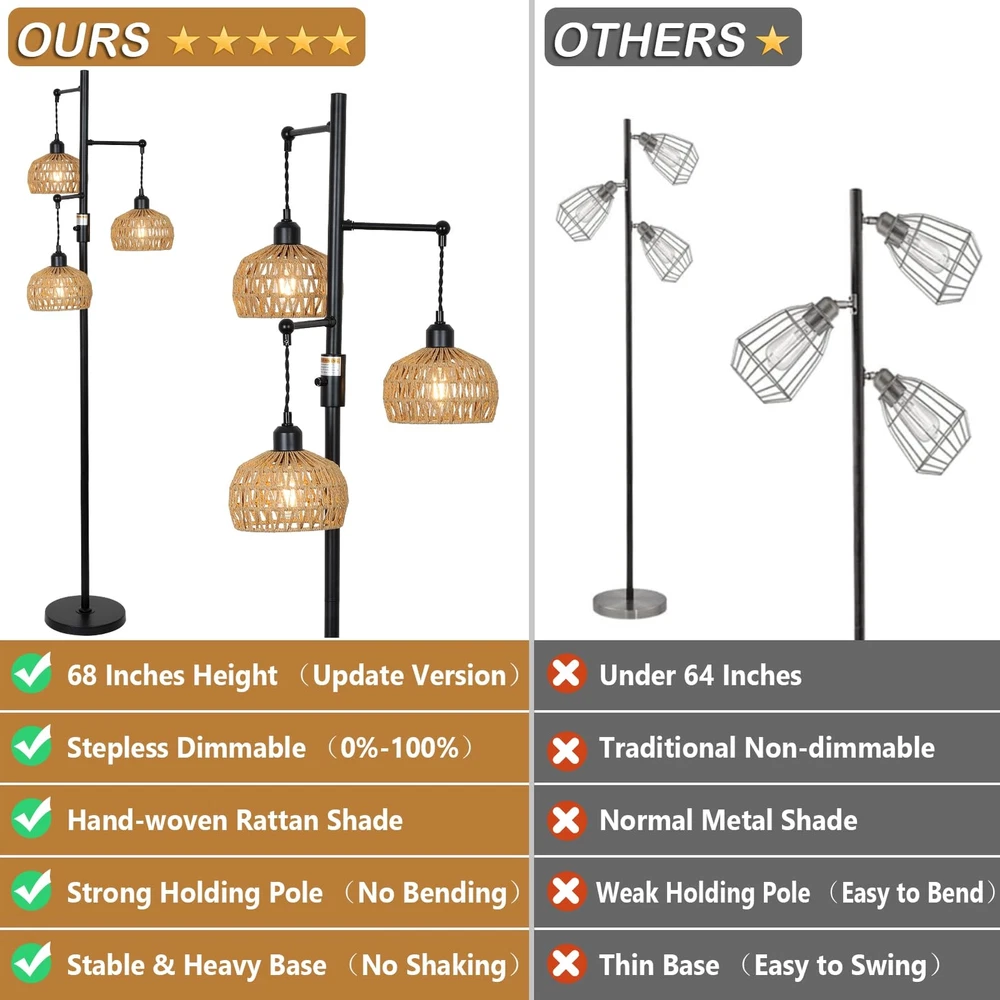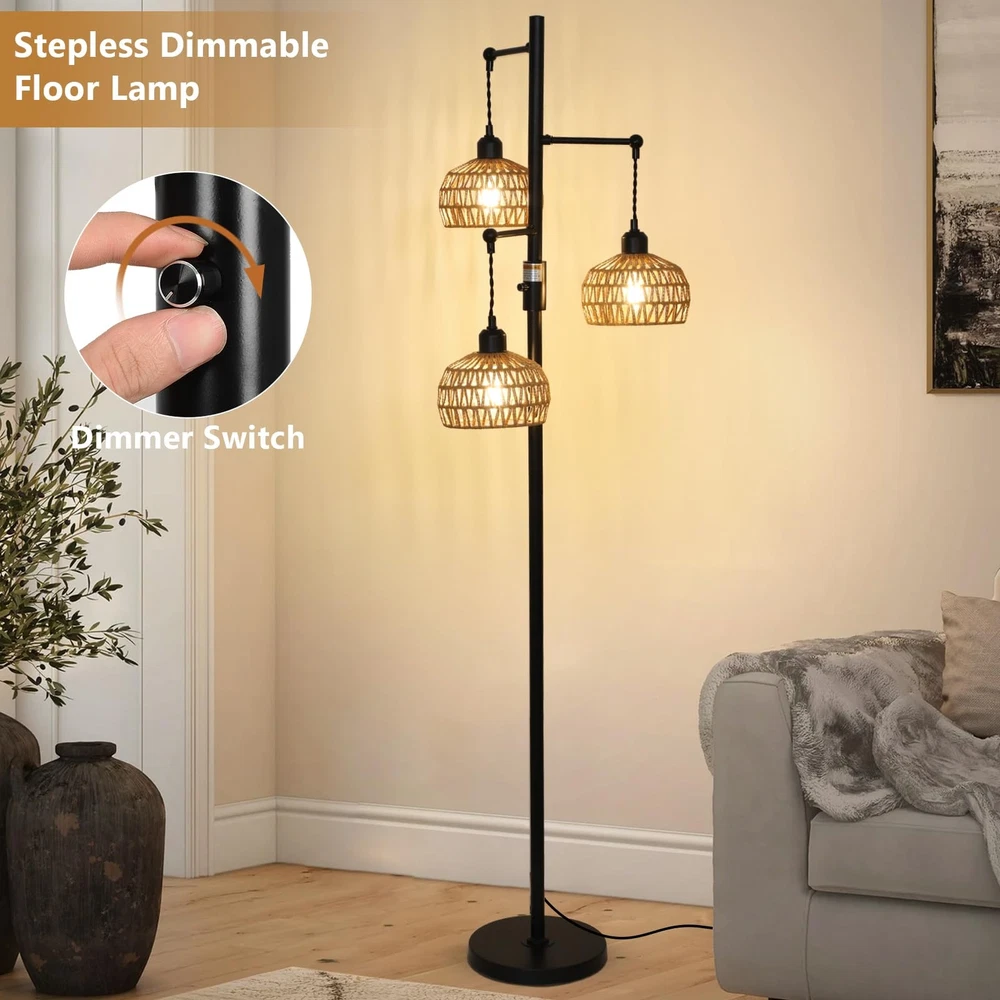 【Upgraded Stepless Dimmable Floor Lamp】Unlike the traditional non-dimmable floor lamps for living room, our boho floor lamp is fully Stepless Dimmable. Just simply twist the dimmer and then you can adjust the rattan floor lamp in the brightness range of 0 to 100% according to the needs of different scenes. Match for any indoor areas which including Living Room, Bedrooms, Dining room, Nursery, Office, Corridor, Basement, Sofa Corner and Reading Room. 【Natural Rattan Shade & Reinforced Base】This farmhouse floor lamp comes with 3 hand-woven rattan lampshades: Natural, Good light transmission and Soft light. Reinforced metal base: Made of non-slip material to ensure that it is stable enough and resistant to tip over, ensuring the safety of your home. Whether you install this rustic bohemian floor lamp in any room of home, you will be immersed in the warmth of the light and the wonderful ambience to enjoy! 【E26 UL Socket & Easy Installation】This 65inch rustic floor lamp is equipped with 3 E26 UL sockets, compatible with led, cfl, incandescent, tungsten and halogen bulbs (Bulbs Are Not Included, Max 40W, Dimmable Bulbs Only). We will provide you with detailed instructions and all the parts, so this floor lamp for bedroom can be easily assembled without any tools, you just need to follow the instructions to screw all the parts together. 【Ideal Choice & Safety Promise】3-Light design of this vintage floor lamp will bring a strong enough light to your home in all directions. All sockets, wires and switch of this farmhouse floor lamps for living room has passed UL certification, safe and reliable. 89inch long cable allows you to move this black floor lamp indoors at will. This unique floor lamp is ieal for your friends or family as a Christmas, birthday, housewarming, holiday suprise. 【24 Months Professional Service】√has been deeply involved in the lighting industry for more than 10 years and has a professional after-sales team. √We promise to provide you with 24-month parts replacement service. √If you have any questions about the tall tree floor lamp, we will provide you with professional services.