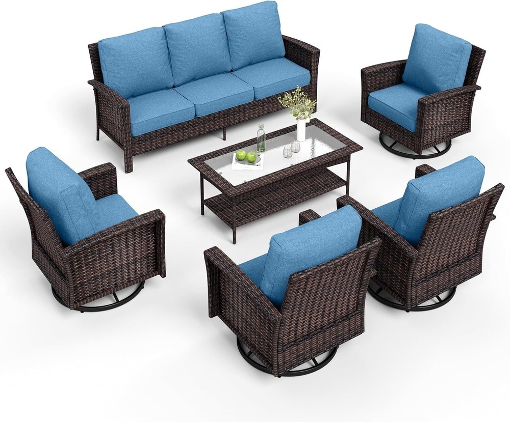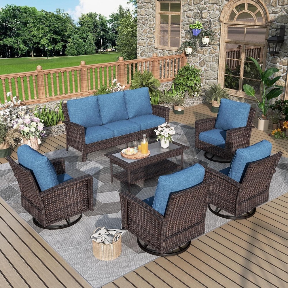 Manufacturer Warranty: 1 Year Department: Adults, Kids Country of Origin: China Cushion Color: Blue Model: Rattan Furniture gtin13: Does not apply Type: Wicker Furniture Brand: PHI VILLA Color: Blue Style: Outdoor Furniture Seat Depth: 24 in MPN: Does not apply Table Width: 23.6 in Material: Wicker For: Outdoor Furniture Set Table Shape: Rectangle For 3: Patio Furniture Set Chair Back Material: Wicker Seating Capacity: Up to 7 Umbrella Included: No Number of Items in Set: Seven-Piece UPC: Does not apply For 4: Rattan Furniture Assembly Required: Yes Set Includes: Cushions, ottomans, sofa Year Manufactured: 2025 Chair Height: 35 in Assembly Status: Part Assembled Table Length: 47.2 in Chair Color: Blue Features: Unltra Soft, Cushion Included Chair Width: 32.2 in For 2: Outdoor Conversation Set Cushions Included: Yes