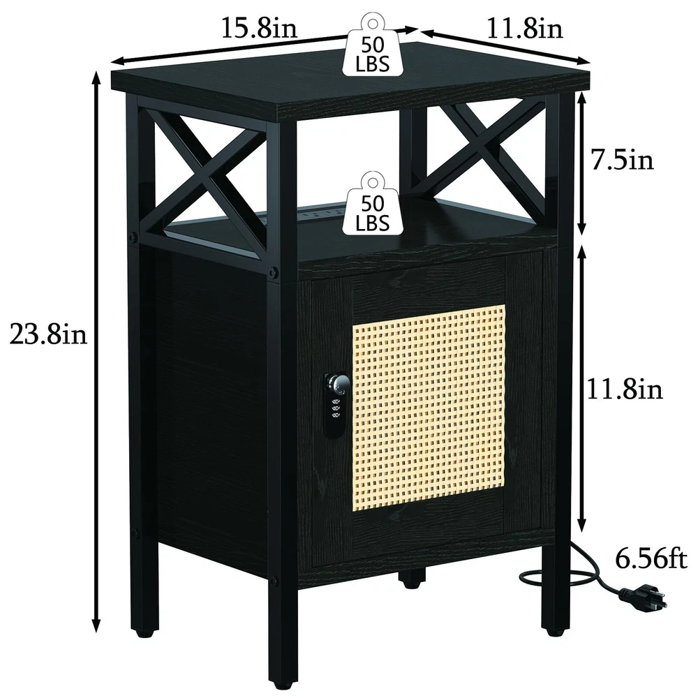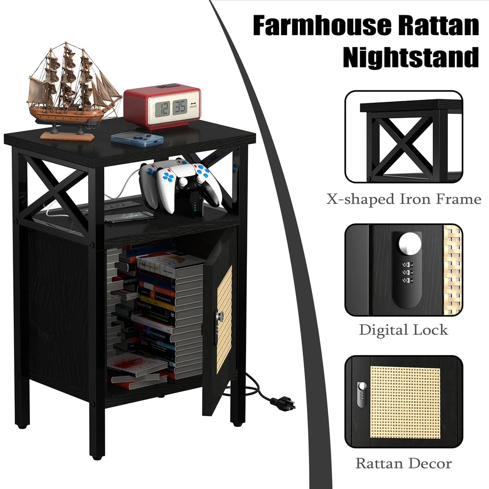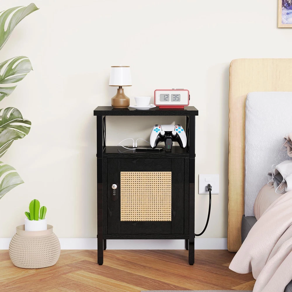 Nightstand with Combination Lock: Our nightstand upgraded a 3-number combination lock to keep your personal items safe and protect your privacy. It's always important to have a secure place to store your belongings, especially if you live with roommates or have guests over frequently. With a digital lock, your items are safe and secure. End Table with Charging Station: Upgraded charging station features 3 USB ports, 2 AC outlets, with a 6.5ft long power cord. Our rattan night stand allow you to charge multiple devices at the same time that will fully satisfy your charging needs, everything is within your arm's reach. Rattan Night Stand: The natural rattan nightstand blends modern style with Bohemian elements, making it suitable for various home decor styles. It can match any space in the bedroom or living room, small space as an end table, corner table, sofa side table. Rattan furniture adding charm to your home, it will be a part of your life. Large Storage Space: With multiple cabinet and shelves, this side table provides plenty of room to store your essentials such as books, magazines, and other personal items. The spacious storage area allows you to keep your bedside organized, making it easy to find things when you need it. Sturdy and Strong: This nightstand made from sturdy wood and natural rattan material, it is strong and sturdy, able to withstand daily wear and tear. The rattan bedside table is a strong and long-lasting piece of furniture that will provide you with years of use and enjoyment.