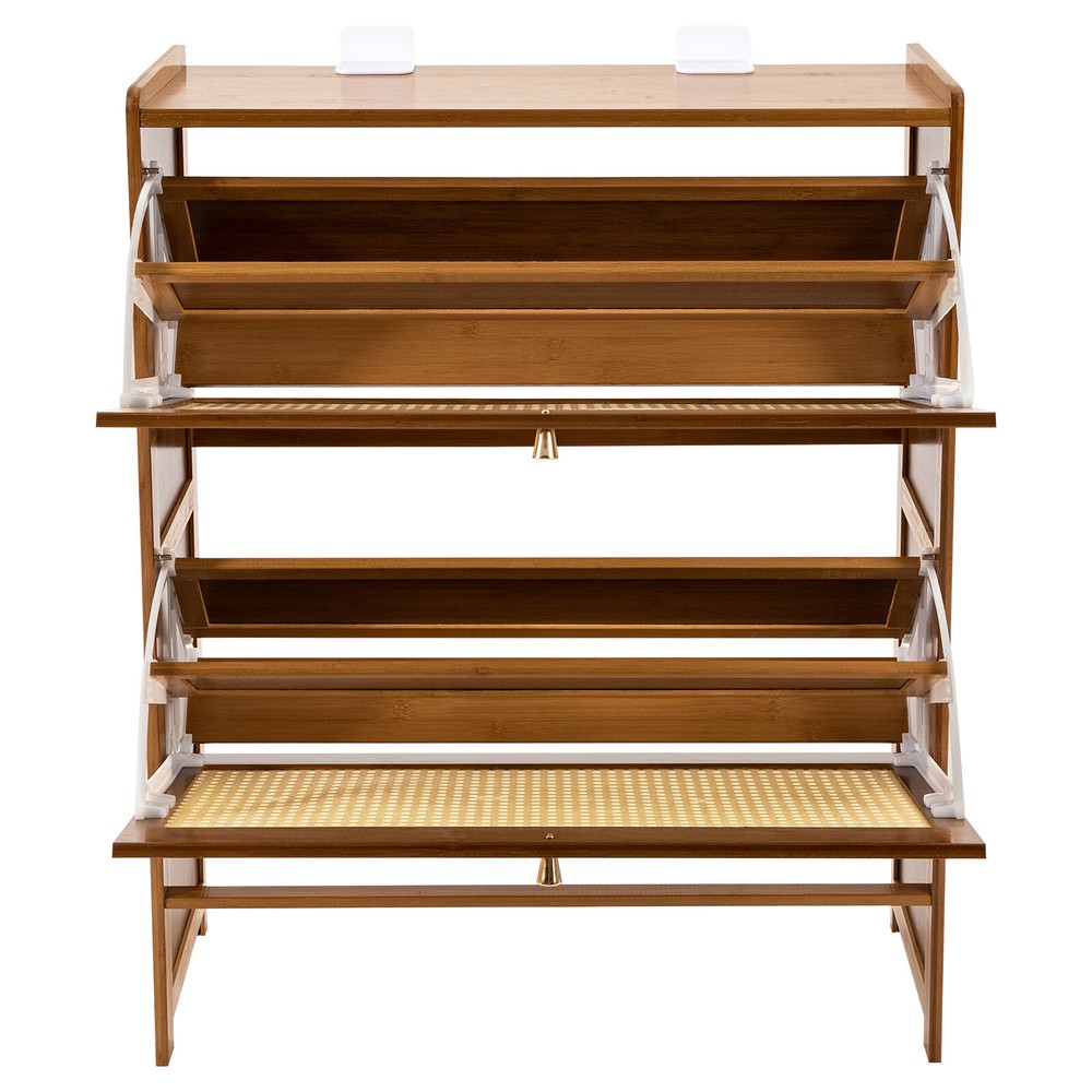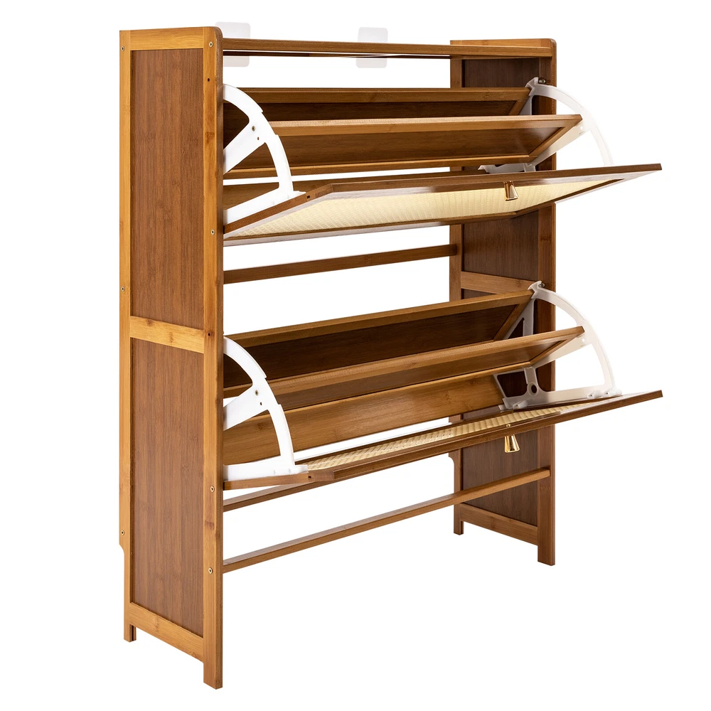 Rattan Shoe Cabinet 2 Flip Drawers Shoe Rack Storage Organizer for Entryway Home Description With strong stability and large capacity, this rattan shoe cabinet will win your favor! The 4-tier spacious space and the open space can provide sufficient capacity for storing various shoes, meeting the daily needs of your family, and making your space more tidy and orderly. The elegant wood grain and exquisite vines make it attractive and charming and can be integrated into any decorative style in the home. This is your ideal choice! Key Features High-end Materials : The premium bamboo with varnish, MDF, and plastic cement make this product sturdy and solid, ensuring a long service life without being easily scratched or damaged. High Stability : The thickened board, screw-reinforced stabilized structure, and stable feet help it to support about 16.5 lbs load-bearing capacity of each tier, keeping it in place and ensuring the safety of your items. Ample Storage Space : The 2 fold-out doors with 4-tier enclosed storage space and the open space can be used to store most slippers, sneakers, high heels, leather shoes, etc., making your shoes orderly and tidy to meet your daily needs. The top platform can also be used to place some small potted plants, keys, or photos, making it a practical and stylish storage area. Careful Design : The rattan doors are conducive to ventilation, preventing shoes from getting damp or moldy , and reducing the bacteria growth. The reserved skirting line posi tion makes it more tightly fit the wall, increasing stability while maintaining aesthetic decoration. Attractive Appearance: The wood grains paired with rattan and exquisite handles make it both beautiful and stylish, which well blends with your corridor, living room, bedroom, etc. while adding texture and beauty to your room. Space Saving : The 45-degree tilt angle helps maximize the use of vertical space to store more shoes in your room, corner, or hallway, making it ideal for compact spaces. Easy to Assemble : Simple construction, pre-drilled holes, and complete accessories help you achieve a quick installation, you just need to make sure all parts are properly nested. Effortless Clean-Up : The smooth surface and simple structure allow for easy access to all its components and you can wipe it with a clean towel. It can effectively isolate dust, reducing the hassle of frequently washing shoes. Customer Service : We are honored that you have chosen our product. We have sufficient confidence in the quality of the product so that you can buy it confidently. But if you have any questions, you can contact our customer service, he will patiently answer and solve your problems. Details Raised Baffle : The raised baffle can prevent items from falling off the countertop, and also allows you to hang an umbrella to achieve full utilization. Rounded Corners : The corners and edges are designed to provide a comfortable and safer touch. Fixed Brackets : Installing them at the junction of the countertop and wall can further improve the stability of the product and prevent shaking. Application It can be placed in the living room, bedroom, corridor, etc. to store flat shoes, high heels, leather shoes, short boots, sports shoes, slippers, etc. Specification Color: Tea Color Shape: Rectangular Mounting Type: Floor Mount Assembly Required: Yes Material: Bamboo, Plastic Cement, MDF Finish: Varnish Number of Shelves: 3 Special Feature: 2 Flip Rattan Doors Room Type: Entryway, Bedroom, Hallway Product Care Instructions: Wipe with Damp Cloth Each Tier Load-bearing Capacity: About 7.5kg/16.5 lbs Tier Height: 33cm/13in Bottom Height: 14.5cm/5.7in Product Size: 70*24*87cm/27.5*9.4*34.2in Package Included 1* Rattan Shoe Cabinet All Accessories for Assembly Notes Please note that shoes, flower pots, and other items are not included. Please allow the slight color difference caused by the shooting light and 1-3cm error due to manual measurement and make sure you do not mind before ordering. Payment Delivery details Terms of sales About us Contact us Payment We accept ebay payment 。 Fees such as import duties, taxes are not included in the item price or shipping costs. These charges are the buyer's responsibility. Delivery details Shipping: 2-9 working days to: USA Terms of sales We maintain high standards of excellence and strive for hundred percent customer satisfaction. Feedback is very important to us. We hope that you contact us immediately before you give neutral or negative feedback, so that we can address your concerns. It is impossible to address issues if we do not know about them! About us Your satis faction is our ultimate goal. We work hard to earn your trust and future business. Our certified technicians have tested each item before shipping. The unit comes with 1 year limited warranty on all manufacturing defects. a) If you receive a defective item, you may return it or ask for a discount. Please contact us within 14 days after you receive the package. b) What you returned must be intact and in its original packaging as re? u. Customer is responsible for shipping costs of the returned item. c) We will cover the cost of shipping back t with the shipping rate indicated in the registration page. We will send you a new unit or refund the full payment you paid. Thank you. Contact us Business Hour Business Hour: Monday To Friday: 8:30 AM to 5:00 PM (Beijing China time) Due to time zones, our reply to your questions may not be immediately. But within above working time, we will reply your email within 24 hours. If it's non-workdays, please kindly be patient and wait till Monday. Please contact us with ebay message. Please feel free to contact us if you have any questions. Monday To Friday: 8:30 AM to 5:00 PM (Beijing China time) Due to time zones, our reply to your questions may not be immediately. But within above working time, we will reply your email within 24 hours. If it's non-workdays, please kindly be patient and wait till Monda