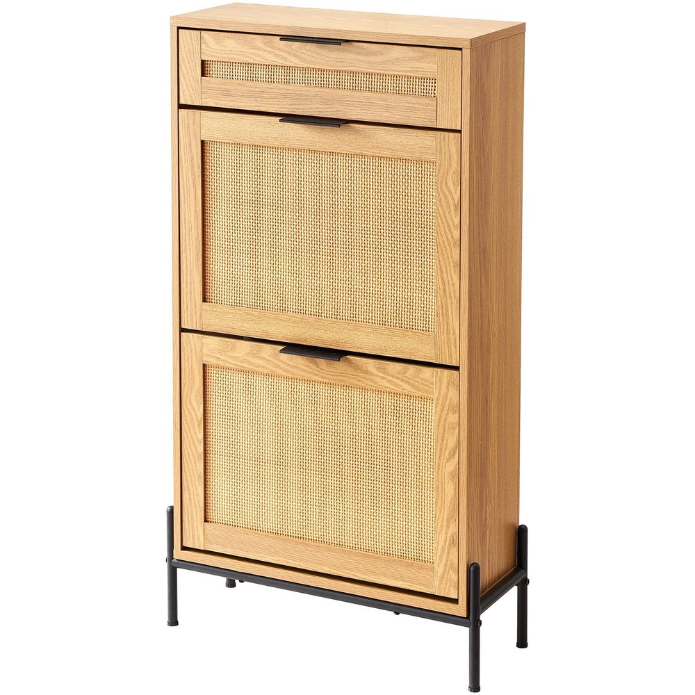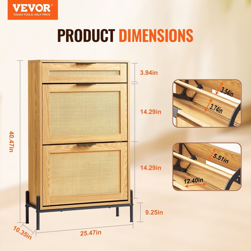 Transform your entryway with VEVOR multifunctional rattan shoe cabinet! Featuring an innovative space-saving design, this rattan shoe cabinet allows you to easily access your favorite shoes while neatly hiding them away when not in use, keeping your entryway tidy. The intelligent layered design creates a perfect system for managing your shoes. Each pair has its own dedicated space, making it easy to organize and quickly find the shoes you want to wear in this rattan shoe storage cabinet. This multifunctional design meets various needs, making it suitable not only for entryways and hallways but also for closets and dressing rooms. Using the shoe cabinet as versatile furniture enhances overall home harmony and aesthetic appeal. With its classic rattan finish, metal supporting legs, and aluminum alloy handles, this rattan shoe rack is simple yet stylish, seamlessly blending with various home decor styles to achieve a coordinated and beautiful look. Crafted from high-quality materials, the side panels and tabletop thickness have been reinforced to 15mm, ensuring the durability and wear resistance of this shoe storage entryway cabinet, designed to withstand everyday use.