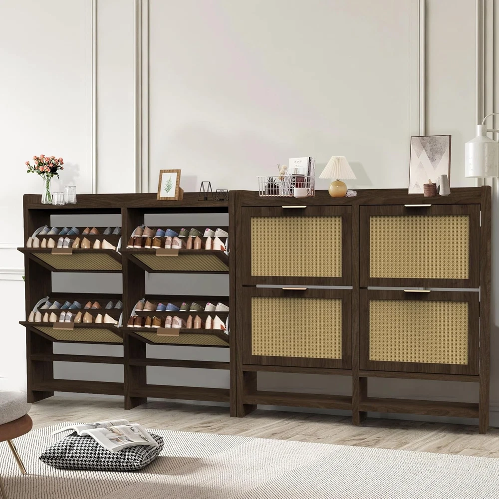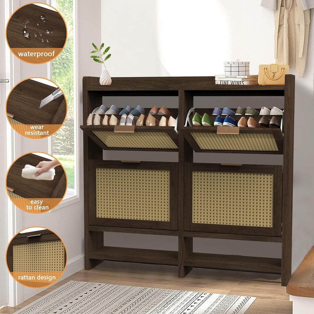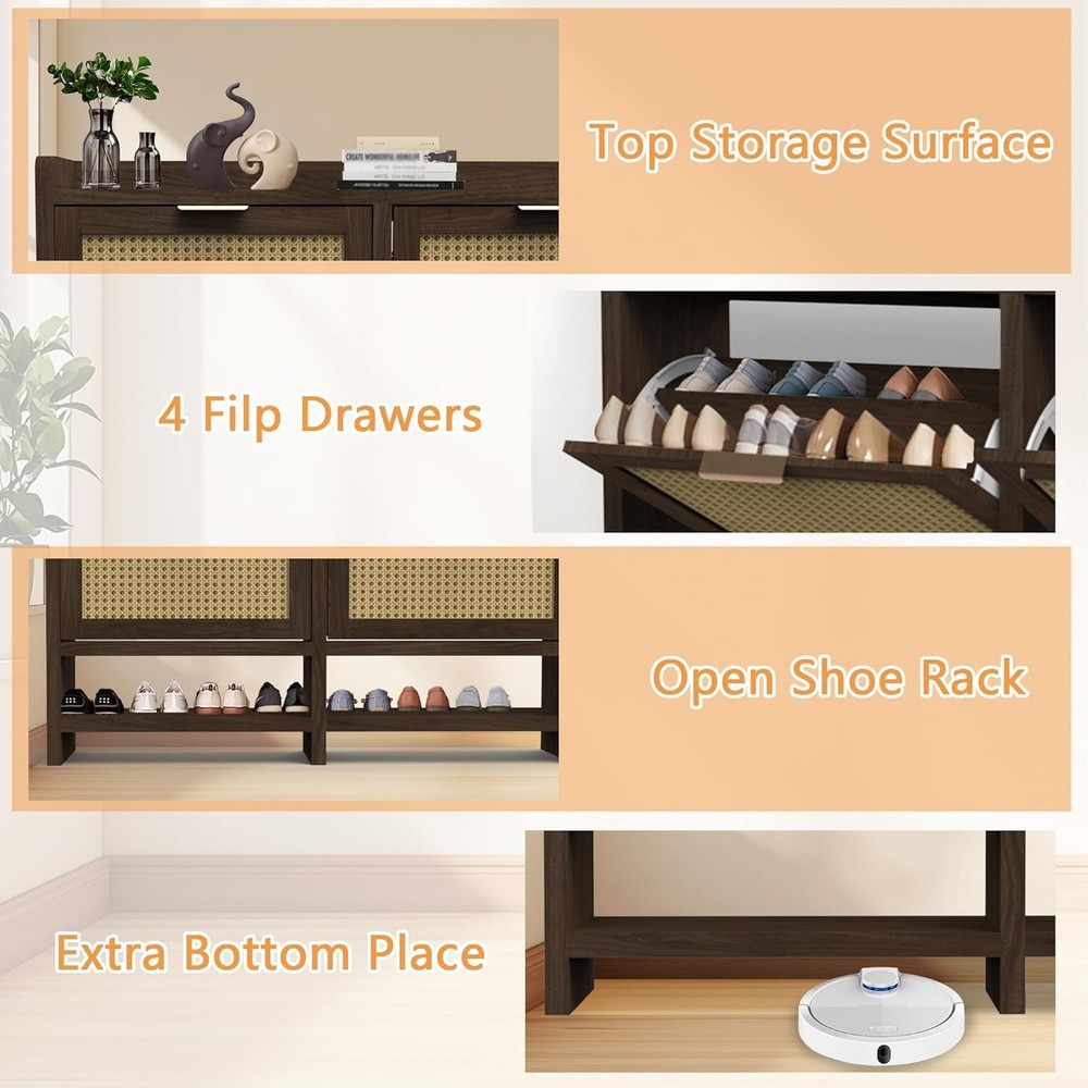 Rattan Shoe Cabinet with 4 Flip Drawers and Extra Storage Shelf - Freestanding Narrow Design