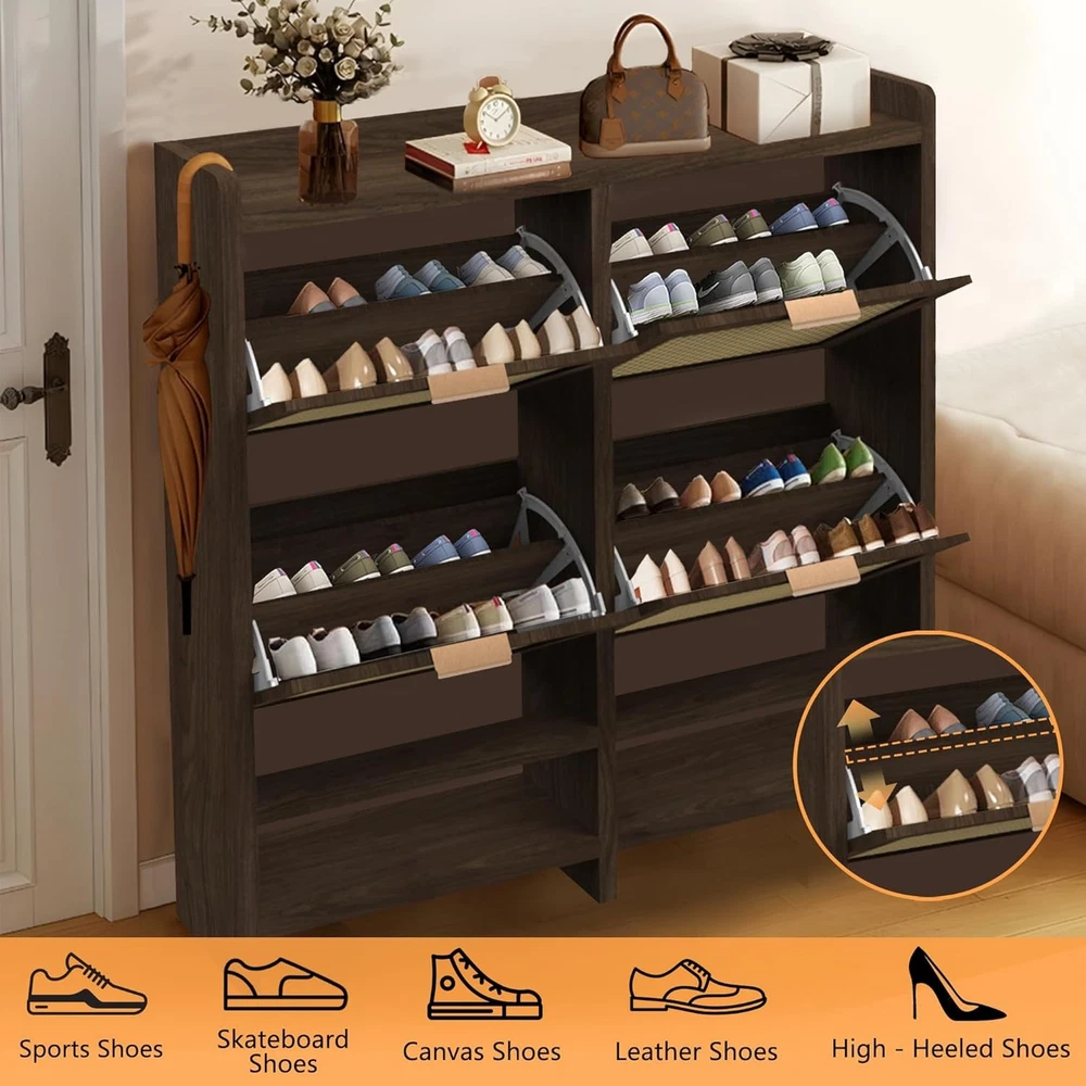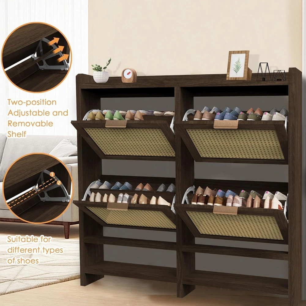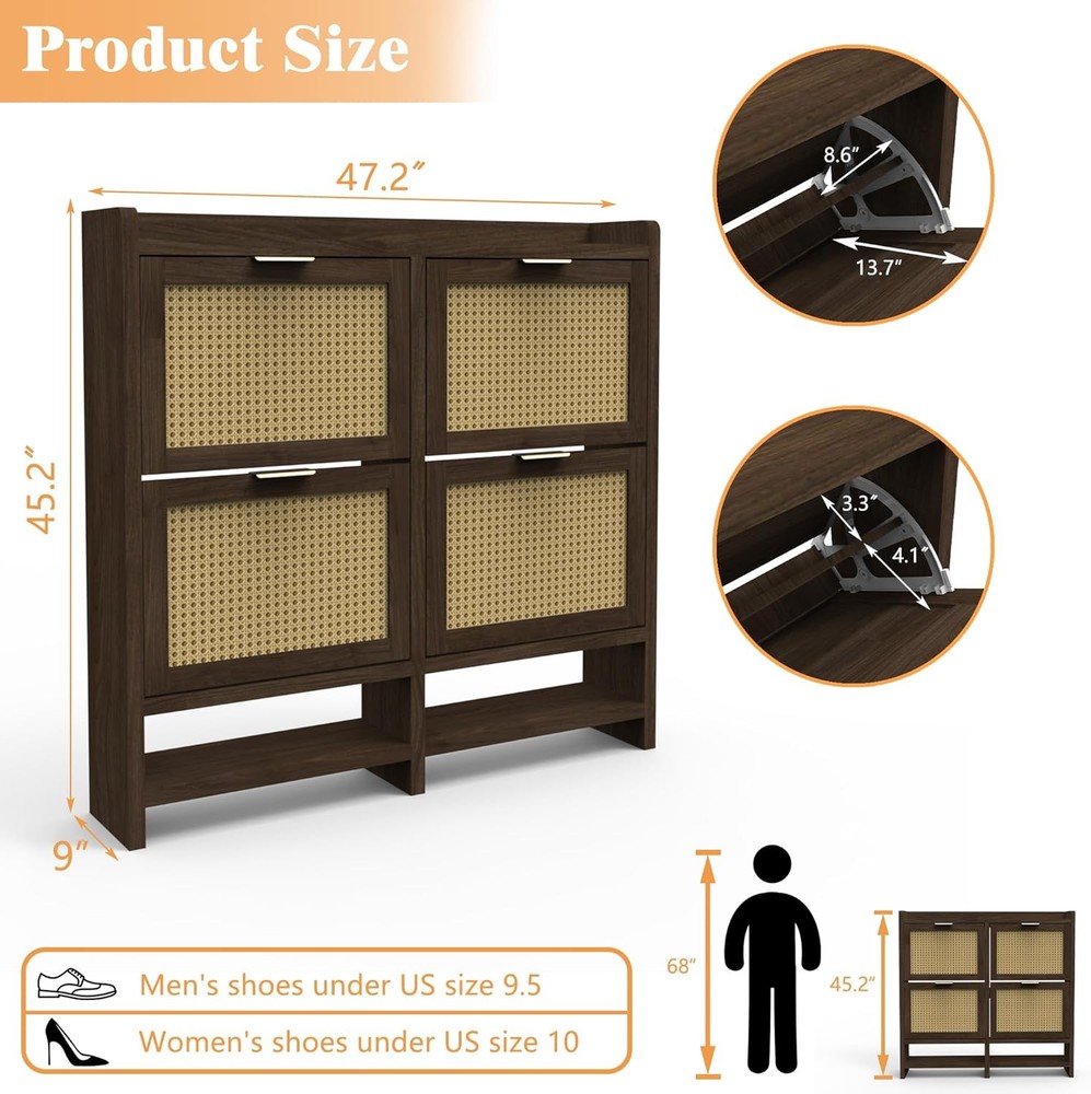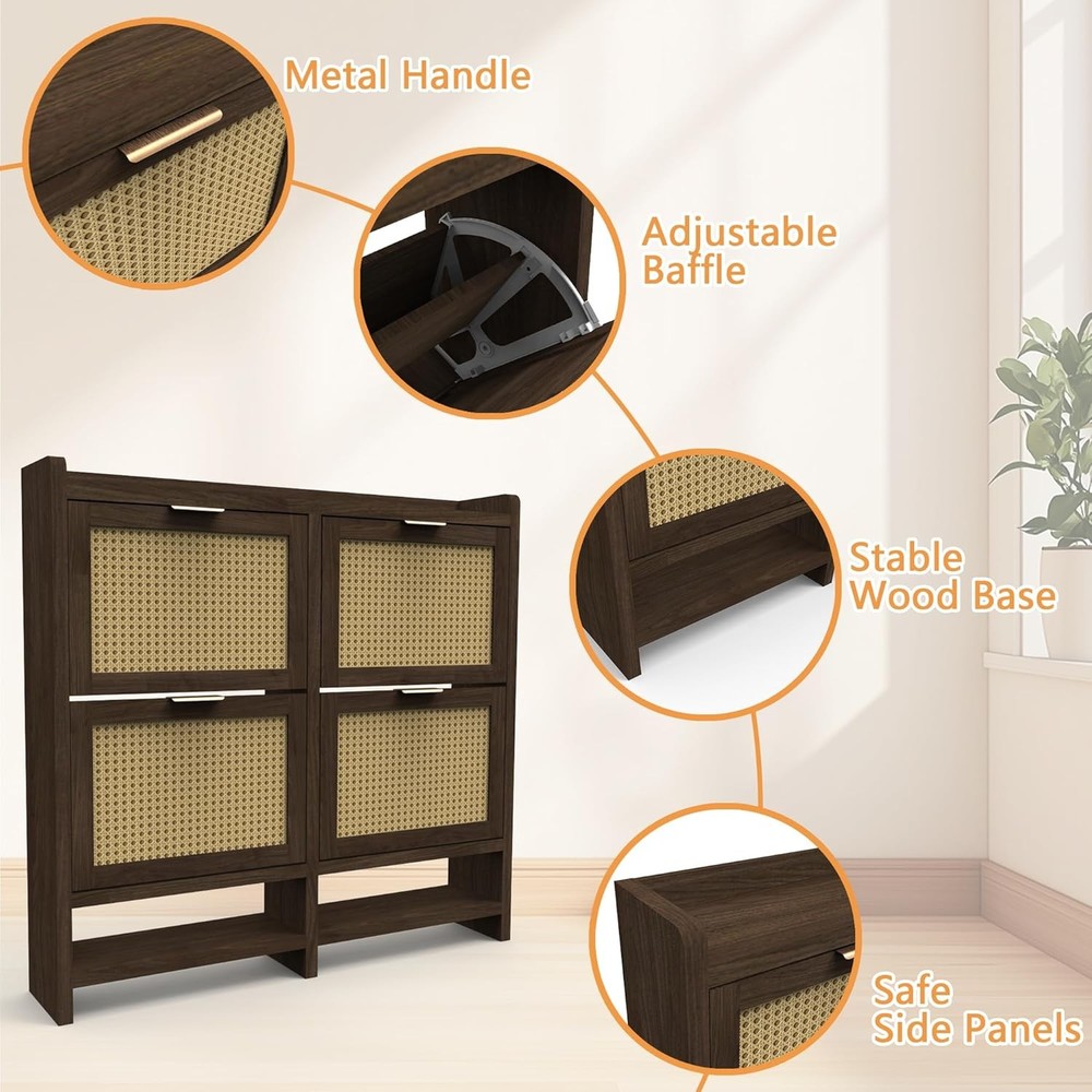 Shoe Cabinets with 4 Rattan Flip Drawers and Extra Storage Shelf, Freestanding Narrow Shoe Organizer Rack for Entryway, Brown Oak Product Description About this item 【Boho Shoe Cabinet】The shoe cabinets with 4 ratten flip drawers, wooden frame and smooth handles which enhance the mid-century design of the entry way. This stylish and rustic shoe dresser is suitable for hallway, living room, or porch. 【Drawers and Extra Shelves】Our entryway cabinet with four fliped drawers and extra shelves provide large storage space to meet your shoe storage needs. Each drawer contains 2 layers of storage space and can be easily taken and divided into shoe sections. The panel can be adjusted or removed. 【Solid and Premium】Crafted with durable MDF wood for long term use, this four drawer narrow shoe cabinet with a strong structure and great weight capacity to hold your shoes. We also provide thick legs and anti-tipping device to prevent hazards. 【Space Saving】This slim shoe cabinet top is scratch-resistant, waterproof, and easy to clean, offers ample storage for picture frames, keys, wallets. This hidden shoe storage bottom space is ideal for storing slippers. It is an unique gift for him her dad kids. 【Easy to Assemble】All necessary accessories are included with our detailed instructions, precise holes and coded parts, you can easily create this entrance shoe cabinet. If there any problem, please contact us for a replacement or a solution for you. Thickened Board Metal Handle Rattan Door Wood Frame Sturdy Base Anti-tipping Device Adjustable Drawer Anti-Drop Shield Fliped Drawer for Daily Use Extra Shelves for Common Shoes