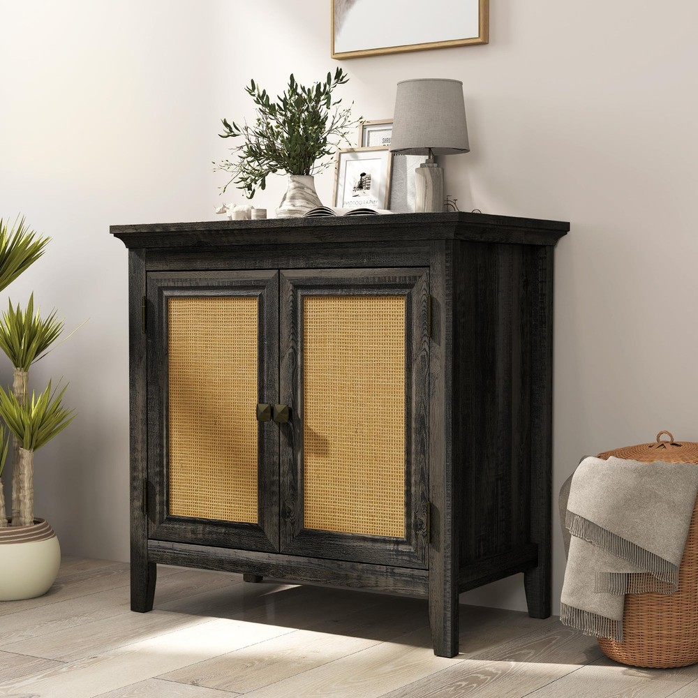 Charming Rattan Design: Our sideboard cabinet combines wood grain panels with natural rattan, creating a delightful boho-chic vibe. Diagonal bronze knobs add a unique touch, adding warmth and organic elegance into any room. Generous Storage: Featuring an adjustable inner shelf that can be set at three different heights, our rattan cabinet offers ample space. It easily accommodates tall wine bottles, low plates, and dinnerware, ensuring a tidy and organized space. Sturdy Construction: Crafted from robust P2-grade MDF and breathable natural rattan, this accent cabinet guarantees durability and safety. An anti-tipping design adds extra security for you and your family. Versatile Use: Whether as a storage organizer, sideboard, or buffet cabinet, its compact size fits seamlessly in living rooms, dining rooms, kitchens, or entryways. Keep essentials within easy reach and enhance any space with its practical design. Easy Assembly & Cleaning: Overall dimension is 28" W x 16" D x 27" H. Our sideboard cabinet includes clear instructions and hardware for easy assembly. For upkeep, simply wipe it clean with a cloth to keep its pristine appearance effortlessly.