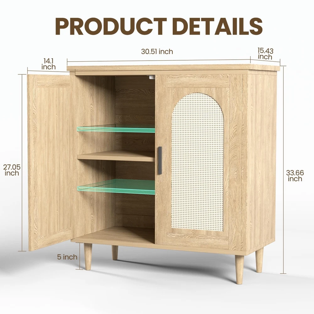 【Durable & Stable Structure】Crafted with premium MDF (high-density fiberboard),this cabinet combines sustainability and strength.MDF’s humidity-resistant-resistant,warp-proof design offers 20-30% higher load capacity than standard wood,with lower expansion rates (<0.3% in humidity) to keep doors flawlessly aligned. Includes anti-tip hardware for secure wall-mounted installation, minimizing tipping risks. 【331L Versatile Storage】Dimensions: 14.96"D x 47.43"W x 28.54"H. Two spacious compartments and two adjustable shelves fit tall wine bottles, short plates, shoes, or small items—ideal for organizing while keeping hazards away from kids/pets. 【Timeless Farmhouse Charm】Blends bohemian-inspired rattan doors with modern wood finishes.Perfect as a buffet,sideboard,credenza,TV stand,or coffee table.Seamlessly complements entryways,living rooms, or bars for understated, textured elegance. 【Built-In Power Hub】Features 2 AC outlets + 2 USB ports to power entryway lights,coffee makers,bar accessories,lamps,phones,and more.Streamline charging—no messy cords! 【Easy to Assemble】All components are labelled,and comes with detailed instruction and provided tools,this rattan sideboard will be engaged in work and refresh your dining room,hallway,entry,living room quickly