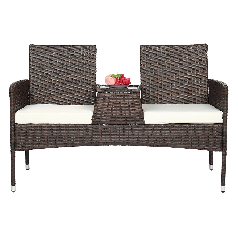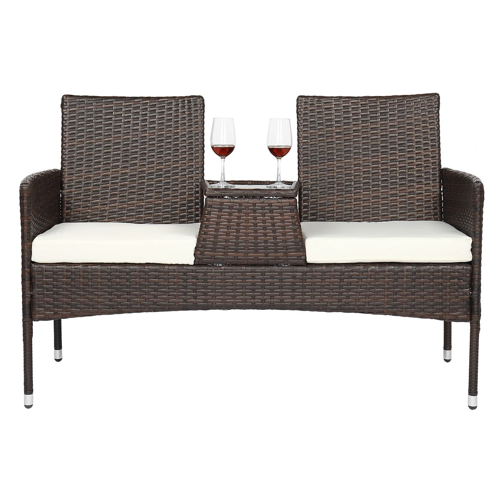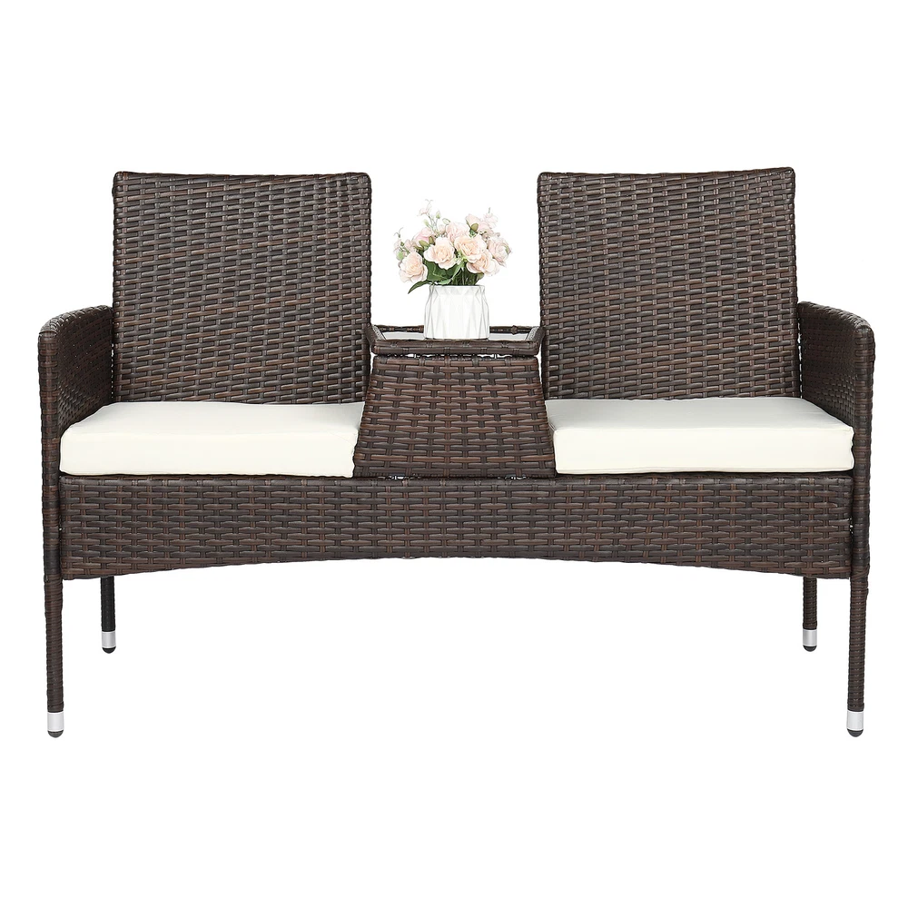 Specifications: 1. Material: PE Rattan Iron Sponge Polyester Cloth Tempered Glass 2. Color: Brown Gradient Rattan Mat Black Tempered Glass 3. Product Specifications: Overall Size: 130*59*84cm(L x W x H) Seat Size: 44*45*40cm(L x W x H) Coffee Table Size: 25 (Front) /31 (Back) *49cm Backrest Size: 45*48cm(L x W) Handrail Height: 63cm Mat Thickness: 8cm Glass Size: 26*20.7*0.5cm(L x W) 4. Single Seat Bearing Capacity: 150kg 5. Weight: 12.4 Kg Package Includes: 1 x Lover Chair 2 x The Seat Cushion 1 x English Instruction Manual 1 x Assembling Hardware Accessories Introductions: Are you looking for a comfortable chair for your family? If so, thisLover Chair Brown Gradient is highly recommended to you. Unlike normal leather chair, this rattan chair will give you a different using experience. Adopting high quality PE rattan and iron frame, it features stable, sturdy and durable. So what are you waiting for? Don't hesitate, it's worth buying! Features: 1. Made of high quality PE rattan and iron frame, stable, sturdy and durable 2. It has a service, durable in use 3. This chair set can meet your daily need 4. Concise design and exquisite workmanship 5. It can coordinate with any style of decoration