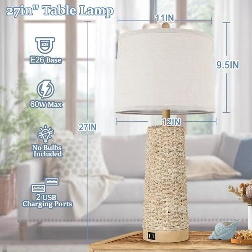 Return Policy Fast Delivery Trusted seller Rattan Table Lamp Set of 2, 27 inch Large Wicker Table Lamp with Dual USB Charging Ports, Boho Bedside Lamps for Nightstand Bedroom Living Room End Table with Rotary Switch Product Description 【Hand Mande Rattan Design】This set of 2 wicker lamps frame is wrapped with detailed rattan, which makes this wicker table lamp more elegant, and it is a perfect blend of nature and home, suitable for a wide range of decorating styles, such as beach style, modern farmhouse style, bohemian style, etc. Whether adorning a cozy reading nook, an elegant office space, or a serene bedroom, the Woven Rattan Desk Lamp brings a touch of refinement to any setting. 【Useful Dual USB Charging Ports】Equipped with 2 built-in charging port, it is a convenient charging station for your electronic devices, including smartphones/pad/watch and other gadgets. Keep your devices powered up and within reach as you work, study, or relax. 【Easy to Install】The installation of the rattan lamps is very simple and come with detailed instructions, you just need to follow the instructions to install all the parts together, the whole process only takes a few minutes! 【Rotary Switch Design】It is easy to use and durable as fewer electronic components that could wear out over time.The switch is energy-efficient and the presence of a rotary switch can evoke a sense of nostalgia and classic design, which can add a touch of vintage charm to the end table lamp's overall look. 【Large Size】This rattan table lamp is larger than the average table lamp, measuring approximately 27 inches in height, and the shade measures approximately 10 inches high and 12 inches in diameter, making it suitable for placement at end table and nightstand table. Shipping Returns Payment Shipping Shipping is FREE to all addresses other than APO/PO boxes in the lower 48 states. All our stock ships from US-based warehouses. Shipped via USPS or UPS (depending on location and package weight) Unless stated otherwise, all orders will ship within 24-72 hours of your payment being processed. Check our feedback to see the great reviews of FAST shipping we offer. Returns Seller does not accept returns Payment We currently accept payment via eBay managed payments only. Once payment is cleared, we will dispatch your shipment within 1-3 business days. Please refer to the "Shipping" tab for more information regarding shipping speed to your destination.