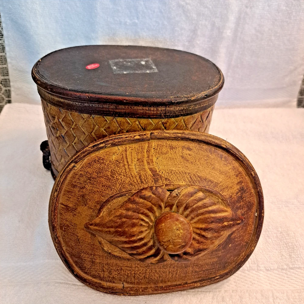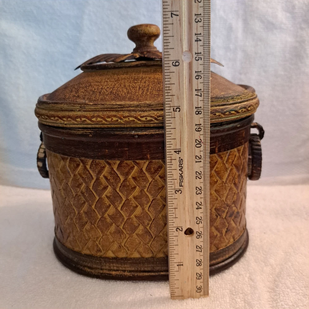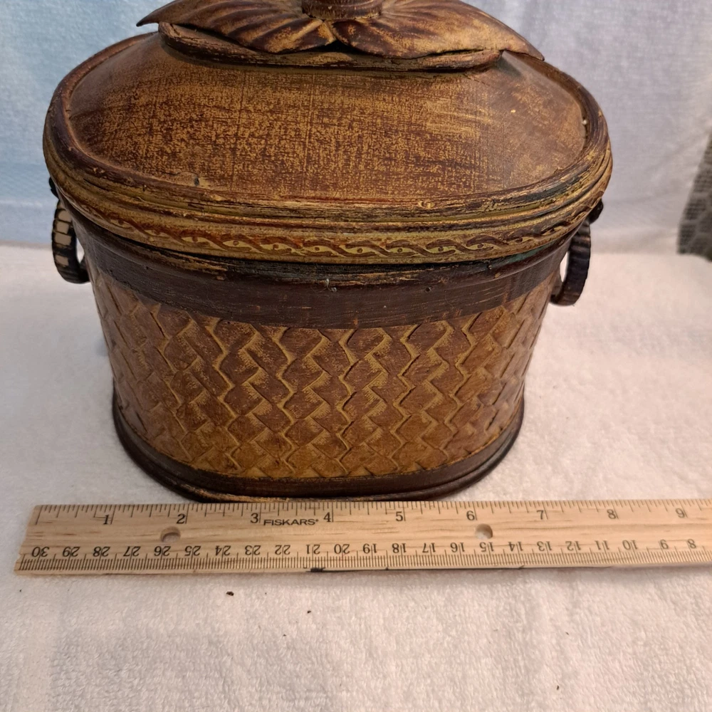 Welcome to my collection of pre loved home decor and accent treasures. Downsizing household and handmade crafted items. This box was used to store my bulk tea, always in a plastic container, but can be used for many storage ideas. Well made .This Rattan & Wood Storage Box features a charming woven design with a carved leaf lid, perfect for tea or other small items storage. The medium-sized box is suitable for various occasions and rooms in your home, with a bohemian style and textured finish. Made of wood and rattan, this storage box has a lid for secure closure and is easy to clean with a damp cloth. Its unique design and brown color make it a lovely addition to any room, adding a touch of natural elegance to your décor.