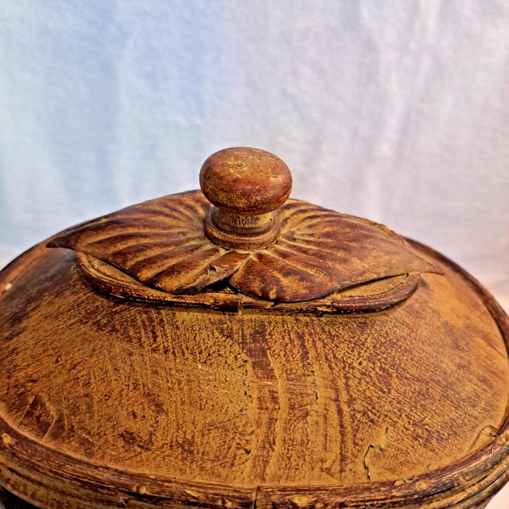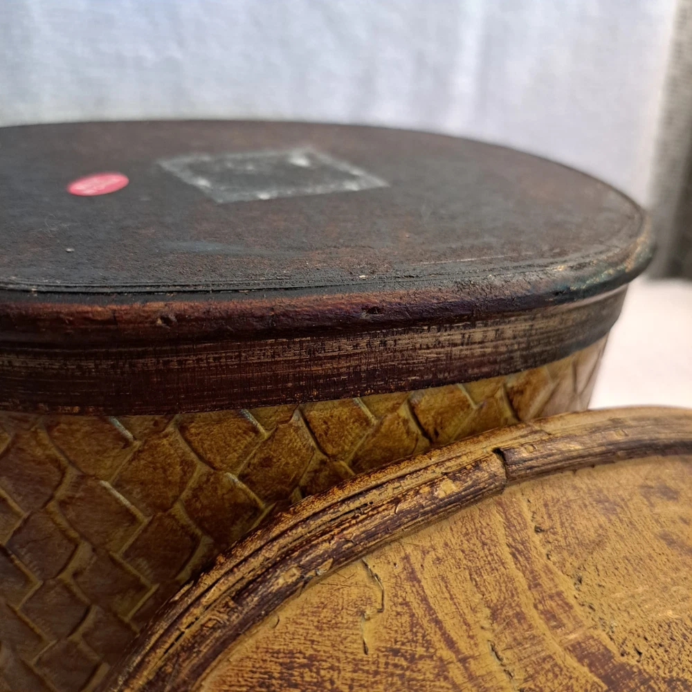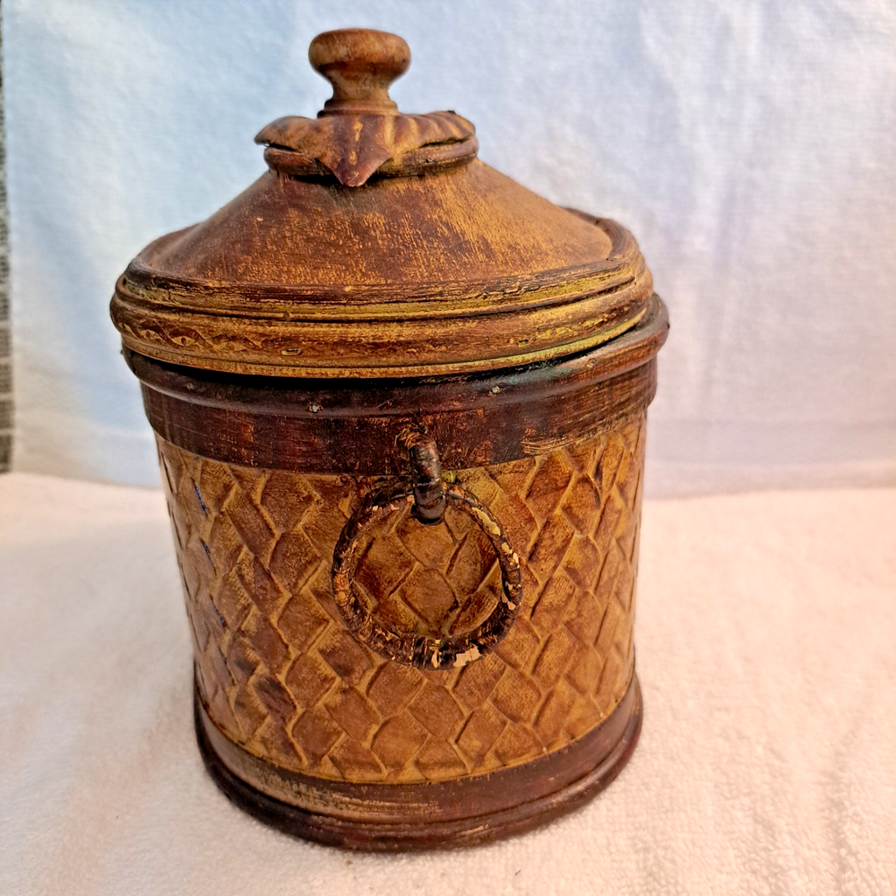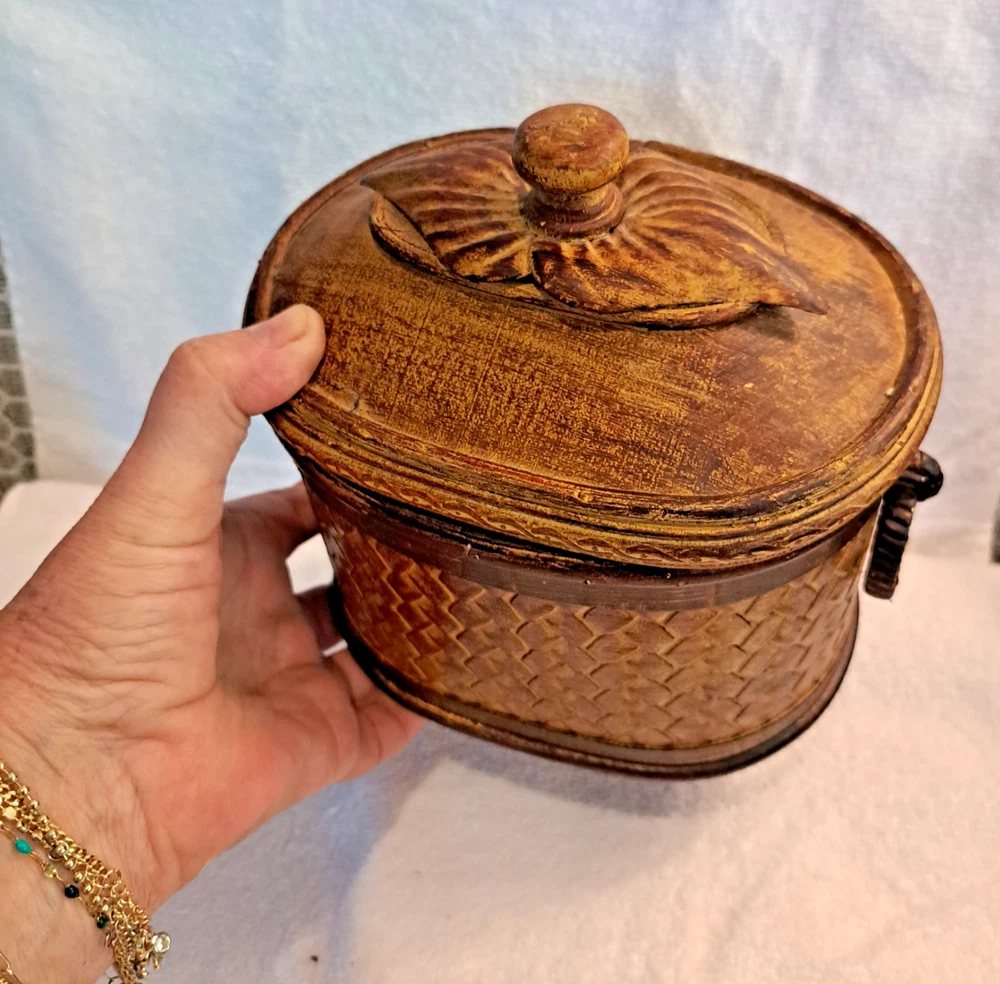 Welcome to my collection of pre loved home decor and accent treasures. Downsizing household and handmade crafted items. This box was used to store my bulk tea, always in a plastic container, but can be used for many storage ideas. Well made .This Rattan & Wood Storage Box features a charming woven design with a carved leaf lid, perfect for tea or other small items storage. The medium-sized box is suitable for various occasions and rooms in your home, with a bohemian style and textured finish. Made of wood and rattan, this storage box has a lid for secure closure and is easy to clean with a damp cloth. Its unique design and brown color make it a lovely addition to any room, adding a touch of natural elegance to your décor.