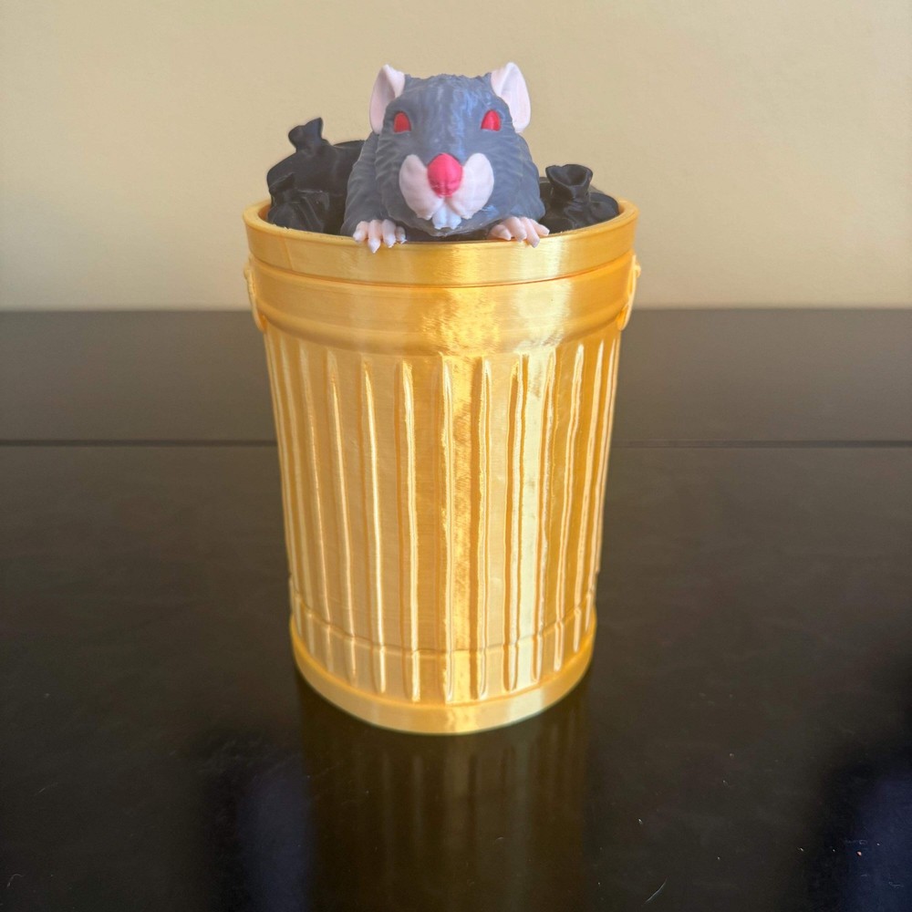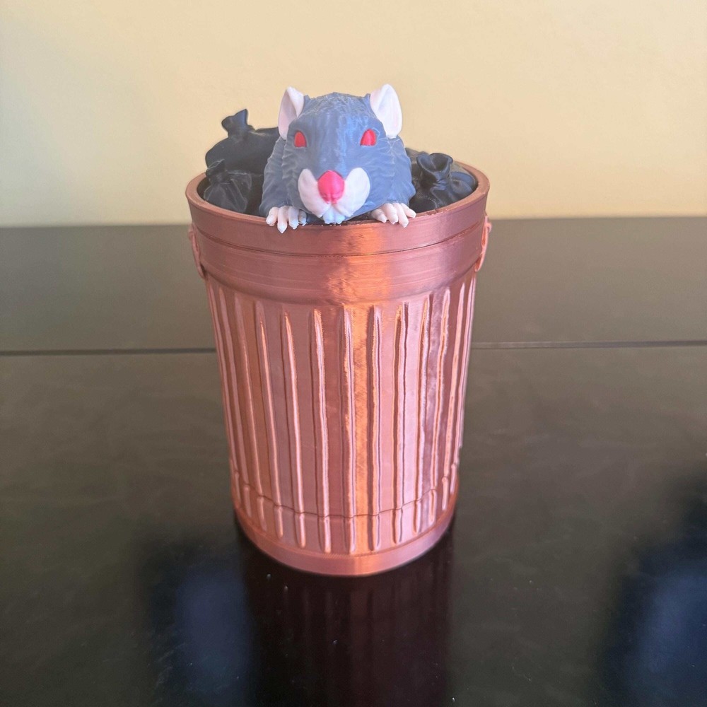Rat trash can MTG Deck Box | Pokemon | YuGiOh | Commander | Deck Box for 100 Cards | Magic the Gathering | EDH Elevate your Magic: The Gathering experience with a personalized, stylish, and highly durable deck box designed to securely protect your cards. Crafted with a rigid 3D-printed design, this innovative accessory makes an ideal gift for MTG enthusiasts on any occasion. Keep your deck organized and ready for battle with this versatile and premium deck box! If you want something else added or a color not listed just message me and I will see what I can do. Holds a Commander deck (100 cards with double sleeves) in the Trashcan – All the space you need, no need to go dumpster diving else where. Bottom of the trash can also works to store dice. This file was not designed by me as it was made by https://cults3d.com/en/users/SneakyPandaDeckbox/3d-models Elevate your Magic: The Gathering experience with a personalized, stylish, and highly durable deck box designed to securely protect your cards. Crafted with a rigid 3D-printed design, this innovative accessory makes an ideal gift for MTG enthusiasts on any occasion. Keep your deck organized and ready for battle with this versatile and premium deck box! If you want something else added or a color not listed just message me and I will see what I can do. Holds a Commander deck (100 cards with double sleeves) in the Trashcan – All the space you need, no need to go dumpster diving else where. Bottom of the trash can also works to store dice. This file was not designed by me as it was made by SneakyPandaDeckbox