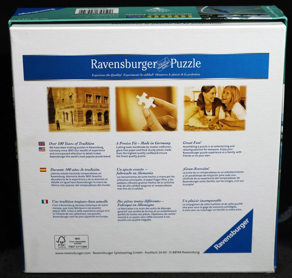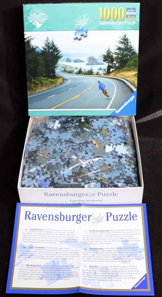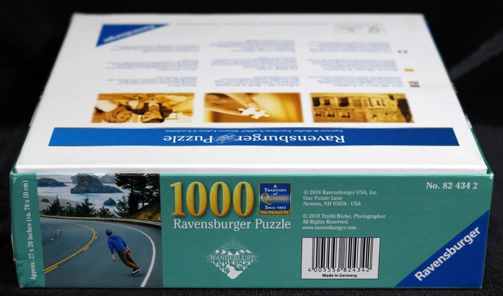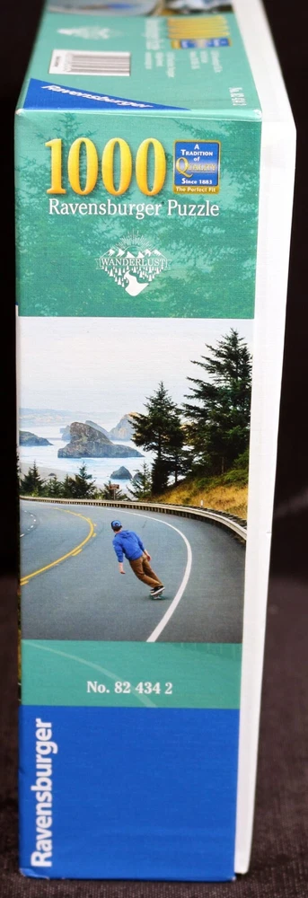 Experience the thrill of skateboarding along the Oregon coast with this Ravensburger puzzle. With 1000 pieces, this puzzle features a winding road with a skateboard theme. The puzzle is made of high-quality cardboard and includes interlocking, linen textured pieces, coming from a smoke-free household. Complete with a multi-color design, this puzzle is perfect for ages 10 and up. It was manufactured in Germany in 2018. Get ready for hours of fun and challenge your mind with this Ravensburger Oregon Coast Skate Puzzle. Doing puzzles has some hidden benefits Excellent qualities : Cultivate concentration, patience, and temper your will Movement development : Train hand-eye coordination and precise small movements Spatial intelligence : Improve visual discrimination of colors and shapes Critical thinking ability : Understand the relationship between parts and the whole, and draw inferences from one example to explore the future Relaxes your mind : Relieve work pressure and release yourself Brain development : Enhance memory and may help prevent or slow brain degeneration Puzzle pieces are all bagged. Each item we ship is carefully packaged to prevent any damage and is shipped immediately with tracking. Anticipated Benefits of Puzzles for Children Overcoming attention deficit Strengthening visual memory Improving problem solving skills Strengthening hand-eye coordination Improve fine motor skills Improve gross motor skills Shape recognition ability Gain the ability of setting goals Learning patience
