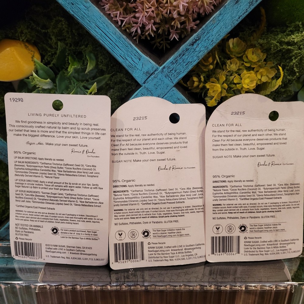2x Raw Sugar Lip Love Almond Milk & Agave Sensitive Skin Soothing Balm 1x Pineapple Coconut Marqui berry lip balm & bonus mini lip scrub BRAND NEW & SEALED **Packaging may have flaws and/or CVS stickers About this itemOrganic Ingredients: Made with natural and organic ingredients for a gentle and nourishing lip balmCruelty-Free: Free of animal products and cruelty-free for a vegan lip balmSulfate-Free: Does not contain sulfates for a gentle and moisturizing lip balmNatural Flavor: Contains a refreshing lemon flavor for a zesty lip balmAll Skin Types: Suitable for all skin types and conditions for a moisturizing lip balm